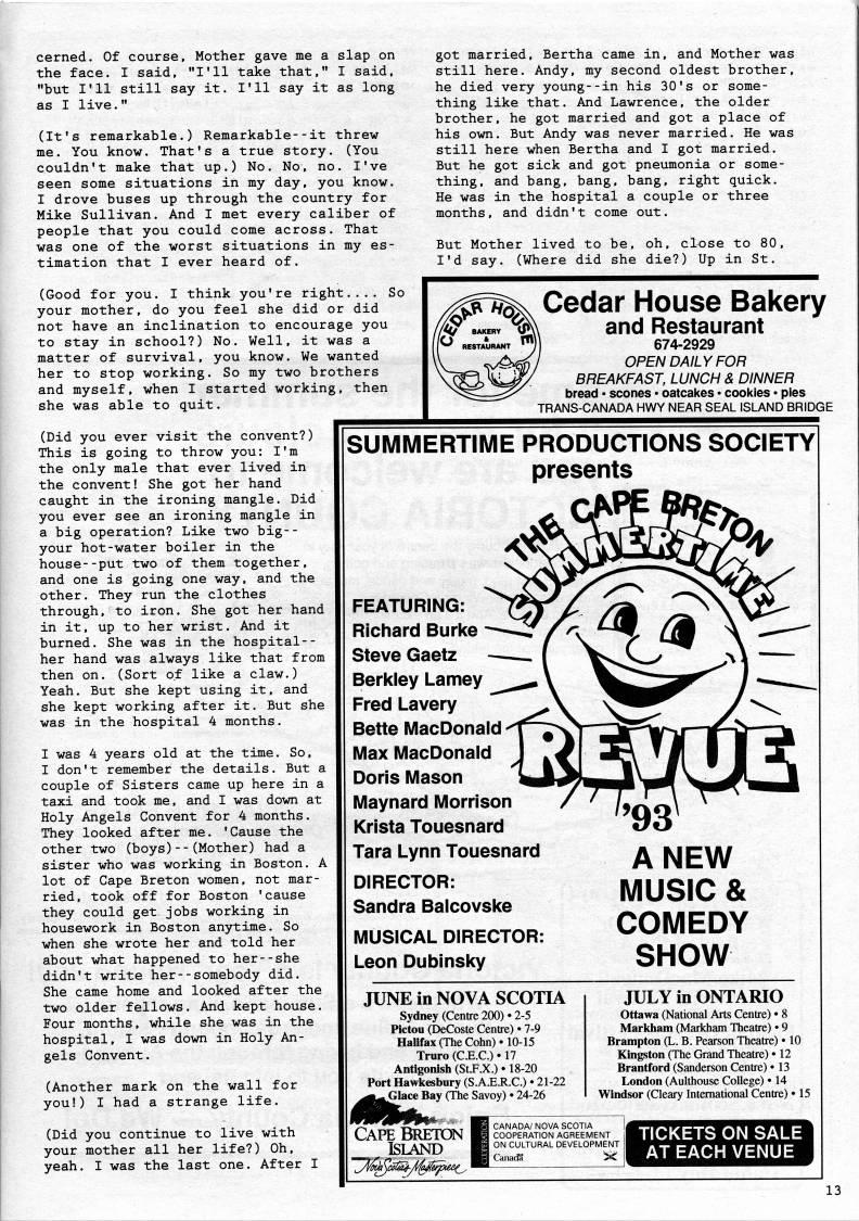 cerned. Of course. Mother gave me a slap on the face. I said, "I'll take that," I said, "but I'll still say it. I'll say it as long as I live." (It's remarkable.) Remarkable--it threw me. You know. That's a true story. (You couldn't make that up.) No. No, no. I've seen some situations in my day, you know. I drove buses up through the country for Mike Sullivan. And I met every caliber of people that you could come across. That was one of the worst situations in my es? timation that I ever heard of. (Good for you. I think you're right.... So your mother, do you feel she did or did not have an inclination to encourage you to stay in school?) No. Well, it was a matter of survival, you know. We wanted her to stop working. So my two brothers and myself, when I started working, then she was able to quit. got married. Bertha came in, and Mother was still here. Andy, my second oldest brother, he died very young--in his 30's or some? thing like that. And Lawrence, the older brother, he got married and got a place of his own. But Andy was never married. He was still here when Bertha and I got married. But he got sick and got pneumonia or some? thing, and bang, bang, bang, right quick. He was in the hospital a couple or three months, and didn't come out. But Mother lived to be, oh, close to 80, I'd say. (Where did she die?) Up in St. (Did you ever visit the convent?) This is going to throw you: I'm the only male that ever lived in the convent! She got her hand caught in the ironing mangle. Did you ever see an ironing mangle in a big operation? Like two big-- your hot-water boiler in the house--put two of them together, and one is going one way, and the other. They run the clothes through, to iron. She got her hand in it, up to her wrist. And it burned. She was in the hospital-- her hand was always like that from then on. (Sort of like a claw.) Yeah. But she kept using it, and she kept working after it. But she was in the hospital 4 months. I was 4 years old at the time. So, I don't remember the details. But a couple of Sisters came up here in a taxi and took me, and I was down at Holy Angels Convent for 4 months. They looked after me. 'Cause the other two (boys)--(Mother) had a sister who was working in Boston. A lot of Cape Breton women, not mar? ried, took off for Boston 'cause they could get jobs working in housework in Boston anytime. So when she wrote her and told her about what happened to her--she didn't write her--somebody did. She came home and looked after the two older fellows. And kept house. Four months, while she was in the hospital, I was down in Holy An? gels Convent. (Another mark on the wall for you!) I had a strange life. (Did you continue to live with your mother all her life?) Oh, yeah. I was the last one. After I Cedar House Bakery and Restaurant 674-2929 OPEN DAILY FOR BREAKFAST, LUNCH & DINNER bread • scones • oatcakes • cookies • pies TRANS-CANADA HWY NEAR SEAL ISLAND BRIDGE SUMMERTIME PRODUCTIONS SOCIETY presents FEATURING: Richard Burke Steve Gaetz Berkley Lamey Fred Lavery Bette MacDonald Max MacDonald Doris Mason Maynard Morrison Krista Touesnard Tara Lynn Touesnard DIRECTOR: Sandra Balcovske MUSICAL DIRECTOR: Leon Dubinsky ANEW MUSIC & COMEDY SHOW JUNE in NOVA SCOTIA Sydney (Centre 200) • 2-5 Pictou (DeCoste Centre) • 7-9 HaUfax (The Cohn) • 10-15 Truro (C.E.C.) • 17 Antigonish (St.F.X.) • 18-20 Port Hawkesbury (S.A.E.R.C.) • 21-22 -GlaceBay (TheSavoy) • 24-26 JULY in ONTARIO Ottawa (National Arts Centre) • 8 Marldiam (Markham Theatre) • 9 Brampton (L. B. Pearson Theatre) • 10 Kingston (The Grand Theatre) • 12 Brantford (Sanderson Centre) • 13 London (Aulthouse College) • 14 Windsor (Cleary International Centre) 'IS Cape Breton Island I CANADA/ NOVA SCOTIA COOPERATION AGREEMENT ON CULTURAL DEVELOPMENT j| Canada ~: TICKETS ON SALE AT EACH VENUE
