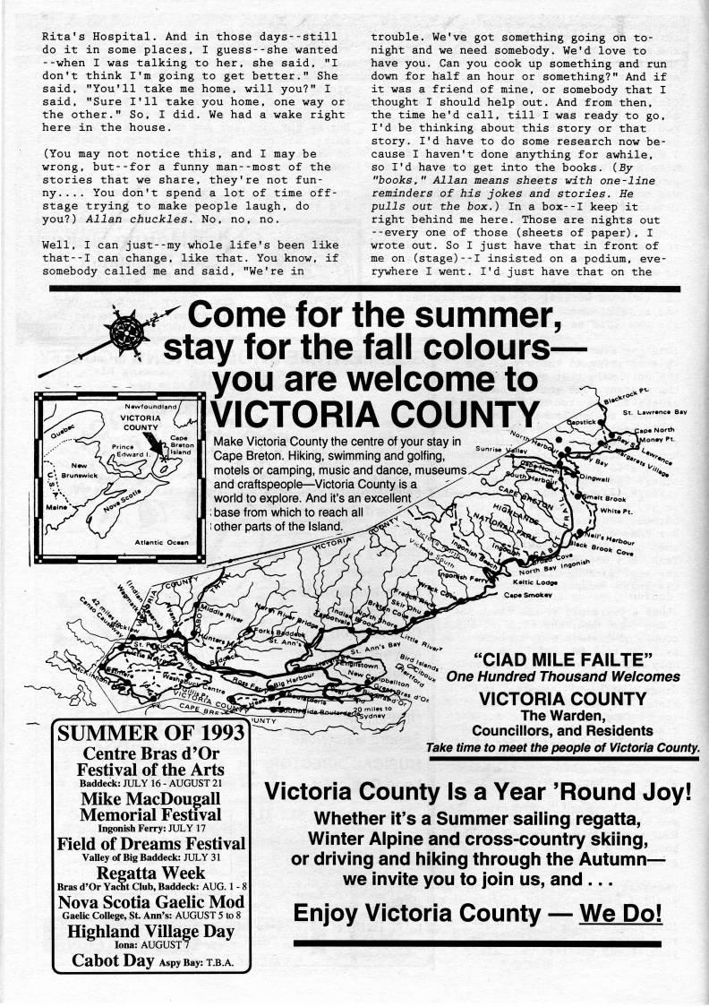 Rita's Hospital. And in those days--still do it in some places, I guess--she wanted --when I was talking to her, she said, "I don't think I'm going to get better." She said, "You'll take me home, will you?" I said, "Sure I'll take you home, one way or the other." So, I did. We had a wake right here in the house. (You may not notice this, and I may be wrong, but--for a funny man--most of the stories that we share, they're not fun? ny.... You don't spend a lot of time off? stage trying to make people laugh, do you?) Allan chuckles. No, no, no. Well, I can just--my whole life's been like that--I can change, like that. You know, if somebody called me and said, "We're in trouble. We've got something going on to? night and we need somebody. We'd love to have you. Can you cook up something and run down for half an hour or something?" And if it was a friend of mine, or somebody that I thought I should help out. And from then, the time he'd call, till I was ready to go, I'd be thinking about this story or that story. I'd have to do some research now be? cause I haven't done anything for awhile, so I'd have to get into the books. (By "books," Allan means sheets with one-line reminders of his jokes and stories. He pulls out the box.) In a box--I keep it right behind me here. Those are nights out --every one of those (sheets of paper), I wrote out. So I just have that in front of me on (stage)--I insisted on a podium, eve? rywhere I went. I'd just have that on the '' Come for the summer, '.'' stay for the fall colours • ' you are welcome to VICTORIA COUNTY Make Victoria County the centre of your stay in Cape Breton. Hil