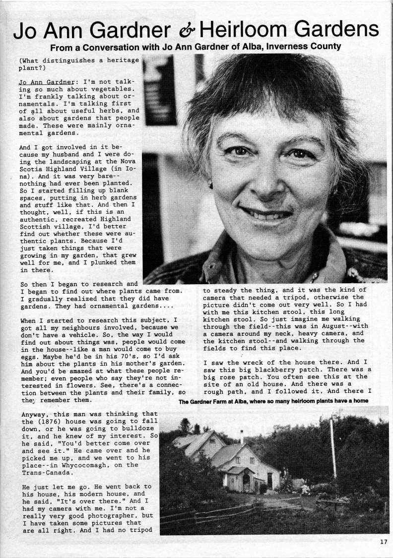 Jo Ann Gardner ef* Heirloom Gardens From a Conversation with Jo Ann Gardner of Alba, Inverness County (What distinguishes a heritage plant?) Jo Ann Gardner: I'm not talk? ing so much about vegetables. I'm frankly talking about or? namentals. I'm talking first of all about useful herbs, and also about gardens that people made. These were mainly orna? mental gardens. And I got involved in it be? cause my husband and I were do? ing the landscaping at the Nova Scotia Highland Village (in lo? na) . And it was very bare-- nothing had ever been planted. So I started filling up blank spaces, putting in herb gardens and stuff like that. And then I thought, well, if this is an authentic, recreated Highland Scottish village, I'd better find out whether these were au? thentic plants. Because I'd just taken things that were growing in my garden, that grew well for me, and I plunked them in there. So then I began to research and I began to find out where plants came from. I gradually realized that they did have gardens. They had ornamental gardens.... Vflien I started to research this subject, I got all my neighbours involved, because we don't have a vehicle. So, the way I would find out about things was, people would come in the house--like a man would come to buy eggs. Maybe he'd be in his 70's, so I'd ask him about the plants in his mother's garden. And you'd be amazed at what these people re? member; even people who say they're not in? terested in flowers. See, there's a connec? tion between the plants and their family, so the' remember them. An3rway, this man was thinking that the (1876) house was going to fall down, or he was going to bulldoze it, and he knew of my interest. So he said, "You'd better come over and see it." He came over and he picked me up, and we went to his place--in Whycocomagh, on the Trans-Canada. He just let me go. He went back to his house, his modern house, and he said, "It's over there." And I had my camera with me. I'm not a really very good photographer, but I have taken some pictures that are all right. And I had no tripod The to steady the thing, and it was the kind of camera that needed a tripod, otherwise the picture didn't come out very well. So I had with me this kitchen stool, this long kitchen stool. So just imagine me walking through the field--this was in August--with a camera around my neck, heavy camera, and the kitchen stool--and walking through the fields to find this place. I saw the wreck of the house there. And I saw this big blackberry patch. There was a big rose patch. You often see this at the site of an old house. And there was a rough path, and I followed it. And there I Gardner Farm at Alba, where so many heirloom plants have a home