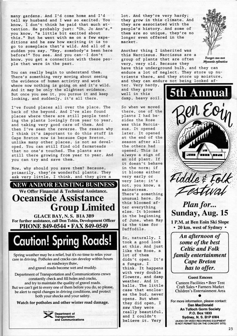 Published by Ronald Caplan on 1993/6/1 (305 reads)many gardens. And I'd come home and I'd tell my husband and I was so excited. You know, I don't think he paid that much at? tention. He probably just: "Oh, Jo Ann's," you know, "a little bit excited about this." But he went with me on a few expe? ditions and he saw how exciting it is to go to someplace that's wild. And all of a sudden you say, "Hey, somebody's been here before!" You see. And you can--I don't know, you get a connection with these peo? ple that were in the past. You can really begin to understand them. There's something very moving about seeing the evidence of human activity and work where now nothing is going on and it's wild. And it may be only the slightest evidence. But once you see it, you pursue it and keep looking, and suddenly, it's all there. I've found places all over the place. The back of the beyond. And I've also found places where there are still people tend? ing the plants lovingly from year to year, and taking very good care of them. And then I've seen the reverse. The reason why I think it's important to do this stuff in Cape Breton now is because Cape Breton, unlike many other places, is not as devel? oped. You can still find old farmsteads that no one's touched. The plants are still there growing from year to year. And you can try and save them. Now, why should you save them? Because, primarily, they're wonderful plants. They ask very little, I think, and they give a NEW AND/OR EXISTING BUSINESS We Offer Financial & Technical Assistance. Oceanside Assistance Group Limited GLACE BAY, N. S. BIA 3B9 For further assistance, call Don Tobin, Development Officer PHONE 849-0544 • FAX 849-0549 Spring weather may be a relief, but it's no time to relax your care in driving. Potholes and cracks can develop within hours as roadways thaw, and gravel roads become wet and muddy. Department of Transportation and Communications crews constantly check and fill holes and cracks, and try to maintain the quality of gravel roads. But we can't get to every one of them before you do, so please, be alert to rapid changes in driving conditions, and protect both your shocks and your safety. Watch for potholes and other winter road damage. Department of Transportation and Communications 5th Annual lot. And they're very hardy; they grow in this climate. And they are associated with the people's history. And some of them are so unique, they're no longer even offered in the market. Another thing I inherited was this Narcissus. Narcissus are a group of plants that are often very, very old. Because they have this underground bulb, and they can endure a lot of neglect. They store up nu? trients there, and they store up moisture, and they can endure not being looked af? ter. Very hardy, and they grow well in this damp, heavy soil. So when we moved there, one of the plants I had be? sides the Rose was this Narcis? sus . It opened later. It opened at the end of the season after all the others had opened. This is always a sign of an old plant. If it doesn't behave in the norm; if it blooms either very early or very late; it's not, you know, a mainstream. There's something unusual here. So this bloomed af? ter everything else. It bloomed in the beginning of June, when May is the time for Daffodils. So; naturally, I took a good look at this. And just like the Rose, a lot of them didn't open. It's a fungus, I think. It happens with very double flowers, and damp weather. And it balls. The little case that enclos? es the bud, never opens. But when they did open, I saw they were really beautiful, and I couldn't believe it. Very fuldUiJ'' Plan for... Sunday, Aug, 15 1 P.M. at Ben Eoin Ski Slope • 20 km. west of Sydney • An afternoon of some of the best Celtic and Folk family entertainment Cape Breton has to offer. Guest Emcees Canteen Facilities • Beer Tent Craft Sales • Farmers Market Children's Entertainment Area • For more information, please contact: Dan MacDonald An Tulloch Gorm Society P.O. Box 1833 Sydney, N.S. B1P6W4 (AUDIO OB VIDEO RECORDING EQUIPMENT IS NOT PERMITTED ON THE CONCERT SITE)