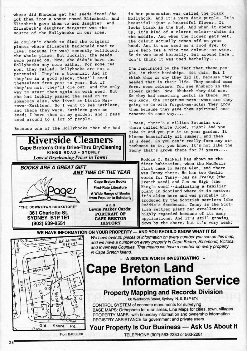 Published by Ronald Caplan on 1993/6/1 (324 reads)where did Rhodena get her seeds from? She got them from a woman named Elizabeth. And Elizabeth gave them to her daughter. And Elizabeth's daughter Margaret was the source of the Hollyhocks in our area. We couldn't check to find the original plants where Elizabeth MacDonald used to live. Because (it was) recently bulldozed, the whole place. But luckily, the seeds were passed on. Now, she didn't have the Hollyhocks any more either. For some rea? son, they failed. Hollyhocks are not a perennial. They're a biennial. And if they're in a good place, they'll seed themselves from year to year. But if they're not, they'll die out. And the only way to start them again is with seed. But she had luckily passed the seed on to somebody else, who lived at Little Nar? rows- -Kathleen . So I went to see Kathleen, and there they were. Kathleen gave me seed; I have them in my garden; and I pass seed around to a lot of people. Because one of the Hollyhocks that she had Riverside Cleaners Cape Breton's Only Drive-Thru DryCleaning KINGS ROAD • SYDNEY Lowest Drycleaning Prices in Town! in her possession was called the Black Hollyhock. And it's very dark purple. It's beautiful--just a beautiful flower. It looks black in the bud. And when it opens up, it's kind of a claret colour--white in the middle. And when the flower gets wet, the colour actually comes off on your hand. And it was used as a food dye, to give herb tea a nice tea colour--or wine. So it was used herbally. But around here I don't think it was used herbally.... I'm fascinated by the fact that these peo? ple, in their hardships, did this. But I think this is why they did it. Because they needed that in their life. They needed some form, some release. You see Rhubarb in the flower garden. Now, Rhubarb they did use. So they had something useful in there. But you know, the Forget-me-nots--what are they going to do with Forget-me-nots? They grow them because they gave them spiritual sus? tenance in some way.... I mean, there's a zillion Petunias out there called White Cloud, right? And you take it and you put it in your garden. It blooms beautifully all summer, and then it's dead. So you can't really form any at? tachment to it, you know. It's not like the Peony that's grown there for 75 years.... BOOKS ARE A GREAT GIFT ANY TIME OF THE YEAR Cape Breton Books First-Rate Literature A Wide Range of Books from Popular to Scholarly "THE DOWNTOWN BOOKSTORE" 361 Charlotte St. SYDNEY B1P1E1 (902) 539-8551 and Lewis Parker Cards: PORTRAIT OF CAPE BRETON HISTORY Roddie C. MacNeil has shown me the first habitation, when the MacNeils first came to Barra Glen, and there was Tansy there. He has two Gaelic words for Tansy--Lus na Fraing (the French weed) and Lus an Righ (the King's weed)--indicating a familiar plant in Scotland where it is native; it's alien here and was probably in? troduced by the Scottish settlers like Roddie's forebears. Tansy is the Scot? tish settler plant par excellence, highly regarded because of its many applications. And it's still growing down by the shore, but it's very weak; WE HAVE INFORMATION ON YOUR PROPERTY • AND YOU SHOULD KNOW WHAT IT IS! We have over 20 pieces of information on every number you see on this map, and we have a number on every property in Cape Breton, Richmond, Victoria, and Inverness Counties. That means we have a number on every property in Cape Breton Island. ~ A SERVICE WORTH INVESTIGATING ~ Cape Breton Land Information Service Property l/lapping and Records Division 66 Wentworth Street, Sydney, N. S. BI P 614 CONTROL SYSTEM of concrete monuments for surveying BASE MAPS: Orthophoto for rural areas, Line Maps for cities, town, villages PROPERTY MAPS with boundary information and ownership information REGISTRY ASSISTANCE for government and private users Your Property is Our Business • Ask Us About It TELEPHONE (902) 563-2280 or 563-2281 From BADDECK
