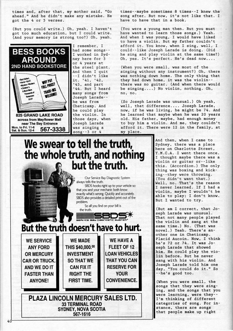 Published by Ronald Caplan on 1993/6/1 (283 reads)times and, after that, my mother said, "Go ahead." And he didn't make any mistake. He got the 4 or 5 verses. (But you could write.) Oh, yeah. I haven't got too much education, but I could write. (And your memory is strong too?) Oh, yeah. BESS BOOKS AROUND 2ND HAND BOOKSTORE 825 GRAND LAKE ROAD across from Mayflower Mall near The Bay Entrance Mon.toFrL 11-6 CC7 OOOO Sat. & Sun. 12-4 OOi-OOOO I remember, I had some songs-- I worked in Syd? ney here for 3 or 4 years at the steel plant. And then I quit --I didn't like it. '41, '42, '43, and part '44. But I heard many songs from Joseph Larade-- he was from Cheticamp. And he could play the violin. In those days, when Joseph Larade was singing a song--3 or 4 times--maybe sometimes 8 times--I knew the song after. But now, it's not like that. I have to have that in a book. (You were a young man then. But you must have wanted to learn those songs.) Yeah. And when I was young, I would have liked to have a violin. But my father couldn't afford it. You know, when I sing, well, I could--like Joseph Larade is doing. (Did he sing and play violin at the same time?) Oh, yes. It's perfect. He's dead now.... (When you were small, was most of the singing without any instrument?) Oh, there was nothing down home. The only thing that they had down home, it was the violin-- there was no guitar. (And when there would be singing....) No violin, nothing. Oh, no, no. (So Joseph Larade was unusual.) Oh yeah, well, that difference.... Joseph Larade, now, if he was living, he might be 74. And he learned that maybe when he was 20 years old. His father, maybe, had enough money to buy him a violin. And me, they couldn't afford it. There were 12 in the family, at my place. We swear to tell the truth, the whole truth, and nothing but the truth. Our Service Bay Diagnostic System always tells the truth, SBDS hooks right up to your vehicle so that you and your mechanic both know exactly what's wrong. Quickly and accurately. SBDS also provides a detailed print-out of the problem. So all you find on your bill is the tmth. But the tmth doesn't have to hurt. WE SERVICE ANY FORD OR MERCURY CAR OR TRUCK. AND WE DO IT FASTER THAN ANYONE! 1 WE MADE THIS $40,000.00 INVESTMENT SO THAT WE CAN FIX IT RIGHT THE FIRST TIME. 1 WE HAVE A FLEET OF 12 LOAN VEHICLES THAT YOU CAN RESERVE FOR YOUR CONVENIENCE. 1 PLAZA LINCOLN MERCURY SALES LTD. 1 33 TERMINAL ROAD SYDNEY, NOVA SCOTIA 1 567-1616 1 And then, when I came to Sydney, there was a place here on Charlotte Street, Y.M.C.A. I went there once. I thought maybe there was a violin or guitar or--like this. (Accordion.) The only thing was boxing and kick? ing- -they were throwing. (You didn't want that.) Well, no. That's the reason I never learned. If I had a violin, maybe I wouldn't be able to play; I don't know. But I wanted to try. (But am I correct, that Jo? seph Larade was unusual. That not many people played the violin and sang at the same time.) No. (That was novel.) Yeah. There's an? other one in Cheticamp. Placid Aucoin. Now, I think he's 72 or 74. It was Jo? seph Larade that showed him. He could play the vio? lin before. But he never sang with his violin. And Joseph Larade told him one day, "You could do it." So --he's good too. (When you were small, the songs that they were sing? ing, and the songs that you were learning, were they-- I'm thinking of different categories of song. For in? stance, there are songs that people make up right