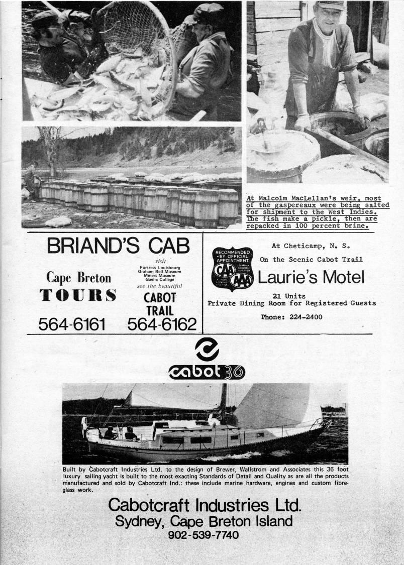 Published by Ronald Caplan on 1976/8/1 (658 reads)Ihe fish make a pickle, then are repacked in 100 percent brineT BRIAND'S CAB Cape Breton TOURS Fortress Louisbourg Graham Bell Museum Miners Museum Gaelic College lee the beautiful CABOT TRAIL 564-6161 564-6162 At Cheticamp, N. S, On the Scenic Cabot Trail Laurie's Motel 21 Units Private Dining Room for Registered Guests Phone: 224-2400 Built by Cabotcraft Industries Ltd. to the design of Brewer, Wallstrom and Associates this 36 foot luxury sailing yacht is built to the most exacting Standards of Detail and Quality as are all the products rrianufactured and sold by Cabotcraft Ind.: these include marine hardware, engines and custom fibre- glass work. Cabotcraft Industries Ltd. Sydney, C>ape Breton Island 902-539-7740