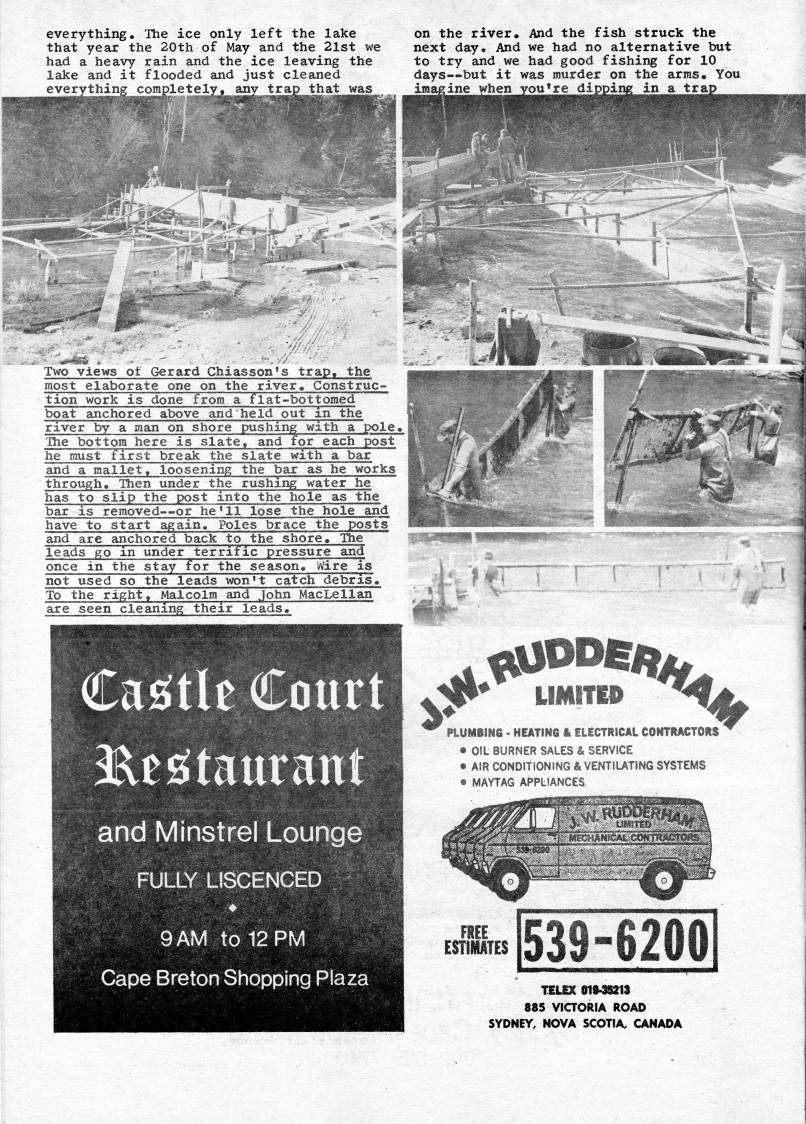 Published by Ronald Caplan on 1976/8/1 (497 reads)everything. The ice only left the lake that year the 20th of May and the 2lst we had a heavy rain and the ice leaving the lake and it flooded and just cleaned ything completely, jmy trap that on the river. And the fish struck the next day. And we had no alternative but to try and we had good fishing for 10 days • but it was murder on the arms. You imagine when you're dipping in a tr 1 - .1' js ot Gerard Chiasson's trap, the most elaborate one on the river. Construc? tion work is done from a flat-bottomed boat anchored above and held out in "the river by a man on shore pushing with a pole. The bottom here is slate, and for each jjost he must first break the slate with a bar and a mallet, loosening the bar as he works through. Then under the rushing water he has to slip the post into the hole as the bar is removed • or he'll lose the hole and have to start again, Poles brace the posts and are anchored back to the shore. The leads go in under terrific pressure and once in the stay for the season. Wire is not used so the leads won't catch debris. To the right, Malcolm and John MacLellan are seen cleaning their leads. Cattle Court i'tsitaurant and Minstrel Lounge FULLY LISCENCED QAM to12PM Cape Breton Shopping Plaza #? • ''' LIMITED ''' ' PLUMBING - HEATING t> ELECTRICAL CONTRACTORS ' • OIL BURNER SALES & SERVICE • AIR CONDITIONING & VENTIUTING SYSTEMS • MAYTAG APPLIANCES FREE ESTIMATES 539-6200 TELEX 019-39213 885 VICTORIA ROAD SYDNEY, NOVA SCOTIA, CANADA