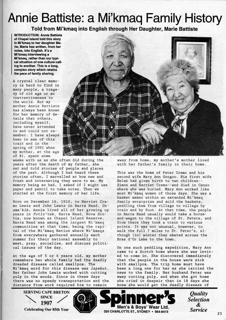 Annie Battiste: a Mi'kmaq Family History Told from Mi'kmaq into English through Her Daughter, Marie Battiste INTRODUCTION: Annie Battiste of Chapel Island told this story in Mi'kmaq to her daughter Ma? rie; Marie has written, from her notes, into English. It's a Mi'kmaq interviewing a Mi'kmaq, rather than our typi? cal situation of one culture call? ing to another. This is a long, complex story which retains the pace of family sharing. A crystal clear memo? ry is hard to find in many people, a trage? dy of old age or an inattentiveness to the world. But my mother Annie Battiste has always been known for her memory of de? tails that others, including myself, have never attended to and could not re? member. I have always been in awe of this trait and in the spring of 1992 when my mother, at the age of 81. spent some weeks with us as she often did during the years after the death of my father, she sat and told stories of people and places of the past. Although I had heard these stories often, I marvelled at how new and fresh and interesting they were to me. My memory being so bad, I asked if I might use paper and pencil to take notes. Then we started at the first memory of her life. Born on December 16, 1910, to Harriet Cre? mo Lewis and John Lewis in Barra Head, Un- ama'kik, Annie lived all of her growing up years in Potlo 'tek, Barra Head, Nova Sco? tia, now known as Chapel Island Reserve. Barra Head was among the largest Mi'kmaq communities at that time, being the capi? tal of the Mi'kmaq Nation where Mi'kmaqs from everywhere gathered annually each summer for their national assembly to meet, pray, socialize, and discuss politi? cal issues of the day. At the age of 5 or 6 years old, my mother remembers her whole family had the deadly dreaded disease called smallpox. The Mi'kmaq word for this disease was lapekut. Her father John Lewis worked with cutting pulp in the woods. Since in these days there was no speedy transportation and the distance from work required him to remain away from home, my mother's mother lived with her father's family in their home. This was the home of Peter Cremo and his second wife Mary Ann Googoo. His first wife Helen had given birth to two children-- Simon and Harriet Cremo--and died in Canso where she was buried. Mary Ann worked like most Mi'kmaq women of those days. She was a basket maker within an extended Mi'kmaq family enterprise and sold the baskets, peddling them from village to village by train and by foot. At that time, the people in Barra Head usually would take a horse- and-wagon to the village of St. Peters, and from there they took a train to various points. It was not unusual, however, to walk the full 7 miles to St. Peter's, al? though (in) winter they skated across the Bras d'Or Lake to the town. On one such peddling expedition, Mary Ann came to a Scotch home where she was invit? ed to come in. She discovered immediately that the people in the house were sick with smallpox. The trip home must have been a long one for her as she carried the news to the family. Her husband Peter was away cutting pulp, and when she got home she cried in despair that in 18 days she knew she would get the deadly disease of SERVING CAPE BRETON N. SINCE ' 1907 Celebrating Our 85th Year Spinner' ?? Men's & Boys' Wear Ltd. 320 CHARLOTTE ST., SYDNEY • 564-8415 Quality Selection & Service