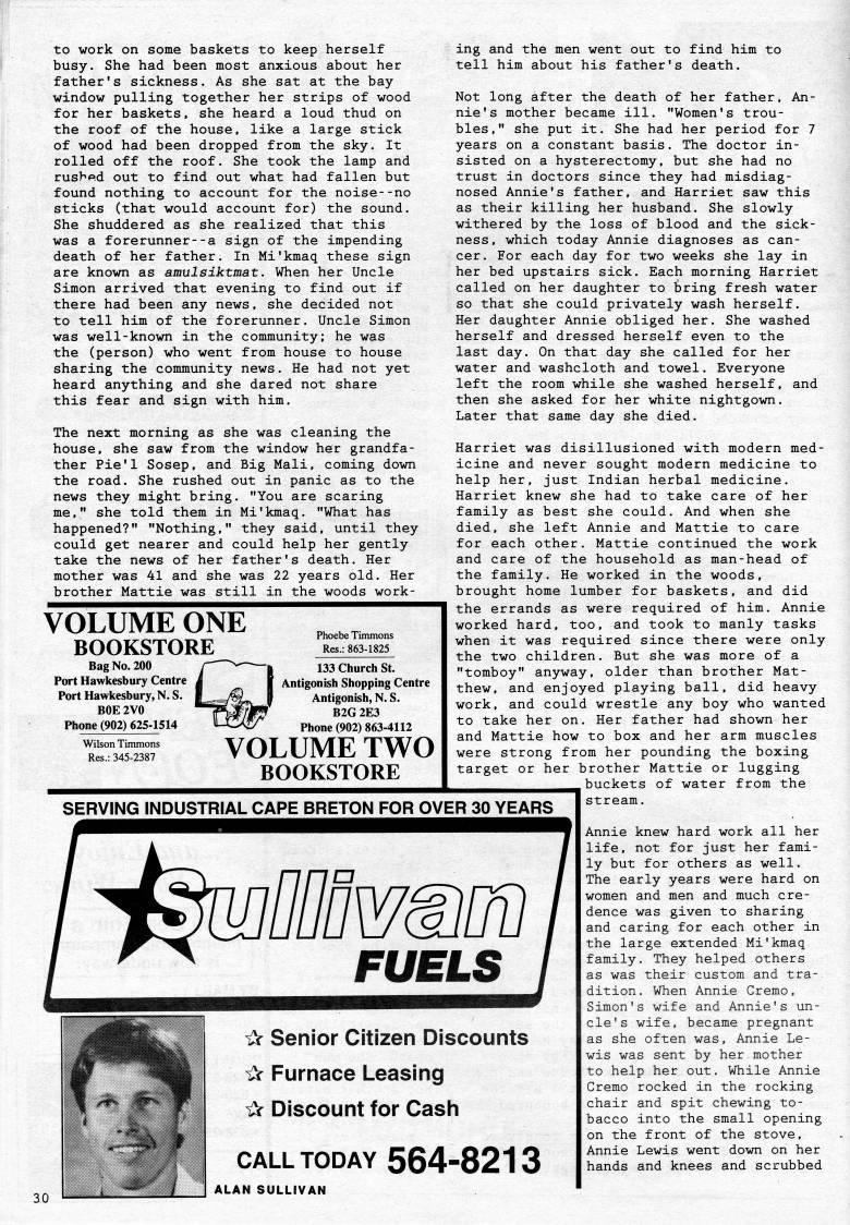 to work on some baskets to keep herself busy. She had been most anxious about her father's sickness. As she sat at the bay window pulling together her strips of wood for her baskets, she heard a loud thud on the roof of the house, like a large stick of wood had been dropped from the sky. It rolled off the roof. She took the lamp and rushp.d out to find out what had fallen but found nothing to account for the noise--no sticks (that would account for) the sound. She shuddered as she realized that this was a forerunner--a sign of the impending death of her father. In Mi'kmaq these sign are known as amulsiktmat. When her Uncle Simon arrived that evening to find out if there had been any news, she decided not to tell him of the forerunner. Uncle Simon was well-known in the community; he was the (person) who went from house to house sharing the community news. He had not yet heard anything and she dared not share this fear and sign with him. The next morning as she was cleaning the house, she saw from the window her grandfa? ther Pie'l Sosep, and Big Mali, coming down the road. She rushed out in panic as to the news they might bring. "You are scaring me," she told them in Mi'kmaq. "What has happened?" "Nothing," they said, until they could get nearer and could help her gently take the news of her father's death. Her mother was 41 and she was 22 years old. Her brother Mattie was still in the woods work- VOLUME ONE BOOKSTORE Bag No. 200 Port Hawkesbury Centre Port Hawkesbury, N. S. BOE 2V0 Phone (902) 625-1514 Phoebe Timmons Res.: 863-1825 Wilson Timmons Res.: 345-2387 133 Church St. Antigonish Shopping Centre Antigonish, N. S. B2G 2E3 Phone (902) 863-4112 VOLUME TWO BOOKSTORE SERVING INDUSTRIAL CAPE BRETON FOR OVER 30 YEARS ing and the men went out to find him to tell him about his father's death. Not long after the death of her father. An? nie's mother became ill. "Women's trou? bles," she put it. She had her period for 7 years on a constant basis. The doctor in? sisted on a hysterectomy, but she had no trust in doctors since they had misdiag? nosed Annie's father, and Harriet saw this as their killing her husband. She slowly withered by the loss of blood and the sick? ness, which today Annie diagnoses as can? cer. For each day for two weeks she lay in her bed upstairs sick. Each morning Harriet called on her daughter to bring fresh water so that she could privately wash herself. Her daughter Annie obliged her. She washed herself and dressed herself even to the last day. On that day she called for her water and washcloth and towel. Everyone left the room while she washed herself, and then she asked for her white nightgown. Later that same day she died. Harriet was disillusioned with modern med? icine and never sought modern medicine to help her, just Indian herbal medicine. Harriet knew she had to take care of her family as best she could. And when she died, she left Annie and Mattie to care for each other. Mattie continued the work and care of the household as man-head of the family. He worked in the woods, brought home lumber for baskets, and did the errands as were required of him. Annie worked hard, too, and took to manly tasks when it was required since there were only the two children. But she was more of a "tomboy" anyway, older than brother Mat? thew, and enjoyed playing ball, did heavy work, and could wrestle any boy who wanted to take her on. Her father had shown her and Mattie how to box and her arm muscles were strong from her pounding the boxing target or her brother Mattie or lugging buckets of water from the stream. m FUELS ' Senior Citizen Discounts 1' Furnace Leasing ik Discount for Casii CALL TODAY 564-8213 ALAN SULLIVAN Annie knew hard work all her life, not for just her fami? ly but for others as well. The early years were hard on women and men and much cre? dence was given to sharing and caring for each other in the large extended Mi'kmaq family. They helped others as was their custom and tra? dition. When Annie Cremo, Simon's wife and Annie's un? cle's wife, became pregnant as she often was, Annie Le? wis was sent by her mother to help her out. While Annie Cremo rocked in the rocking chair and spit chewing to? bacco into the small opening on the front of the stove, Annie Lewis went down on her hands and knees and scrubbed