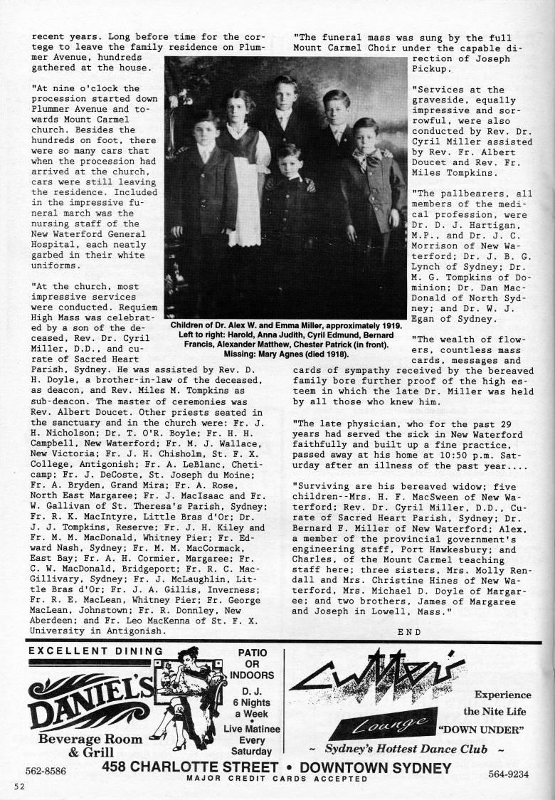 recent years. Long before time for the cor? tege to leave the family residence on Plum? mer Avenue, hundreds gathered at the house. "At nine o'clock the procession started down Plummer Avenue and to? wards Mount Carmel church. Besides the hundreds on foot, there were so many cars that when the procession had arrived at the church, cars were still leaving the residence. Included in the impressive fu? neral march was the nursing staff of the New Waterford General Hospital, each neatly garbed in their white uniforms. "At the church, most impressive services were conducted. Requiem High Mass was celebrat? ed by a son of the de? ceased. Rev. Dr. Cyril Miller, D.D., and cu? rate of Sacred Heart Parish, Sydney. He was assisted by Rev. D. H. Doyle, a brother-in-law of the deceased, as deacon, and Rev. Miles M. Tompkins as sub-deacon. The master of ceremonies was Rev. Albert Doucet. Other priests seated in the sanctuary and in the church were: Fr. J. H. Nicholson; Dr. T. O'R. Boyle; Fr. H. H. Campbell, New Waterford; Fr. M. J. Wallace, New Victoria; Fr. J. H. Chisholm, St. F. X. College, Antigonish; Fr. A. LeBlanc, Cheti? camp; Fr. J. DeCoste, St. Joseph du Moine; Fr. A. Bryden. Grand Mira; Fr. A. Rose, North East Margaree; Fr. J. Maclsaac and Fr. W. Gallivan of St. Theresa's Parish, Sydney; Fr. R. K. Maclntyre, Little Bras d'Or; Dr. J. J. Tompkins, Reserve; Fr. J. H. Kiley and Fr. M. M. MacDonald, Whitney Pier; Fr. Ed? ward Nash, Sydney; Fr. M. M. MacCormack, East Bay; Fr. A. H. Cormier. Margaree; Fr. C. W. MacDonald. Bridgeport; Fr. R. C. Mac- Gillivary, Sydney; Fr. J. McLaughlin, Lit? tle Bras d'Or; Fr. J. A. Gillis, Inverness; Fr. R. E. MacLean. Whitney Pier; Fr. George MacLean, Johnstown; Fr. R. Donnley, New Aberdeen; and Fr. Leo MacKenna of St. F. X. University in Antigonish. Children of Dr. Alex W. and Emma Miller, approximately 1919. Left to right: Harold, Anna Judith, Cyril Edmund, Bernard Francis, Alexander Matthew, Chester Patrick (in front). Missing: Mary Agnes (died 1918). "The funeral mass was sung by the full Mount Carmel Choir under the capable di? rection of Joseph Pickup. "Services at the graveside, equally impressive and sor? rowful, were also conducted by Rev. Dr. Cyril Miller assisted by Rev. Fr. Albert Doucet and Rev. Fr. ' Miles Tompkins. "The pallbearers, all , • members of the medi? cal profession, were Dr. D. J. Hartigan. M.P., and Dr. J. C. Morrison of New Wa? terford; Dr. J. B. G. Lynch of Sydney; Dr. M. G. Tompkins of Do? minion; Dr. Dan Mac? Donald of North Syd? ney; and Dr. W. J. Egan of Sydney. "The wealth of flow? ers, countless mass cards, messages and cards of sympathy received by the bereaved family bore further proof of the high es? teem in which the late Dr. Miller was held by all those who knew him. "The late physician, who for the past 29 years had served the sick in New Waterford faithfully and built up a fine practice, passed away at his home at 10:50 p.m. Sat? urday after an illness of the past year.... "Surviving are his bereaved widow; five children--Mrs. H. F. MacSween of New Wa? terford; Rev. Dr. Cyril Miller, D.D., Cu? rate of Sacred Heart Parish, Sydney; Dr. Bernard F. Miller of New Waterford; Alex, a member of the provincial government's engineering staff. Port Hawkesbury; and Charles, of the Mount Carmel teaching staff here; three sisters. Mrs. Molly Ren- dall and Mrs. Christine Hines of New Wa? terford, Mrs. Michael D. Doyle of Margar? ee; and two brothers, James of Margaree and Joseph in Lowell, Mass." END EXCELLENT DININ PATIO OR INDOORS Beverage Room & Grill 562-8586 D.J. 6 Nights a Week • Live Matinee Every Saturday 458 CHARLOTTE STREET • DOWNTOWN SYDNEY MAJOR CREDIT CARDS ACCEPTED Experience the Nite Life DOWN UNDER" ~ Sydney's Hottest Dance Club ~ 564-9234
