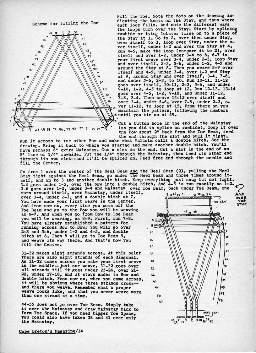 Published by Ronald Caplan on 1973/1/1 (6352 reads)Scheme for filling the Toe Fill the Toe. Note the dots on the drawing in? dicating the knots on the Stay, and thus where each loop falls. And note the different ways the loops turn over the Stay. Start by splicing rawhide or tying lobster twine on to a piece of the Stay at 1. Go to 2, over then under Stay, over itself to 3, loop over Stay, under the o- ver itself, under 1-2 and over the Stay at 4. Run 4-5, make the loop (compare it to 2), over itself and over 1-2, under 3-4 to 6. 6-7 is your first weave over 3-4, under 2-3, loop Stay and over itself, 2-3, 5-6, under 1-2, 4-5 and around the Stay at 8, Then you weave 8-9 over itself and 4-5, under 3-4, over 1-2 and Stay at 9, around Stay and over itself, 3-4, 7-8, and under 5-6, 2-3, to 10. Run 10-11. 11-12 goes over itself, 10-11, 2-3, 5-6, and under 9-10, 1-2, 4-5 to loop at 12. Run 12-13. 13-14 goes over 4-5, 1-2, 9-10, and under 11-12, 7-8, 3-4. Then weave 14-15 over itself and over 3-4, under 5-6, over 7-8, under 2-3, o- ver 11-12, to loop at 15. From there on you maintain the pattern, following the numbers 8 until you tie on at 49. Cut a button hole in the end of the Mainstay (as you did to splice on rawhide), loop it oyer the Bow about 2" back from the Toe Beam, feed the end through the slot and pull it tight. Run It across to tne other Bow and make what Malcolm calls a double hitch. See the drawing. Bring it back to where you started and make another double hitch. You'll have perhaps 6" extra Mainstay. Cut a slot in the end. Cut a slot in the end of an 8' lace of 1/4" rawhide. Put the 1/4" through the Mainstay, then feed its other end through its own slot • and it'll be spliced on. Feed free end through the needle and fill the Center. 2' 28 3t '*o 4fe.H' 43 38 30aa.Hlfe TOE STAY AND -roe STAt Go from 1 over the center of the Heel Beam and the Heel Stay (2), pulling the Heel Stay tight against the Heel Beam, go tinder the Heel Beam.and three times around it? self, and on to 3 and another double hitch. Keep everything just snug but not tight. 3-4 goes under 1-2, over the bow into a doublfe hitch. And 4-5 is run exactly as 1-2. '' 5-6 goes over 1-2, under 3-4 and Mainstay over Toe Beam, back under Toe Beam, one 'O turn around itself, over Mainstay, under itself, . ,r • . C over 3-4, under 2-3, and a double hitch at 7. You have made your first weave in the Center. And from now on, every time you come off the Toe Beam and go to the Bow you will be weaving as 6-7. And when you go from Bow to Toe Beam you will be weaving, as 8-9. First, run 7-8. You have already established a pattern for running across Bow to Bow: You will go over 2-3 and 5-6, under 1-2 and 4-5, and double hitch at 8. Then 8 will go to Toe Beam 9, and weave its way there. And that's how you fill the Center. 31-32 makes eight strands across. At this point there are also eight strands of each diagonal. As 31-32 comes across you make your first weave in the middle • just one weave, 31-32 goes over all strands till it goes under 25-26, over 21- 22, under 17-18, and it stays under to Bow and double hitch. From now on, when you come across. It will be obvious where three strands cross • and there you weave. Remember what a proper weave looks like, and that you never weave more than one strand at a time. 44-55 does not go over Toe Beam. Simply take It over the Mainstay and draw Mainstay back to torm Toe Space. If you need bigger Toe Space, you could also have taken 38 and 41 over only the Mainstay. Cape Breton's Magazine/l4