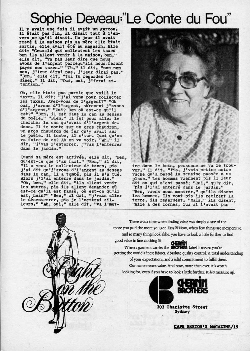 Published by Ronald Caplan on 1976/8/1 (380 reads)Sophie Deveau="Le Conte du Fou" II y avait une fois il avait un garcon. II etait pas fin, il disait tout si l*en- vers ce qu'il disait. Un jour il avait rest' a la raaison pis sa raere eile etait sortie, eile avait et' au magasin. Eile dit: "Ceux-la qui collectent les taxes ben ils allont venir it la maison, ben," eile dit, "va pas leur dire que nous avons de 1?argent parcequ'ils nous feront payer nos taxes." "Oh," il dit, "non non non, j'leur dirai pas, j'leur dirai pas." "Ben," eile dit, "toi tu regardes le diner." II dit, "Oui, oui, j'ferai at? tention." CSi, eile etait pas partie que voila le taxer. II dit: "J*ai venu pour collecter les taxes. Avez-vous de 1??argent?" "Oh oui, j?avons d'l'argent, surement j??avons d'l'argent." "Oui? Ben ovl est-ce qu'il est?" "Ben, il est dans la can au dessus du po'le." "Bien." II fut pour aller le chercher la can qu?avait d'l'argent de? dans. II te monte sur un gros chaudron, un gros chaudron de fer qu'y avait sur le poele. II tombe, il s'tue. Quoi qu'on va faire de ca? Ah on va voir. "Ah," il dit, "j'vas I'enterrer. J'vas I'enterrer dans le jardin." Quand sa mere est arrivee, eile dit, "Ben, qu'est-ce que t'as fait." "Ben," il dit, "II a venu le collecteur de taxes, pis j'ai dit qu'j'avons d'l'argent au dessus dans le can, il a tombe, pis il s'a tue. Alors j'l'ai enterre dans le jardin." "Oh, ben," eile dit, "ils allont venir les autres, pis ils allont deraander ou est-ce qu'il est passe, ou est-ce qu'il est, hein?" "Ben," il dit, "j'vais aller le desenterrer, pis je I'mettrai ail- leurs." "Ah, oui," eile dit, "va 1'met? tre dans le bois, personne ne va le trou? ver." II dit, "Pis, j'vais mettre notre vache qu'a pass4 la semaine passee a sa place." Les horames viennent pis il leur dit ca qui s'est passe: "Oui," qu'y dit, "pis j'l'ai enterre dans le jardin." "Ben, viens nous montrer," qu'ils disent les homraes. lis vont pis ils retirent la terre, ils regardent. "Mais," ils disent, "Eile a des comes, lui il 1??avait pas There was a time when finding value was simply a case of the more you paid the more you got. Easy ' Now, when few things are inexpensive, and so many things look alike, you have to look a little further to find good value in fine clothing 5' #1CB|In When a garment carries the BROnCRS label it means you're getting the world's finest fabrics. Absolute quality control. A total understanding of your expectations, and a solid commitment to fulfill them. Our name means value. And now, more than ever, it's worth looking for* even if you have to look a litde further. It does measure up. I OEMin 303 Charlotte Street Sydney CAPB BRETON'S MAGAZIWB/15