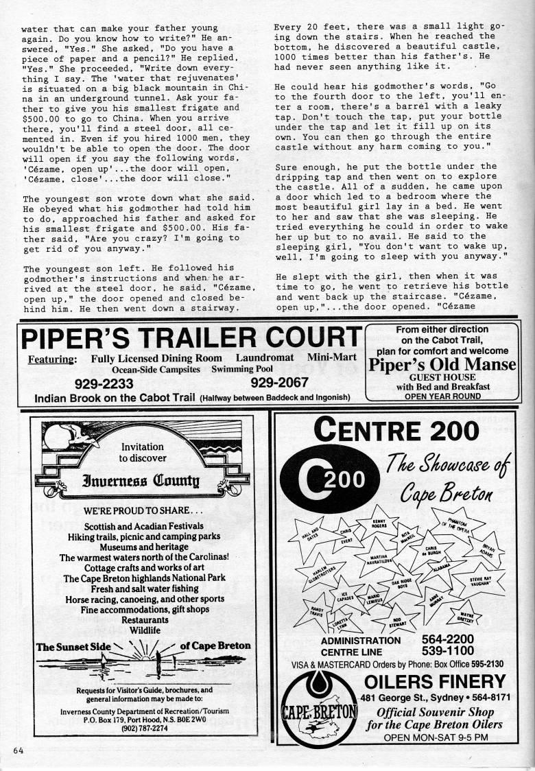 water that can make your father young again. Do you know how to write?" He an? swered. "Yes." She asked, "Do you have a piece of paper and a pencil?" He replied. "Yes." She proceeded, "Write down every? thing I say. The 'water that rejuvenates' is situated on a big black mountain in Chi? na in an underground tunnel. Ask your fa? ther to give you his smallest frigate and $500.00 to go to China. When you arrive there, you'll find a steel door, all ce? mented in. Even if you hired 1000 men, they wouldn't be able to open the door. The door will open if you say the following words, 'C'zame, open up'...the door will open, 'C'zame. close'...the door will close." The youngest son wrote down what she said. He obeyed what his godmother had told him to do. approached his father and asked for his smallest frigate and $500.00. His fa? ther said, "Are you crazy? I'm going to get rid of you anyway." The youngest son left. He followed his godmother's instructions and when, he ar? rived at the steel door, he said, "C6zame, open up." the door opened and closed be? hind him. He then went down a stairway. Every 20 feet, there was a small light go? ing down the stairs. When he reached the bottom, he discovered a beautiful castle, 1000 times better than his father's. He had never seen anything like it. He could hear his godmother's words, "Go to the fourth door to the left, you'll en? ter a room, there's a barrel with a leaky tap. Don't touch the tap, put your bottle under the tap and let it fill up on its own. You can then go through the entire castle without any harm coming to you." Sure enough, he put the bottle under the dripping tap and then went on to explore the castle. All of a sudden, he came upon a door which led to a bedroom where the most beautiful girl lay in a bed. He went to her and saw that she was sleeping. He tried everything he could in order to wake her up but to no avail. He said to the sleeping girl. "You don't want to wake up. well. I'm going to sleep with you anyway." He slept with the girl, then when it was time to go. he went to retrieve his bottle and went back up the staircase. "C'zame. open up."...the door opened. "C'zame PIPER'S TRAILER COURT Featuring: Fully Licensed Dining Room Laundromat Mini-Mart Ocean-Side Campsites Swimming Pool 929-2233 929-2067 Indian Brook on the Cabot Trail (Halfway between Baddeck and Ingonish) From either direction on the Cabot Trail, plan for comfort and welcome Piper's Old Manse GUEST HOUSE with Bed and Breakfast OPEN YEAR ROUND > WE'RE PROUD TO SHARE... Scottish and Acadian Festivals Hiking trails, picnic and camping parks Museums and heritage The warmest waters north of the Carolinas! Cottage crafts and works of art The Cape Breton highlands National Park Fresh and salt water fishing Horse racing, canoeing, and other sports Fine accommodations, gift shops Restaurants Wildlife The Sunset Side of Cape Breton Requests for Visitor's Guide, brochures, and general information may be made to: Inverness County Department of Recreation/Tourism P.O. Box 179. Port Hood, N.S. BOE 2W0 (902)787-2274 Centre 200 200 ADMINISTRATION 564-2200 CENTRE LINE 539-1100 VISA&'MASTERCARD Orders by Phone: Box Office595-2130 OILERS FINERY 481 George St., Sydney • 564-8171 Official Souvenir Shop for the Cape Breton Oilers OPEN MON-SAT 9-5 PM