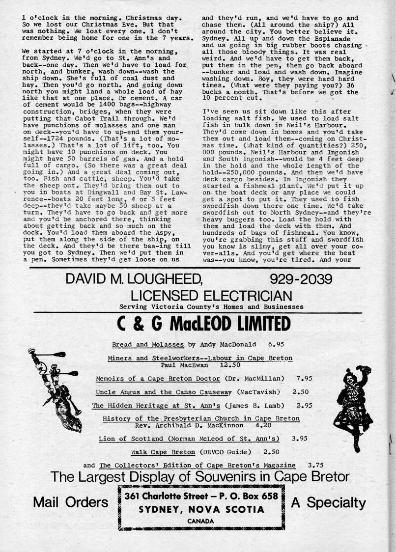 Published by Ronald Caplan on 1976/8/1 (412 reads)1 o'clock in the morning. Christmas day. So we lost our Christmas Eve. But that was nothing. We lost every one. I don't reraeraber being horae for one in the 7 years. We started at 7 o'clock in the morning, frora Sydney, We'd go to St. Ann's and back • one day. Then we'd have to load for north, and bunker, wash down • wash the ship down. She's full of coal dust and hay. Then you*d go north. And going down north you raight land a whole load of hay like that at one place. Or cement, A car of ceraent would be 1400 bags • highway construction, bridges, when they were putting that Cabot Trail through. We'd have punchions of molasses and one man on deck • you*d have to up-end thera your? self • 1724 pounds. (That's a lot of mo? lasses.) That's a lot of lift, too. You raight have 10 punchions on deck. You might have 50 barrels of gas. And a hold full of cargo, (So there was a great deal going in,) And a great deal coming out, too. Fish and cattle, sheep. You'd take the sheep out. They'd bring thera out to you in boats at Dingwall and Bay St. Law? rence • boats 20 feet long, 4 or'5 feet deep--they??d take maybe 50 sheep at a turn. Tliey'd have to go back and get more and you'd be anchored there, thinking about getting back and so much on the dock. You'd load them aboard the Aspy, put them along the side of the ship, on the deck. And they'd be there baa-ing till you got to Sydney. Then we'd put thera in a pen. Sometimes they'd get loose on us and they'd run, and we'd have to go and chase them. (All around the ship?) All around the city. You better believe it. Sydney. All up and down the Esplanade and us going in big rubber boots chasing all those bloody things. It was real weird. And we'd have to get thera back, put thera in the pen, then go back aboard • bunker and load and wash down. Imagine washing down. Boy, they were hard hard times. (What were they paying you?) 36 bucks a month. That's before we got the 10 percent cut. I've seen us sit down like this after loading salt fish. We used to load salt fish in bulk down in Neil's Harbour. Tliey'd come down in boxes and you'd take them out and load them • coming on Christ? mas time. (iVhat kind of quantities?) 250, 000 pounds. Neil's Harbour and Ingonish and South Ingonish • would be 4 feet deep in the hold and the whole length of the hold • 250,000 pounds. And then we'd have deck cargo besides. In Ingonish they started a fishmeal plant. We'd put it up on the boat deck or any place we could get a spot to put it. They used to fish swordfish do ''l there one time. We'd take swordfish out to North Sydney--and they're heavy buggers too. Load the hold with thera and load the deck with thera. And hundreds of bags of fishmeal. You know, you're grabbing this stuff and swordfish you know is slimy, get all over your co? ver-alls. And you'd get where the heat was • you know, you're tired. And your DAVID M.LOUGHEED, 929-2039 LICENSED ELECTRICIAN Serving Victoria County's Homes and Businesses C & G MadEOD LIMITED Bread and Molasses by Andy MacDonald 6.95 Miners and Steelworkers • Labour in Cape Breton Paul MacEwan 12.50 Meraoirs of a Cape Breton Doctor (Dr.- MacMillan) 7.95 Uncle Angus and the Canso Causeway (MacTavish) 2.50 The Hidden Heritage at St. Ann's (Jaraes B. Lamb) 2.95 Breton History of the Presbyterian Church in Cap Rev. Archibald D. MacKinnon 4.2 3.95 3.75 Lion of Scotland (Norman McLeod of St. Ann's) Walk Cape Breton (DEVCO Guide) 2.50 and The Collectors' Edition of Cape Breton's Magazine The Largest Display of Souvenirs in Cape Breton 361 charlotte Street - P. O. Box 658 SYDNEY, NOVA SCOTIA Mall Orders A Specialty