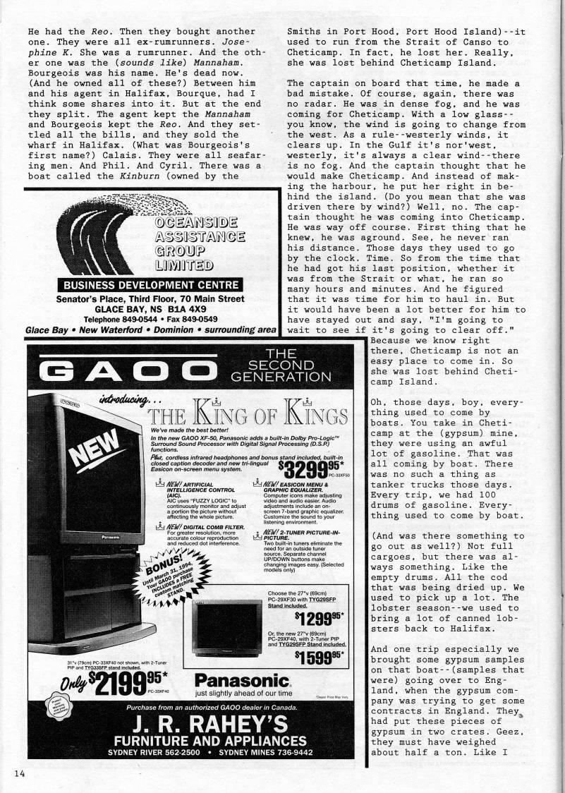 He had the Reo. Then they bought another one. They were all ex-rumrunners. Jose? phine K. She was a rumrunner. And the oth? er one was the (sounds like) Mannaham. Bourgeois was his name. He's dead now. (And he owned all of these?) Between him and his agent in Halifax, Bourque, had I think some shares into it. But at the end they split. The agent kept the Mannaham and Bourgeois kept the Reo. And they set? tled all the bills, and they sold the wharf in Halifax. (What was Bourgeois's first name?) Calais. They were all seafar? ing men. And Phil. And Cyril. There was a boat called the Kinburn (owned by the BUSINESS DEVELOPMENT CENTRE Senator's Place, Third Floor, 70 Main Street GLACE BAY, NS BIA 4X9 Telephone 849'544 • Fax 849-0549 Glace Bay • New Waterford • Dominion • surrounding & J. R. RAHEY'S FURNITURE AND APPLIANCES SYDNEY RIVER 562-2500 • SYDNEY MINES 736-9442 Smiths in Port Hood, Port Hood Island)--it used to run from the Strait of Canso to Cheticamp. In fact, he lost her. Really, she was lost behind Cheticamp Island. The captain on board that time, he made a bad mistake. Of course, again, there was no radar. He was in dense fog, and he was coming for Cheticamp. With a low glass-- you know, the wind is going to change from the west. As a rule--westerly winds, it clears up. In the Gulf it's nor'west, westerly, it's always a clear wind--there is no fog. And the captain thought that he would make Cheticamp. And instead of mak? ing the harbour, he put her right in be? hind the island. (Do you mean that she was driven there by wind?) Well, no. The cap? tain thought he was coming into Cheticamp. He was way off course. First thing that he knew, he was aground. See, he never ran his distance. Those days they used to go by the clock. Time. So from the time that he had got his last position, whether it was from the Strait or what, he ran so many hours and minutes. And he figured that it was time for him to haul in. But it would have been a lot better for him to have stayed out and say, "I'm going to wait to see if it's going to clear off." Because we know right there, Cheticamp is not an easy place to come in. So she was lost behind Cheti? camp Island. Oh, those days, boy, every? thing used to come by boats. You take in Cheti? camp at the (gypsum) mine, they were using an awful lot of gasoline. That was all coming by boat. There was no such a thing as tanker trucks those days. Every trip, we had 100 drums of gasoline. Every? thing used to come by boat. (And was there something to go out as well?) Not full cargoes, but there was al? ways something. Like the empty drums. All the cod that was being dried up. We used to pick up a lot. The lobster season--we used to bring a lot of canned lob? sters back to Halifax. And one trip especially we brought some gypsum samples on that boat--(samples that were) going over to Eng? land, when the gypsum com? pany was trying to get some contracts in England. They had put these pieces of gypsum in two crates. Geez, they must have weighed about half a ton. Like I il