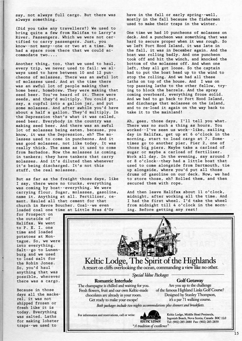 say, not always full cargo. But there was always something. (Did you take any travellers?) We used to bring quite a few from Halifax to Larry's River. Passengers. Which we were not cer? tified to carry passengers. Just, you know--not many--one or two at a time. We had a spare room there that we could ac? commodate two.... Another thing, too, that we used to haul, every trip, we never used to fail: we al? ways used to have between 10 and 12 pun? cheons of molasses. There was an awful lot of molasses used. And at the time there was an awful lot of people making that home beer, homebrew. They were making that seed beer. You've heard of it. There were seeds, and they'd multiply. You could put, say, a cupful into a gallon jar, and put some molasses. And after awhile you'd have about a half a gallon. They'd multiply. In the Depression that's what it was called, seed beer. Everybody in the country was making seed beer. And there was an awful lot of molasses being eaten, because, you know, it was the Depression, eh? The mo? lasses used to come in puncheons. And it was good molasses, not like today. It was really thick. The same as it used to come from Barbados. Now the molasses is coming in tankers; they have tankers that carry molasses. And it's diluted then whenever it's being discharged. It's not this stuff, the real molasses. But as far as the freight those days, like I say, there were no trucks, everything was coming by boat--everything. We were carrying flour. Sugar, molasses, gasoline, name it. Anything at all. Fertilizer, ce? ment. Hauled all that cement for that church in Havre Boucher. Coal--we even loaded coal one time at Little Bras d'Or for Prospect on the outside of Halifax. We went to P. E. I. one time and loaded potatoes at Mon? tague. So, we were into everything. Salt--go to Lunen? burg and we used to load salt for the Robin Jones. So, you'd haul anything that was possible, wherever there was a cargo. have in the fall or early spring--well, mostly in the fall because the fishermen used to make their traps in the winter. One time we had 10 puncheons of molasses on deck. And a puncheon was something that was hard to secure proper when it was rough. So we left Port Hood Island, it was late in the fall, it was in December again. And the boat was rolling badly. And one puncheon took off and hit the winch, and knocked the bottom of the molasses off. And when one left, they all got loose. So the captain had to put the boat head up to the wind to stop the rolling. And we had all these laths on top of the house. And I was on top passing laths to the other fellow, try? ing to block the barrels. And the spray coming overboard, everything froze solid. And we had to go back to Port Hood Island, and discharge that molasses on the island, and to re-load it again on the way back to take it to the mainland! Ah, geez, those days, I'll tell you what. There was no such a thing as hours. You worked--I've seen us work--like, sailing day in Halifax, get up at 6 o'clock in the morning, start to load cargo at 7. Some? times go to another pier. Pier 2, one of those big piers. Maybe take a carload of sugar or maybe a carload of fertilizer. Work all day. In the evening, say around 7 or 8 o'clock--they had a little boat that used to come alongside from Dartmouth, tie up alongside, where you'd put all those drums of gasoline on our deck. Now, we had to store those, eh? Rolled them, and then secured them with rope. And then leave Halifax about 11 o'clock, midnight, after working all the time. And I had the first wheel. I'd take the wheel from midnight till 4 o'clock in the morn? ing. Before getting any rest! Because in those days all the macke? rel, it was not shipped frozen or fresh like it is today. Everything was salted. Laths for making lobster traps--we used to Keltic Lodge, The Spirit of the Highlands A resort on cliffs overlooking the ocean, commanding a view like no other. Romantic Interlude The champagne is chilled and waiting for you. Fresh flowers, fruit and our own Keltic-made chocolates are already in your room. ('t ready to make your escape! Special hlue Packages Golf Getaway Are you up to the challenge of the famous Highland Links Golf Course? Designed by Stanley Thompson, it's a par 71 walking course. Boti) pacliages include two nights accommodations pliis dinners and brealifasts. For information and reservations, call or write: KELTIC IXDGK ".' tradition of excellence''' Keltic Lodge, Middle Head Peninsula, Ingonish Beach, Nova Scotia, Canada BOC ILO Tel: (902) 285-2880 Fax: (902) 285-2859