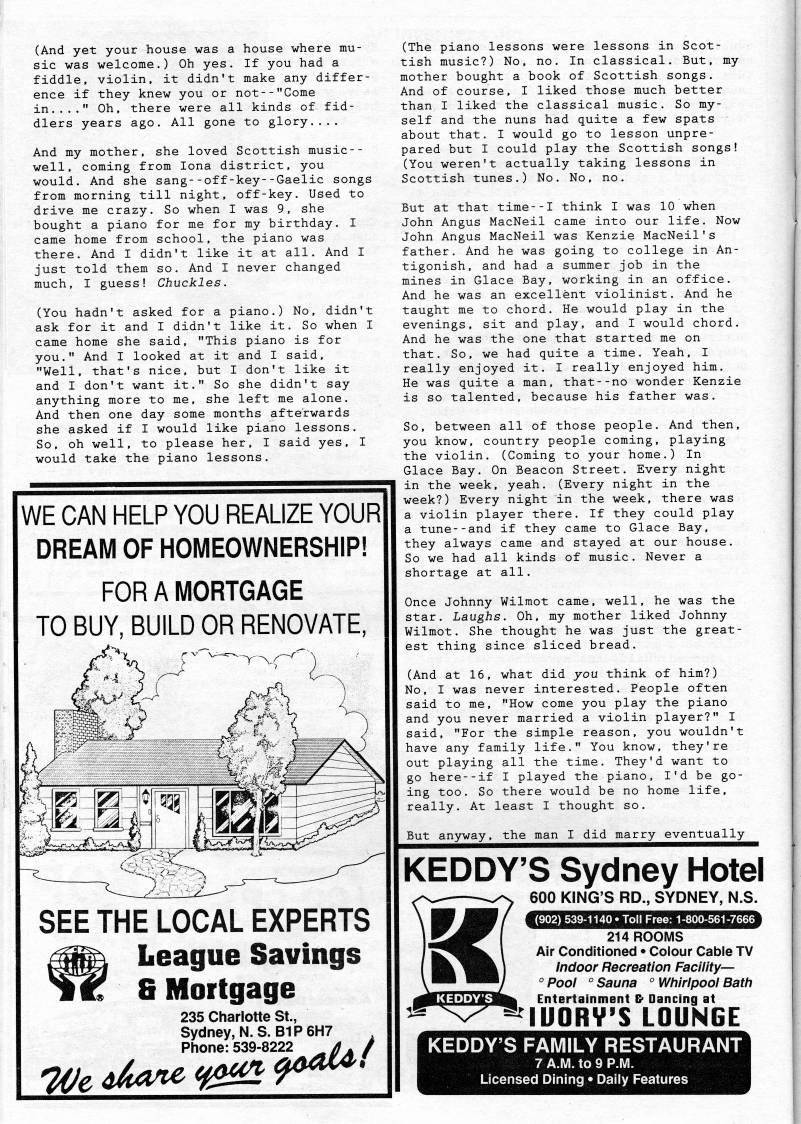 (And yet your house was a house where mu? sic was welcome.) Oh yes. If you had a fiddle, violin, it didn't make any differ? ence if they knew you or not--"Come in...." Oh, there were all kinds of fid? dlers years ago. All gone to glory.... And my mother, she loved Scottish music-- well, coming from lona district, you would. And she sang--off-key--Gaelic songs from morning till night, off-key. Used to drive me crazy. So when I was 9. she bought a piano for me for my birthday. I came home from school, the piano was there. And I didn't like it at all. And I just told them so. And I never changed much, I guess! Chuckles. (You hadn't asked for a piano.) No, didn't ask for it and I didn't like it. So when I came home she said. "This piano is for you." And I looked at it and I said. "Well, that's nice, but I don't like it and I don't want it." So she didn't say anything more to me. she left me alone. And then one day some months afterwards she asked if I would like piano lessons. So. oh well, to please her. I said yes, I would take the piano lessons. WE CAN HELP YOU REALIZE YOUR DREAM OF HOMEOWNERSHIP! FOR A MORTGAGE TO BUY, BUILD OR RENOVATE, SEE THE LOCAL EXPERTS League Savings & Mortgage 235 Charlotte St., Sydney, N.S.B1P6H7 Phone:539-8222 /). / (The piano lessons were lessons in Scot? tish music?) No, no. In classical. But, my mother bought a book of Scottish songs. And of course. I liked those much better than I liked the classical music. So my? self and the nuns had quite a few spats about that. I would go to lesson unpre? pared but I could play the Scottish songs! (You weren't actually taking lessons in Scottish tunes.) No. No, no. But at that time--I think I was 10 when John Angus MacNeil came into our life. Now John Angus MacNeil was Kenzie MacNeil's father. And he was going to college in An? tigonish, and had a summer job in the mines in Glace Bay, working in an office. And he was an excellent violinist. And he taught me to chord. He would play in the evenings, sit and play, and I would chord. And he was the one that started me on that. So. we had quite a time. Yeah. I really enjoyed it. I really enjoyed him. He was quite a man, that--no wonder Kenzie is so talented, because his father was. So, between all of those people. And then, you know, country people coming, playing the violin. (Coming to your home.) In Glace Bay. On Beacon Street. Every night in the week, yeah. (Every night in the week?) Every night in the week, there was a violin player there. If they could play a tune--and if they came to Glace Bay, they always came and stayed at our house. So we had all kinds of music. Never a shortage at all. Once Johnny Wilmot came, well, he was the star. Laughs. Oh. my mother liked Johnny Wilmot. She thought he was just the great? est thing since sliced bread. (And at 16, what did you think of him?) No, I was never interested. People often said to me, "How come you play the piano and you never married a violin player?" I said, "For the simple reason, you wouldn't have any family life." You know, they're out playing all the time. They'd want to go here--if I played the piano, I'd be go? ing too. So there would be no home life, really. At least I thought so. But anyway, the man I did marry eventually KEDDY'S Sydney Hotel 600 KING'S RD., SYDNEY, N.S. (902) 539-1140 • Toll Free: 1-800-561-7666 214 ROOMS Air Conditioned • Colour Cable TV Indoor Recreation Facility • ? Pool ? Sauna ? Whirlpool Bath Entertainment & Dancing at lUORV'S LOUNGE KEDDY'S FAMILY RESTAURANT 7 A.M. to 9 P.M. Licensed Dining • Daily Features