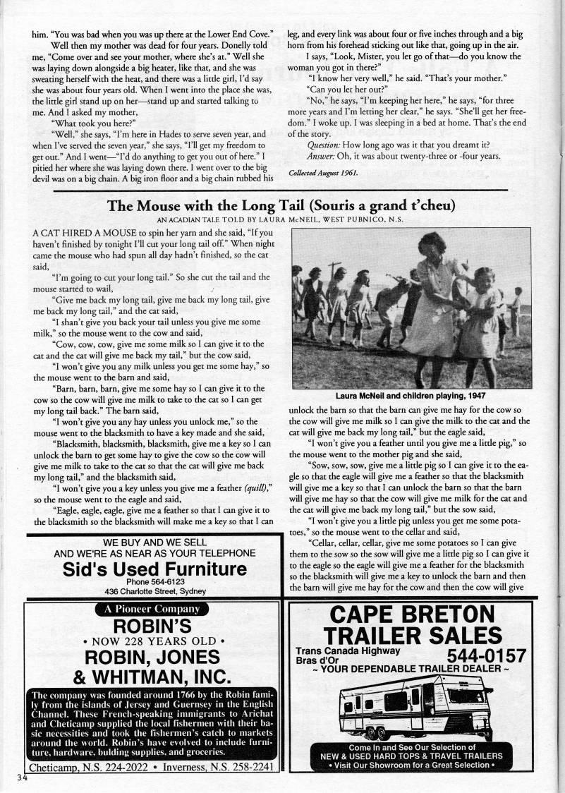 him. "You was bad when you was up there at the Lower End Cove." Well then my mother was dead for four years. Donelly told me, "Come over and see your mother, where she's at." Well she was laying down alongside a big heater, like that, and she was sweating herself with the heat, and there was a little girl, I'd say she was about four years old. When I went into the place she was, the little girl stand up on her • stand up and started talking to me. And I asked my mother, "What took you here?" "Well," she says, "I'm here in Hades to serve seven year, and when I've served the seven year," she says, "I'U get my freedom to get out." And I went • "I'd do anything to get you out of here." I pitied her where she was laying down there. I went over to the big devil was on a big chain. A big iron floor and a big chain rubbed his leg, and every link was about four or five inches through and a big horn from his forehead sticking out like that, going up in the air. I says, "Look, Mister, you let go of that • do you know the woman you got in there?" "I know her very well," he said. "That's your mother." "Can you let her out?" "No," he says, "I'm keeping her here," he says, "for three more years and I'm letting her clear," he says. "She'll get her free? dom." I woke up. I was sleeping in a bed at home. That's the end of the story. Question: How long ago was it that you dreamt it? Answer: Oh, it was about twenty-three or -four years. Collected August 1961. The Mouse with the Long Tail (Souris a grand t'cheu) AN ACADLW TALE TOLD BY LAURA McNEIL, WEST PUBNICO, N.S. A CAT HIRED A MOUSE to spin her yarn and she said, "If you haven't finished by tonight I'll cut your long tail off" When night came the mouse who had spun all day hadn't finished, so the cat said, "I'm going to cut your long tail." So she cut the tail and the mouse started to wail, "Give me back my long tail, give me back my long tail, give me back my long tail," and the cat said, "I shan't give you back your tail unless you give me some milk," so the mouse went to the cow and said, "Cow, cow, cow, give me some milk so I can give it to the cat and the cat will give me back my tail," but the cow said, "I won't give you any milk unless you get me some hay," so the mouse went to the barn and said, "Barn, barn, barn, give me some hay so I can give it to the cow so the cow will give me milk to take to the cat so I can get my long tail back." The barn said, "I won't give you any hay unless you unlock me," so the mouse went to the blacksmith to have a key made and she said, "Blacksmith, blacksmith, blacksmith, give me a key so I can imlock the barn to get some hay to give the cow so the cow will give me milk to take to the cat so that the cat will give me back my long tail," and the blacksmith said, "I won't give you a key imless you give me a feather (quill),'' so the mouse went to the eagle and said, "Eagle, eagle, eagle, give me a feather so that I can give it to the blacksmith so the blacksmith will make me a key so that I can Laura McNeil and children playing, 1947 WE BUY AND WE SELL AND WE'RE AS NEAR AS YOUR TELEPHONE Sid's Used Furniture Phone 564-6123 436 Charlotte Street, Sydney imlock the barn so that the barn can give me hay for the cow so the cow will give me milk so I can give the milk to the cat and the cat will give me back my long tail," but the eagle said, "I won't give you a feather imtil you give me a litde pig," so the mouse went to the mother pig and she said, "Sow, sow, sow, give me a little pig so I can give it to the ea? gle so that the eagle will give me a feather so that the blacksmith will give me a key so that I can imlock the barn so that the barn will give me hay so that the cow will give me milk for the cat and the cat will give me back my long tail," but the sow said, "I won't give you a litde pig imless you get me some pota? toes," so the mouse went to the cellar and said, "Cellar, cellar, cellar, give me some potatoes so I can give them to the sow so the sow will give me a little pig so I can give it to the eagle so the eagle will give me a feather for the blacksmith so the blacksmith will give me a key to unlock the barn and then the barn will give me hay for the cow and then the cow will give A Pioneer Company ROBIN'S • NOW 228 YEARS OLD • ROBIN, JONES & WHITMAN, INC. [ The company was founded around 1766 by the Robin fanii-1 ly from the islands of Jersey and Guernsey in the English Channel. These French-speaking immigrants to Arichat and Cheticamp supplied the local fishermen with their ba? sic necessities and took the fishermen's catch to markets around the world. Robin's have evolved to include furni? ture, hardware, bulding supplies, and groceries. I CAPE BRETON TRAILER SALES Trans Canada Highway Bras d'Or ~ YOUR DEPENDABLE TRAILER DEALER - 544-0157