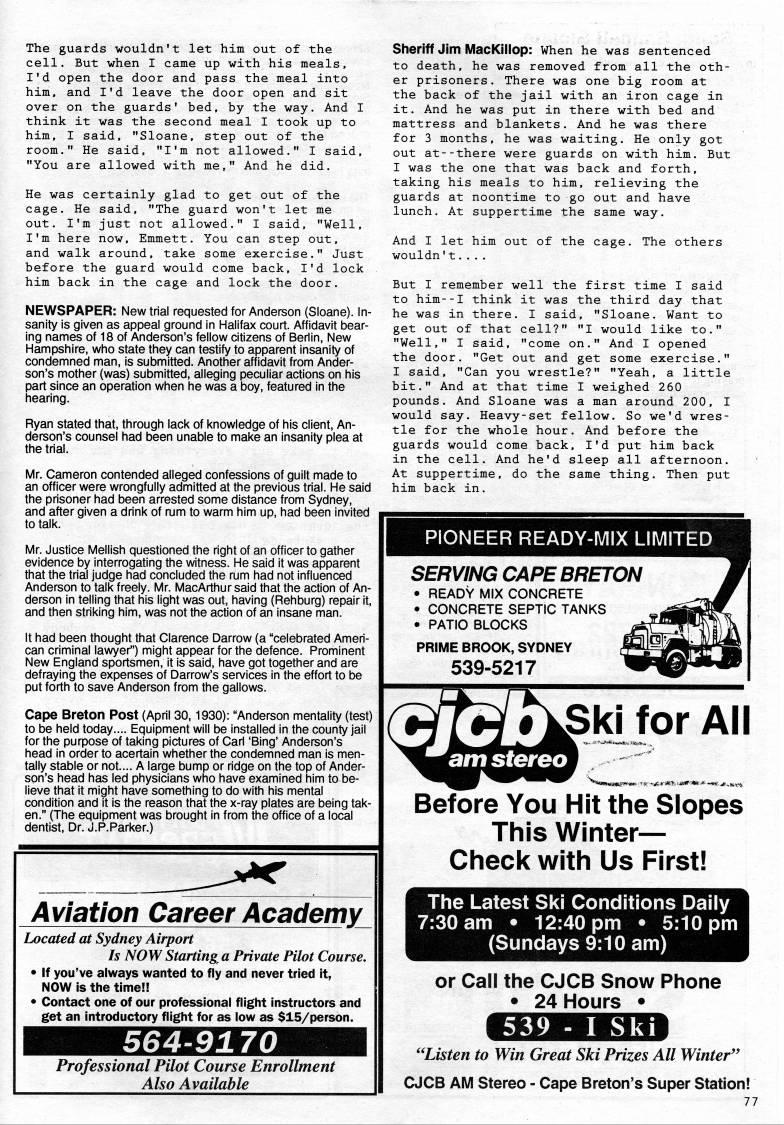 The guards wouldn't let him out of the cell. But when I came up with his meals, I'd open the door and pass the meal into him, and I'd leave the door open and sit over on the guards' bed, by the way. And I think it was the second meal I took up to him, I said, "Sloane, step out of the room." He said, "I'm not allowed." I said, "You are allowed with me," And he did. He was certainly glad to get out of the cage. He said, "The guard won't let me out. I'm just not allowed." I said, "Well, I'm here now, Emmett. You can step out, and walk around, take some exercise." Just before the guard would come back, I'd lock him back in the cage and lock the door. NEWSPAPER: New trial requested for Anderson (Sloane). In? sanity is given as appeal ground in Halifax court. Affidavit bear? ing names of 18 of Anderson's fellow citizens of Beriin, New Hampshire, who state they can testify to apparent insanity of condemned man, is submitted. Another affidavit from Ander? son's mother (was) submitted, alleging peculiar actions on his part since an operation when he was a boy, featured in the hearing. Ryan stated that, through lack of knowledge of his client, An? derson's counsel had been unable to make an insanity plea at the trial. Mr. Cameron contended alleged confessions of guilt made to an officer were wrongfully admitted at the previous trial. He said the prisoner had been arrested some distance from Sydney, and after given a drink of mm to warm him up, had been invited to talk. Mr. Justice Mellish questioned the right of an officer to gather evidence by interrogating the witness. He said it was apparent that the trial judge had concluded the rum had not influenced Anderson to talk freely. Mr. MacArthursaid that the action of An? derson in telling that his light was out, having (Rehburg) repair it, and then striking him, was not the action of an insane man. It had been thought that Clarence Darrow (a "celebrated Ameri? can criminal lawyer") might appear for the defence. Prominent New England sportsmen, it is said, have got together and are defraying the expenses of Darrow's services in the effort to be put forth to save Anderson from the gallows. Cape Breton Post (April 30,1930): "Anderson mentality (test) to be held today.... Equipment will be installed in the county jail for the purpose of taking pictures of Cari 'Bing' Anderson's head in order to acertain whether the condemned man is men? tally stable or not.... A large bump or ridge on the top of Ander? son's head has led physicians who have examined him to be? lieve that it might have something to do with his mental condition and it is the reason that the x-ray plates are being tak? en." (The equipment was brought in from the office of a local dentist, Dr. J.P.Parker.) Aviation Career Academy Located at Sydney Airport Is NOW Starting a Private Pilot Course. • if you've always wanted to fly and never tried it, NOW is the time!! • Contact one of our professional flight Instructors and get an introductory flight for as low as $15/person. 564-9170 Professional Pilot Course Enrollment Also Available Sheriff Jim MacKillop: When he was sentenced to death, he was removed from all the oth? er prisoners. There was one big room at the back of the jail with an iron cage in it. And he was put in there with bed and mattress and blankets. And he was there for 3 months, he was waiting. He only got out at--there were guards on with him. But I was the one that was back and forth, taking his meals to him, relieving the guards at noontime to go out and have lunch. At suppertime the same way. And I let him out of the cage. The others wouldn't.... But I remember well the first time I said to him--I think it was the third day that he was in there. I said, "Sloane. Want to get out of that cell?" "I would like to." "Well," I said, "come on." And I opened the door. "Get out and get some exercise." I said, "Can you wrestle?" "Yeah, a little bit." And at that time I weighed 260 pounds. And Sloane was a man around 200, I would say. Heavy-set fellow. So we'd wres? tle for the whole hour. And before the guards would come back, I'd put him back in the cell. And he'd sleep all afternoon. At suppertime, do the same thing. Then put him back in. SERVING CAPE BRETON • READY MIX CONCRETE • CONCRETE SEPTIC TANKS • PATIO BLOCKS PRIME BROOK, SYDNEY 539-5217 'Ski for All am Stereo Before You Hit the Slopes This Winter • Check with Us First! The Latest Ski Conditions Daily 7:30 am • 12:40 pm • 5:10 pm (Sundays 9:10 am) or Call the CJCB Snow Phone • 24 Hours • 539 - I Ski *%isten to Win Great Ski Prizes All Winter" CJCB AM Stereo - Cape Breton's Super Station!