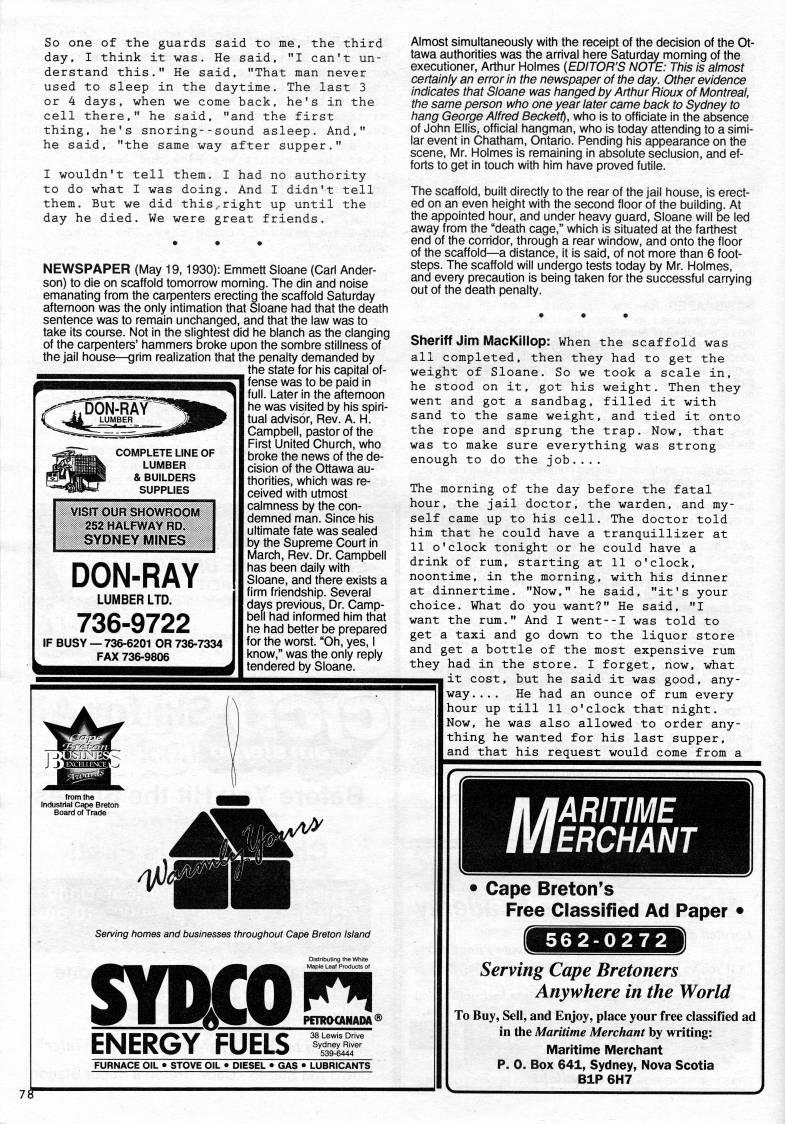 So one of the guards said to me, the third day, I think it was. He said, "I can't un? derstand this." He said, "That man never used to sleep in the daytime. The last 3 or 4 days, when we come back, he's in the cell there," he said, "and the first thing, he's snoring--sound asleep. And," he said, "the same way after supper." I wouldn't tell them. I had no authority to do what I was doing. And I didn't tell them. But we did this,right up until the day he died. We were great friends. NEWSPAPER (May 19,1930): Emmett Sloane (Cari Ander? son) to die on scaffold tomorrow morning. The din and noise emanating from the carpenters erecting the scaffold Saturday aftemoon was the only intimation that Sloane had that the death sentence was to remain unchanged, and that the law was to take its course. Not in the slightest did he blanch as the clanging of the carpenters' hammers broke upon the sombre stillness of the jail house • grim realization that the penalty demanded by the state for his capital of- COMPLETE LINE OF LUMBER & BUILDERS SUPPLIES VlSfr OUR SMOWfiOOM 252 HALFWAY RD?? SYDNEY iiHiNES DON-RAY LUMBER LTD. 736-9722 IF BUSY • 736-6201 OR 736-7334 FAX 736-9606 fense was to be paid in full. Later in the afternoon he was visited by his spiri? tual advisor, Rev. A. H. Campbell, pastor of the First United Church, who broke the news of the de? cision of the Ottawa au? thorities, which was re? ceived with utmost calmness by the con? demned man. Since his ultimate fate was sealed by the Supreme Court in March, Rev. Dr. Campbell has been daily with Sloane, and there exists a firm friendship. Several days previous. Dr. Camp? bell had infonned him that he had better be prepared for the worst. "Oh, yes, I know," was the only reply tendered by Sloane. Serving homes and businesses throughout Cape Breton Island ''''' 'm'''. ''m '''' Maple Leaf Products o( syhco' ENERGY FUELS 38 Lewis Drive Sydney River 539-6444 Almost simultaneously with the receipt of the decision of the Ot? tawa authorities was the arrival here Saturday morning of the executioner, Arthur Holmes {EDITOR'S NOTE: This is almost certainly an error in the newspaper of the day. Other evidence indicates that Sloane was hanged by Arthur Rioux of Montreal, the same person who one year later came back to Sydney to hang George Alfred Beckett), who is to officiate in the absence of John Ellis, official hangman, who is today attending to a simi? lar event in Chatham, Ontario. Pending his appearance on the scene, Mr. Holmes is remaining in absolute seclusion, and ef? forts to get in touch with him have proved futile. The scaffold, built directly to the rear of the jail house, is erect? ed on an even height with the second floor of the building. At the appointed hour, and under heavy guard, Sloane will be led away from the "death cage," which is situated at the farthest end of the corridor, through a rear window, and onto the floor of the scaffold • a distance, it is said, of not more than 6 foot? steps. The scaffold will undergo tests today by Mr. Holmes, and every precaution is being taken for the successful carrying out of the death penalty. Sheriff Jim MacKillop: When the scaffold was all completed, then they had to get the weight of Sloane. So we took a scale in, he stood on it, got his weight. Then they went and got a sandbag, filled it with sand to the same weight, and tied it onto the rope and sprung the trap. Now, that was to make sure everything was strong enough to do the job.... The morning of the day before the fatal hour, the jail doctor, the warden, and my? self came up to his cell. The doctor told him that he could have a tranquillizer at 11 o'clock tonight or he could have a drink of rum, starting at 11 o'clock, noontime, in the morning, with his dinner at dinnertime. "Now," he said, "it's your choice. What do you want?" He said, "I want the rum." And I went--I was told to get a taxi and go down to the liquor store and get a bottle of the most expensive rum they had in the store. I forget, now, what it cost, but he said it was good, any? way. ... He had an ounce of rum every hour up till 11 o'clock that night. Now, he was also allowed to order any? thing he wanted for his last supper. and that his request would come from a FURNACE OIL • STOVE OIL • DIESEL • GAS > LUBRICANTS ARITIME ERCHANT • Cape Breton's Free Classified Ad Paper • 562-0272 Serving Cape Bretoners Anywhere in the World To Buy, Sell, and Enjoy, place your free classiHed 2 in the Maritime Merchant by writing: Maritime Merchant P. 0. Box 641, Sydney, Nova Scotia BIP 6H7