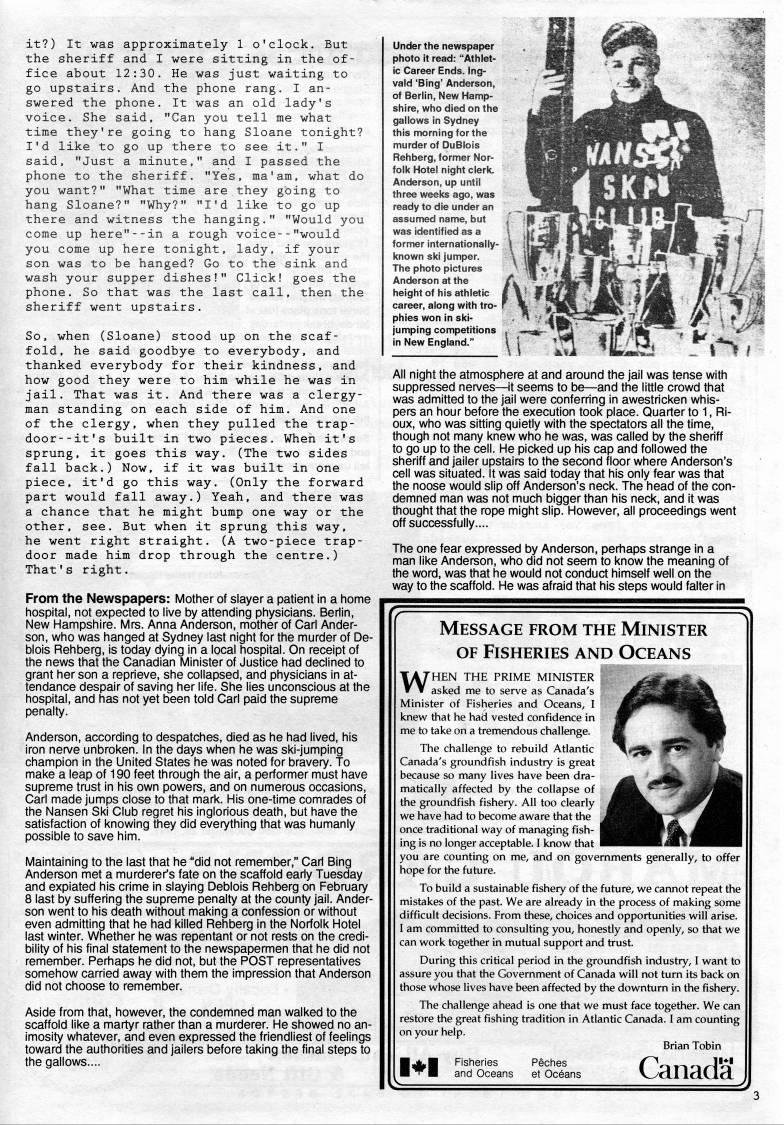 it?) It was approximately 1 o'clock. But the sheriff and I were sitting in the of? fice about 12:30. He was just waiting to go upstairs. And the phone rang. I an? swered the phone. It was an old lady's voice. She said, "Can you tell me what time they're going to hang Sloane tonight? I'd like to go up there to see it." I said, "Just a minute," and I passed the phone to the sheriff. "Yes, ma'am, what do you want?" "What time are they going to hang Sloane?" "Why?" "I'd like to go up there and witness the hanging." "Would you come up here"--in a rough voice--"would you come up here tonight, lady, if your son was to be hanged? Go to the sink and wash your supper dishes!" Click! goes the phone. So that was the last call, then the sheriff went upstairs. So, when (Sloane) stood up on the scaf? fold, he said goodbye to everybody, and thanked everybody for their kindness, and how good they were to him while he was in jail. That was it. And there was a clergy? man standing on each side of him. And one of the clergy, when they pulled the trap? door- -it's built in two pieces. When it's sprung, it goes this way. (The two sides fall back.) Now, if it was built in one piece, it'd go this way. (Only the forward part would fall away.) Yeah, and there was a chance that he might bump one way or the other, see. But when it sprung this way, he went right straight. (A two-piece trap? door made him drop through the centre.) That's right. From the Newspapers: Mother of slayer a patient in a home hospital, not expected to live by attending physicians. Berlin, New Hampshire. Mrs. Anna Anderson, mother of Carl Ander? son, who was hanged at Sydney last night for the murder of De- blois Rehberg, is today dying in a local hospital. On receipt of the news that the Canadian Minister of Justice had declined to grant her son a reprieve, she collapsed, and physicians in at? tendance despair of saving her life. She lies unconscious at the hospital, and has not yet been told Carl paid the supreme penalty. Anderson, according to despatches, died as he had lived, his iron nerve unbroken. In the days when he was ski-jumping champion in the United States he was noted for bravery. To make a leap of 190 feet through the air, a performer must have supreme trust in his own powers, and on numerous occasions, Carl made jumps close to that mark. His one-time comrades of the Nansen Ski Club regret his inglorious death, but have the satisfaction of knowing they did everything that was humanly possible to save him. Maintaining to the last that he "did not remember," Carl Bing Anderson met a murderer's fate on the scaffold early Tuesday and expiated his crime in slaying Deblois Rehberg on February 8 last by suffering the supreme penalty at the county jail. Ander? son went to his death without making a confession or without even admitting that he had killed Rehberg in the Norfolk Hotel last winter. Whether he was repentant or not rests on the credi? bility of his final statement to the newspapermen that he did not remember. Perhaps he did not, but the POST representatives somehow carried away with them the impression that Anderson did not choose to remember. Aside from that, however, the condemned man walked to the scaffold like a martyr rather than a murderer. He showed no an? imosity whatever, and even expressed the friendliest of feelings toward the authorities and jailers before taking the final steps to the gallows.... Under the newspaper photo it read: "Athlet? ic Career Ends. Ing? vald 'Bing' Anderson, of Berlin, New Hamp? shire, who died on the gallows in Sydney this morning for the murder of DuBlois Rehberg, former Nor? folk Hotel night clerk. Anderson, up until three weeks ago, was ready to die under an assumed name, but was identified as a former internationally- known ski jumper. The photo pictures Anderson at the height of his athletic career, along with tro? phies won in ski- jumping competitions in New England." All night the atmosphere at and around the jail was tense with suppressed nerves • it seems to be • and the little crowd that was admitted to the jail were conferring in awestricken whis? pers an hour before the execution took place. Quarter to 1, Ri? oux, who was sitting quietly with the spectators all the time, though not many knew who he was, was called by the sheriff to go up to the cell. He picked up his cap and followed the sheriff and jailer upstairs to the second floor where Anderson's cell was situated. It was said today that his only fear was that the noose would slip off Anderson's neck. The head of the con? demned man was not much bigger than his neck, and it was thought that the rope might slip. However, all proceedings went off successfully.... The one fear expressed by Anderson, periiaps strange in a man like Anderson, who did not seem to know the meaning of the word, was that he would not conduct himself well on the way to the scaffold. He was afraid that his steps would falter in Message from the Minister OF Fisheries and Oceans WHEN THE PRIME MINISTER asked me to serve as Canada's Minister of Fisheries and Oceans, I knew that he had vested confidence in me to take on a tremendous challenge. The challenge to rebuild Atlantic Canada's groundfish industry is great because so many lives have been dra? matically affected by the collapse of the groundfish fishery. All too clearly we have had to become aware that the once traditional way of managing fish? ing is no longer acceptable. I know that you are counting on me, and on governments generally, to offer hope for the future. To build a sustainable fishery of the future, we cannot repeat the mistakes of the past. We are already in the process of making some difficult decisions. From these, choices and opportunities will arise. I am committed to consulting you, honestly and openly, so that we can work together in mutual support and trust. During this critical period in the grovmdfish industry, I want to assure you that the Government of Canada will no