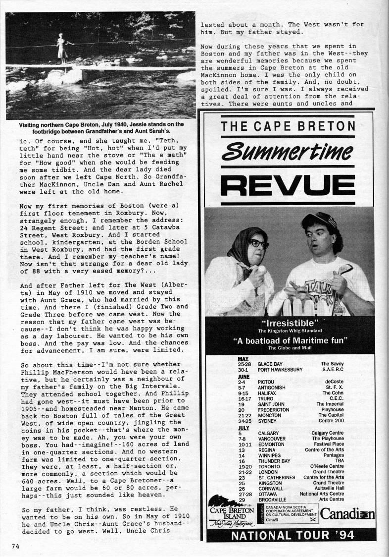 Visiting northern Cape Breton, July 1940, Jessie stands on the footbridge between Grandfather's and Aunt Sarah's. ic. Of course, and she taught me, "Teth, teth" for being "Hot, hot" when I'd put my little hand near the stove or "Tha e math" for "How good" when she would be feeding me some tidbit. And the dear lady died soon after we left Cape North. So Grandfa? ther MacKinnon, Uncle Dan and Aunt Rachel were left at the old home. Now my first memories of Boston (were a) first floor tenement in Roxbury. Now, strangely enough, I remember the address: 24 Regent Street; and later at 5 Catawba Street, West Roxbury. And I started school, kindergarten, at the Borden School in West Roxbury, and had the first grade there. And I remember my teacher's name! Now isn't that strange for a dear old lady of 88 with a very eased memory?... And after Father left for The West (Alber? ta) in May of 1910 we moved and stayed with Aunt Grace, who had married by this time. And there I (finished) Grade Two and Grade Three before we came west. Now the reason that my father came west was be? cause- -I don't think he was happy working as a day labourer. He wanted to be his own boss. And the pay was low. And the chances for advancement, I am sure, were limited. So about this time--I'm not sure whether Phillip MacPherson would have been a rela? tive, but he certainly was a neighbour of my father's family on the Big Intervale. They attended school together. And Phillip had gone west--it must have been prior to 1905--and homesteaded near Nanton. He came back to Boston full of tales of the Great West, of wide open country, jingling the coins in his pocket--that's where the mon? ey was to be made. Ah, you were your own boss. You had--imagine!--160 acres of land in one-quarter sections. And no western farm was limited to one-quarter section. They were, at least, a half-section or, more commonly, a section which would be 640 acres. Well, to a Cape Bretoner--a large farm would be 60 or 80 acres, per? haps- -this just sounded like heaven. So my father, I think, was restless. He wanted to be on his own. So in May of 1910 he and Uncle Chris--Aunt Grace's husband-- decided to go west. Well, Uncle Chris lasted about a month. The West wasn't for him. But my father stayed. Now during these years that we spent in Boston and my father was in the West--they are wonderful memories because we spent the summers in Cape Breton at the old MacKinnon home. I was the only child on both sides of the family. And, no doubt, spoiled. I'm sure I was. I always received a great deal of attention from the rela? tives. There were aunts and uncles and THE CAPE BRETON Summert/me "Irresistible" The Kingston Whig Standard "A boatload of Maritime fun" MAY 25-28 30-1 Mj?? 2-A 5-7 9-15 16-17 19 20 21-22 24'25 JULY 5 7' 10-11 16 19-20 21-22 27-28 29 GLACE BAY PORT HAWKESBURY PICTOU ANTIGONISH HALIFAX TRURO SAINT JOHN FREDERICTON MONCTON SYDNEY The Savoy S.A.E.R.C deCoste St. F. X. The Cohn C.E.C. The Imperial Playhouse The Capitol Centre 200 CALGARY VANCOUVER EDMONTON REGINA WINNIPEG THUNDER BAY TORONTO LONDON ST. CATHERINES KINGSTON CORNWALL OHAWA BROCKVILLE Calgary Centre The Playhouse Festival Place Centre of the Arts Pantages TBA O'Keefe Centre Grand Theatre Centre for the Arts Grand Theatre Aultsville Hall National Arts Centre Arts Centre Cape Breton ILAND I CANADA/ NOVA SCOTIA COOPERATION AGREEMENT ON CULTURAL DEVELOPMENT CanadS >C Canadian NATIONAL TOUR '94