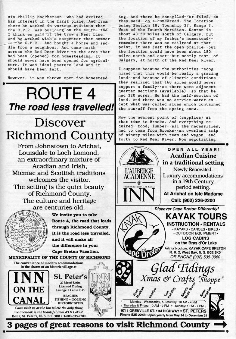 sin Phillip MacPherson, who had excited his interest in the first place. And from there he worked in various stations that the C.P.R. was building on the south line'. I think we c_aJUr't the Crow's Nest Line. And h'.j?>flced with a carpenter that summer ''c'-'t'e C.P.R. . And bought a horse and sad? dle from a neighbour. And came north across the Red Deer River to the area that had been (opened) for homesteading. It should never have been opened for agricul? ture. It was ideal pasture land and it should have been left. However, it was thrown open for homestead- ROUTE 4 The road less travelled! Discover Richmond County From Johnstown to Arichat, Louisdale to Loch Lomond, an extraordinary mixture of Acadian and Irish, Micmac and Scottish traditions welcomes the visitor. The setting is the quiet beauty of Richmond County. The culture and heritage are centuries old. We invite you to take Route 4, the road that leads through Richmond County. It is the road less travelled, and it will make all the difference in your Cape Breton Vacation. MUNICIPALITY OF THE COUNTY OF RICHMOND ing. And there he cancelled--or filed, as they said-'oil, a homestead. The location being Section 18, Township 27, Range 7, West of the Fourth Meridian. Nanton is about 40-50 miles south of Calgary. But the location of my father's homestead-- remember there was no railroad at that point, it was just the open prairie--but the location would have been about 180 miles north and east--but mostly east--of Calgary, at north of the Red Deer River. I suppose because the authorities recog? nized that this would be really a grazing land--and because of climatic conditions-- they realized that 160 acres would never support a family--so there were adjacent quarter-sections (available)--so that he had 320 acres. He had the half-section of land. And there was no service water ex? cept what was called slues which contained the run-off from the spring snow. Now the nearest point of (supplies) at that time is Brooks. And everything re? quired- -food, lumber--all the necessities, had to come from Brooks--an overland trip of ninety miles with team and wagon--and forty to Red Deer River. Now negotiating OPEN ALL YEAR! Acadian Cuisine in a traditional setting Newly Renovated. Luxury accommodations in a 19th Century period setting. At Arichat on Isle Madame Call: (902) 226-2200 The convenience of modem accommodations in the charm of an historic village at St. Peter's 20 Motel Units Licensed Dining Lounge • Cable T.V. BEACHES FISHING • GOLFING HISTORIC SITES INN ON THE CANAL Come visit us at the Inn where the only thing we overlook is the beautiful Bras d'Or Lakes! Box 9, St. Peter's, N. S. BOE 3B0 ?? 1-800-535-2200 Discover Cape Breton Differently! KAYAK TOURS INSTRUCTION • RENTALS • KAYAKS • CANOES • BIKES • • OUTDOOR EQUIPMENT- LOG CABINS on the Bras d'Or Lake Ask for brochure: KAYAK CAPE BRETON R. R. 2, West Bay, N. 8. BOE 3K0 OR PHONE (902) 535-3060 QCad'dings Xmas & Crafts "SHoppe" // J'/ f Monday - Wednesday. & Saturday: 10 AM - 4 PM ' 1' Thursdays Friday: 10 AM-9 PM • Sunday: 1 PM ?? 7 PM j 9711 GRENVILLE ST. .#4 HIGHWAY • ST. PETERS Phone 535-2248 • open yearly from May 24 to December 24 3 pages of great reasons to visit Richmond County
