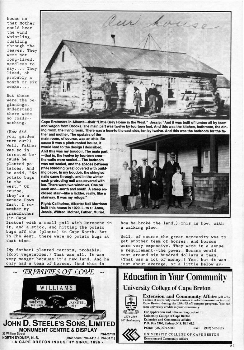 house so that Mother could hear the wind whistling, rustling through the leaves. They were not long-lived, needless to say.... They lived, oh probably a month or six weeks .... But these were the be? ginnings . Understand there were no roads-- nothing, (How did your garden turn out?) Well, Father was so in? terested be? cause he planted po? tatoes. And he said. "No potato bugs in the west." Of course, they're a menace Down East. I re? member my grandfather (in Cape Breton) with it, and Cape Bretoners In Alberta • their "Little Grey Home In the West." Jessie: "And It was built of lumber all by team and wagon from Brooks. The main part was twelve by fourteen feet. And this was the kitchen, bathroom, the din? ing room, the living room. There was a lean-to the east side, ten by twelve. And this was the bedroom for the fa? ther and mother. The upstairs of the main room, of course, was an attic. Be? cause it was a pitch-roofed house, it would lead to the design I described. And this was my boudoir. The main part ??that Is, the twelve by fourteen area • the walls were sealed.... The bedroom was not sealed, and the spaces between (the) studding (was) covered with build? ing paper. In my boudoir, the shingled nails came through, and in the winter each protruding nail was covered with Ice. There were two windows. One on each end • north and south. A steep en? closed stair • like a ladder, really, like a stairway. It was my refuge." Right: Caliholme, Alberta: Neil Morrison built this house In 1929. L. to r.: Anna, Jessie, Wilfred, Mother, Father, Muriel. small pail with kerosene in stick, and hitting the potato bugs off the (plants) in Cape North. But in The West, there were no potato bugs at that time. (My father) planted carrots, probably. (Root vegetables.) That was all. It was very meager because it's new land. And he only had a team of horses. (And this is how he broke the land.) a walking plow. This is how, with Well, of course the great necessity was to get another team of horses. And horses were very expensive. They were in a sense a requirement--the power. Horses would cost around six hundred dollars a team. (That was a lot of money.) Yes, but it was just about average, or a little below av- IHjI'B'UTES Of LO'PE John D. Steele's Sons, Limited MONUMENT CENTRE & DISPLAY 32 William Street 794-2713 NORTH SYDNEY, N. S. (after hours: 794-4411 & 794-3171) • A CAPE BRETON INDUSTRY SINCE 1896 • Education in Your Community University College of Cape Breton Extension and Comniunity Affairs wiU offer a series of university credit courses in select communities in rural Cape Breton during the 1994-95 off-campus program. You can earn university credits in your community. For application and information, contact: University College of Cape Breton Extension and Community Affairs P.O. Box 5300, Sydney, N.S. BIP 6L2 Phone:(902)539-5300 Fax: (902)562-0119 UNIVERSITY COLLEGE OF CAPE BRETON Extension and Community Affairs