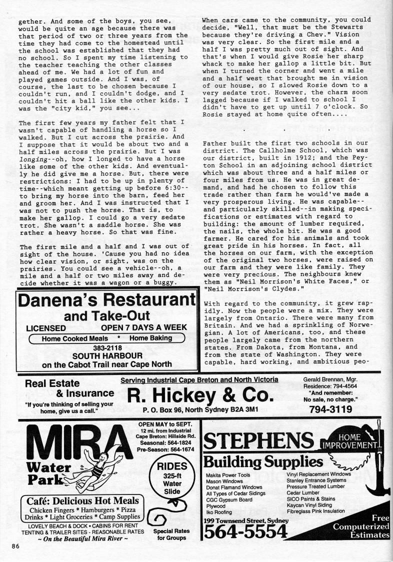 gether. And some of the boys, you see, would be quite an age because there was that period of two or three years from the time they had come to the homestead until the school was established that they had no school. So I spent my time listening to the teacher teaching the other classes ahead of me. We had a lot of fun and played games outside. And I was, of course, the last to be chosen because I couldn't run, and I couldn't dodge, and I couldn't hit a ball like the other kids. I was the "city kid," you see... The first few years my father felt that I wasn't capable of handling a horse so I walked. But I cut across the prairie. And I suppose that it would be about two and a half miles across the prairie. But I was longing--oh. how I longed to have a horse like some of the other kids. And eventual? ly he did give me a horse. But, there were restrictions: I had to be up in plenty of time--which meant getting up before 6:30-- to bring my horse into the barn, feed her and groom her. And I was instructed that I was not to push the horse. That is, to make her gallop. I could go a very sedate trot. She wasn't a saddle horse. She was rather a heavy horse. So that was fine. The first mile and a half and I was out of sight of the house. 'Cause you had no idea how clear vision, or sight, was on the prairies. You could see a vehicle--oh, a mile and a half or two miles away and de- cide whether it was a wagon or a buggy. Danena's Restaurant and Take-Out LICENSED OPEN 7 DAYS A WEEK Q Home Cooked Meals * Home Baking ) 383-2118 SOUTH HARBOUR on the Cabot Trail near Cape North When cars came to the community, you could decide, "Well, that must be the Stewarts because they're driving a Chev." Vision was very clear. So the first mile and a half I was pretty much out of sight. And that's when I would give Rosie her sharp whack to make her gallop a little bit. But when I turned the corner and went a mile and a half west that brought me in vision of our house, so I slowed Rosie down to a very sedate trot. However, the charm soon lagged because if I walked to school I didn't have to get up until 7 o'clock. So Rosie stayed at home quite often.... Father built the first two schools in our district. The Caliholme School, which was our district, built in 1912; and the Pey? ton School in an adjoining school district which was about three and a half miles or four miles from us. He was in great de? mand, and had he chosen to follow this trade rather than farm he would've made a very prosperous living. He was capable-- and particularly skilled--in making speci? fications or estimates with regard to building: the amount of lumber required, the nails, the whole bit. He was a good farmer. He cared for his animals and took great pride in his horses. In fact, all the horses on our farm, with the exception of the original two horses, were raised on our farm and they were like family. They were very precious. The neighbours knew them as "Neil Morrison's White Faces," or "Neil Morrison's Clydes." With regard to the community, it grew rap? idly. Now the people were a mix. They were largely from Ontario. There were many from Britain. And we had a sprinkling of Norwe? gian. A lot of Americans, too, and these people largely came from the northern states. From Dakota, from Montana, and from the state of Washington. They were capable, hard working, and ambitious peo- Real Estate & Insurance "If you're thinking of selling your home, give us a call." Serving Industrial Cape Breton and North Victoria R. Hickey & Co. p. O. Box 96, North Sydney B2A 3M1 Gerald Brennan, Mgr. Residence: 794-4564 "And remember: No sale, no charge." 794-3119 OPEN MAY to SEPT. 12 mi. from industrial Cape Breton: Hillside Rd. Seasonal: 564-1824 Pre-Season: 564-1674 Water Parks r Cafe: Delicious Hot Meals 1 Chicken Fingers * Hamburgers * Pizza 'Drinks * Light Groceries * Camp Supplies J 86 LOVELY BEACH & DOCK • CABINS FOR RENT TENTING & TRAILER SITES - REASONABLE RATES - On the Beautiful Mira River ~ STEPHENS Building Supplies Makita Power Tools Mason Windows Donat Flamand Windows All Types of Cedar Sidings CGC Gypsum Board Plywood Iko Roofing Vinyl Replacement Windows Stanley Entrance Systems Pressure Treated Lumber Cedar Lumber SICO Paints & Stains Kaycan Vinyl Siding Fibreglass Pink Insulation 199 Townsend Street, Sydney 564-5554