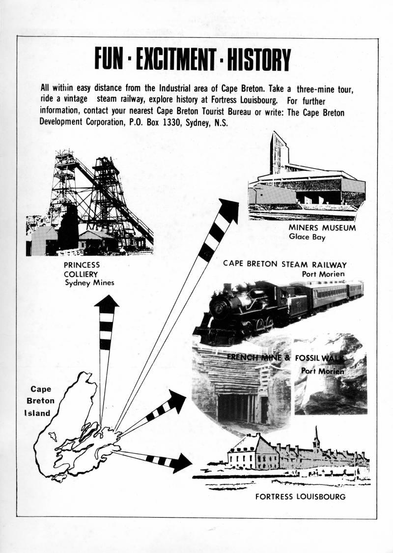 Published by Ronald Caplan on 1976/8/1 (241 reads)FUNEXCITMENTHISTORY All within easy distance from the Industrial area of Cape Breton. Take a three-mine tour, ride a vintage steam railway, explore history at Fortress Louisbourg. For further information, contact your nearest Cape Breton Tourist Bureau or write: The Cape Breton Development Corporation, P.O. Box 1330, Sydney, N.S. FORTRESS LOUISBOURG