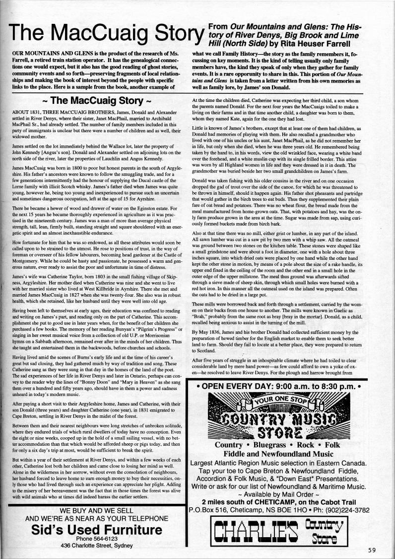 The MacCuaig Story OUR MOUNTAINS AND GLENS is the product of the research of Ms. Farrell, a retired train station operator. It has the genealogical connec? tions one would expect, but it also has the good reading of ghost stories, conununity events and so forth • preserving fragments of local relation? ships and making the book of interest beyond the people with specific links to the place. Here is a sample from the book, another example of From Our Mountains and Glens: The His? tory of River Denys, Big Brook and Lime Hill (North Side) by 'ita Heuser Farrell what we call Family History • the story as the family remembers it, fo? cussing on key moments. It is the kind of telling usuaUy only family members have, the kind they speak of only when they gather for family events. It is a rare opporunity to share in this. This portion of Our Moun? tains and Glens is taken from a letter written from his own memories as well as family lore, by James' son Donald. ~ The MacCuaig Story ~ ABOUT 1831, THREE MACCUAIG BROTHERS, James, Donald and Alexander settled in River Denys, where their sister, Janet MacPhail, married to Archibald MacPhail Sr., had already settled. The number of family members included in this party of immigrants is unclear but there were a number of children and as well, their widowed mother. James settled on the lot immediately behind the Wallace lot, later the property of John Kennedy [Angus's son]. Donald and Alexander settled on adjoining lots on the north side of the river, later the properties of Lauchlin and Angus Kennedy. James MacCuaig was born in 1800 to poor but honest parents in the south of Argyle- shire. His father's ancestors were known to follow the smuggling trade, and for a few generations intermittently had the honour of supplying the Ducal castle of the Lome family with illicit Scotch whisky. James's father died when James was quite young, however he, being too young and inexperienced to pursue such an uncertain and sometimes dangerous occupation, left at the age of 15 for Ayrshire. There he became a hewer of wood and drawer of water on the Eginston estate. For the next 15 years he became thoroughly experienced in agriculture as it was prac? tised in the nineteenth century. James was a man of more than average physical strength, tall, lean, firmly built, standing straight and square shouldered with an ener? getic spirit and an almost inexhaustible endurance. How fortunate for him that he was so endowed, as all these attributes would soon be called upon to be strained to the utmost. He rose to positions of trust, in the way of foreman or overseer of his fellow labourers, becoming head gardener at the Castle of Montgomery. While he could be hasty and passionate, he possessed a warm and gen? erous nature, ever ready to assist the poor and unfortunate in time of distress. James's wife was Catherine Taylor, bom 1803 in the small fishing village of Skip- ness, Argyleshire. Her mother died when Catherine was nine and she went to Uve with her married sister who lived at West Killbride in Ayrshire. There she met and married James MacCuaig in 1827 when she was twenty-four. She also was in robust health, which she retained, like her husband until they were well into old age. Having been left to themselves at early ages, their education was confined to reading and writing on James's part, and reading only on the part of Catherine. This accom? plishment she put to good use in later years when, for the benefit of her children she purchased a few books. The memory of her reading Bunyan's "Pilgrim's Progress" or singing in her sweet musical voice from a collection of old U.P. or Morrisonian hymns on a Sabbath aftemoon, remained ever after in the minds of her children. Thus she taught and entertained them in the backwoods, before churches and schools. Having lived amid the scenes of Bums's early life and at the time of his career's great but sad closing, they had gathered much by way of tradition and song. These Catherine sang as they were sung in that day in the homes of the land of the poet. The sad experiences of her life in River Denys and later in Ontario, perhaps can con? vey to the reader why the lines of "Bonny Doon" and "Mary in Heaven" as she sang them over a hundred and fifty years ago, should have in them a power and sadness unheard in today's modern music. After paying a short visit to their Argyleshire home, James and Catherine, with their son Donald (three years) and daughter Catherine (one year), in 1831 emigrated to Cape Breton, settling in River Denys in the midst of the forest. Between them and their nearest neighbours were long stretches of unbroken solitude, where they endured trials of which rural dwellers of today have no conception. Even the eight or nine weeks, cooped up in the hold of a small sailing vessel, with no bet? ter accommodation than that which would be afforded sheep or pigs today, and then for only a six day's trip at most, would be sufficient to break the spirit. But within a year of their settlement at River Denys, and within a few weeks of each other, Catherine lost both her children and came close to losing her mind as well. Alone in the wildemess in her sorrow, without even the consolation of neighbours, her husband forced to leave home to eam enough money to buy their necessities, on? ly those who had lived through such an experience can appreciate her plight. Adding to the misery of her bereavement was the fact that in those times the forest was aUve with wild animals who at times did indeed harass the earlier settlers. At the time the children died, Catherine was expecting her third child, a son whom the parents named Donald. For the next four years the MacCuaigs toiled to make a living on their farms and in that time another child, a daughter was born to them, whom they named Kate, again for the one they had lost. Little is known of James's brothers, except that at least one of them had children, as Donald had memories of playing