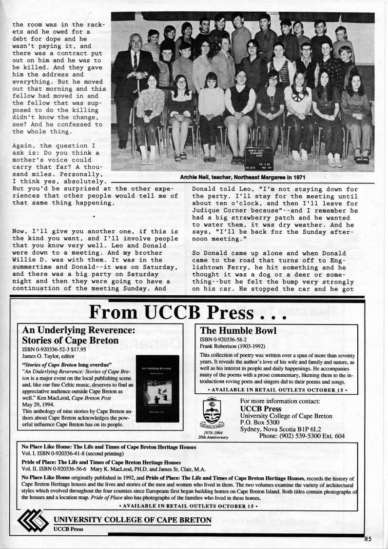Published by Ronald Caplan on 1994/8/1 (145 reads)the room was in the rack? ets and he owed for a debt for dope and he wasn't paying it, and there was a contract put out on him and he was to be killed. And they gave him the address and everything. But he moved out that morning and this fellow had moved in and the fellow that was sup? posed to do the killing didn't know the change, see? And he confessed to the whole thing. Again, the question I ask is: Do you think a mother's voice could -' carry that far? A thou? sand miles. Personally, I think yes, absolutely. • • • ---_ • • • But you'd be surprised at the other expe? riences that other people would tell me of that same thing happening. Now, I'll give you another one, if this is the kind you want, and I'll involve people that you know very well. Leo and Donald were down to a meeting. And my brother Willie D. was with them. It was in the summertime and Donald--it was on Saturday, and there was a big party on Saturday night and then they were going to have a continuation of the meeting Sunday. And Archie Neil, teacher, Northeast Margaree in 1971 Donald told Leo, "I'm not staying down for the party. I'll stay for the meeting until about ten o'clock, and then I'll leave for Judique Corner because"--and I remember he had a big strawberry patch and he wanted to water them, it was dry weather. And he says, "I'll be back for the Sunday after? noon meeting." So Donald came up alone and when Donald came to the road that turns off to Eng? lishtown Ferry, he hit something and he thought it was a dog or a deer or some? thing- -but he felt the bump very strongly on his car. He stopped the car and he got From UCCB Press ... An Underlying Reverence: Stories of Cape Breton ISBN 0-920336-52-3 $17.95 James O. Taylor, editor "Stories of Cape Breton long overdue" '"An Underlying Reverence: Stories of Cape Bre? ton is a major event on the local publishing scene and, like our fine Celtic music, deserves to find an appreciative audience outside Cape Breton as well." Ken MacLeod, Cape Breton Post May 29,1994. This anthology of nine stories by Cape Breton au? thors about Cape Breton acknowledges the pow? erful influence Cape Breton has on its people. The Humble Bowl ISBN 0-920336-58-2 Frank Robertson ](1903-1992) This collection of poetry was written over a span of more than seventy years. It reveals the author's love of his wife and family and nature, as well as his interest in people and daily happenings. He accompanies many of the poems with a prose commentary, likening them to the in? troductions roving poets and singers did to their poems and songs. • AVAILABLE IN RETAIL OUTLETS OCTOBER 15 • For more information contact: UCCB Press University College of Cape Breton P.O. Box 5300 Sydney, Nova Scotia BIP 6L2 Phone: (902) 539-5300 Ext. 604 No Place Like Home: The Life and Times of Cape Breton Heritage Houses Vol. I. ISBN 0-920336-41-8 (second printing) Pride of Place: The Life and Times of Cape Breton Heritage Houses Vol. n. ISBN 0-920336-56-6 Mary K. MacLeod, PHX). and James St Clair, M.A. No Place Lilte Home originally published in 1992, and Pride of Place: The Life and Times of Cape Breton Heritage Houses, records the history of Cape Breton Heritage houses and the lives and stories of the men and women who lived in them. The two volumes examine the variety of architectural styles which evolved throughout the four counties since Europeans first began building homes on Cape Breton Island. Both titles contain photographs of the houses and a location m'. Pride of Place also has photographs of the families who lived in these homes. • AVAILABLE IN RETAIL OUTLETS OCTOBER 15 • UNIVERSITY COLLEGE OF CAPE BRETON