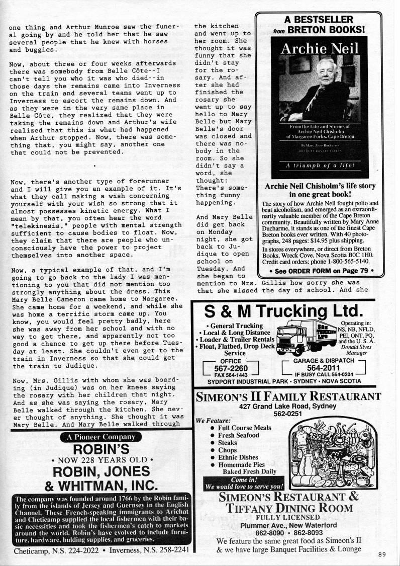 Published by Ronald Caplan on 1994/8/1 (143 reads)one thing and Arthur Munroe saw the funer? al going by and he told her that he saw several people that he knew with horses and buggies. Now, about three or four weeks afterwards there was somebody from Belle Cote--I can't tell you who it was who died--in those days the remains came into Inverness on the train and several teams went up to Inverness to escort the remains down. And as they were in the very same place in Belle C6te, they realized that they were taking the remains down and Arthur's wife realized that this is what had happened when Arthur stopped. Now, there was some? thing that, you might say, another one that could not be prevented. Now, there's another type of forerunner and I will give you an example of it. It's what they call making a wish concerning yourself with your wish so strong that it almost possesses kinetic energy. What I mean by that, you often hear the word "telekinesis," people with mental strength sufficient to cause bodies to float. Now, they claim that there are people who un? consciously have the power to project themselves into another space. Now, a typical example of that, and I'm going to go back to the lady I was men? tioning to you that did not mention too strongly anything about the dress. This Mary Belle Cameron came home to Margaree. She came home for a weekend, and while she was home a terrific storm came up. You know, you would feel pretty badly, here she was away from her school and with no way to get there, and apparently not too good a chance to get up there before Tues? day at least. She couldn't even get to the train in Inverness so that she could get the train to Judique. Now, Mrs. Gillis with whom she was board? ing (in Judique) was on her knees saying the rosary with her children that night. And as she was saying the rosary, Mary Belle walked through the kitchen. She nev? er thought of anything. She thought it was Mary Belle. And Mary Belle walked through A Pioneer Company ROBIN'S • NOW 228 YEARS OLD • ROBIN, JONES & WHITMAN, INC. The company was founded around 1766 by the Robin fami- I ly from the islands of Jersey and Guernsey in the English Channel. These French-speaking immigrants to Arichat and Cheticamp supplied the local fishermen with their ba? sic necessities and took the fishermen's catch to markets I around the world. Robin's have evolved to include furni? ture, hardware, bulding supplies, and groceries. Cheticamp, N.S. 224-2022 • Invemess, N.S. 258-2241 the kitchen and went up to her room. She thought it was funny that she didn't stay for the ro? sary. And af? ter she had finished the rosary she went up to say hello to Mary Belle but Mary Belle's door was closed and there was no? body in the room. So she didn't say a word, she thought: There's some? thing funny happening. And Mary Belle did get back on Monday night, she got back to Ju? dique to open school on Tuesday. And she began to mention to Mrs that she misse r A BESTSELLER * • ? BRETON BOOKS! Archie Neil From the Life and Stories of .rchie Neil Chisholm of Margaree Forks, Cape Breton A triumph of a life! 1 Archie Neil Chisholm's life story in one great book! The story of how Archie Neil fought polio and beat alcoholism, and emerged as an extraordi? narily valuable member of the Cape Breton community. Beautifully written by Mary Anne Ducharme, it stands as one of the finest Cape Breton books ever written. With 40 photo? graphs, 248 pages: $14.95 plus shipping. In stores everywhere, or direct from Breton Books, Wreck Cove, Nova Scotia BOC IHO. Credit card orders: phone 1 -800-565-5140. 1 • See ORDER FORM on Page 79 • J Gillis how sorry she was d the day of school. And she S & M Trucking Ltd. • General Trucking • Local & Long Distance > Loader & Trailer Rentals Float, Flatbed, Drop Deck Service D- OFFICE • 1 567-2260 FAX 564-1443 • ' I a'''***' Operating in: JjS'lNS.NB.NFLD. l?5-? 1 pEl.ONT.PQ, P and the U.S. A. Donald Sives Manager r • GARAGE & DISPATCH 564-2011 = BUSY CALL 564-0204- ' IFB :j SYDPORT INDUSTRIAL PARK • SYDNEY • NOVA SCOTIA SIMEON'S II Family Restaurant 427 Grand Lake Road, Sydney 562-0251 We Feature: • Full Course Meals • Fresh Seafood • Steaks • Chops • Ethnic Dishes • Homemade Pies Baked Fresh Daily Come in! We would love to serve you! SIMEON'S Restaurant & Tiffany Dining Room FULLY LICENSED Plummer Ave., New Waterford 862-8090 • 862-8093 We feature the same great food as Simeon's II & we have large Banquet Facilities & Lounge