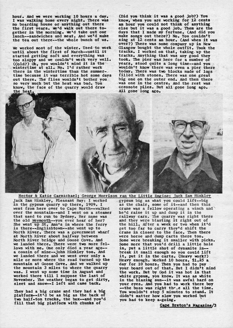 Published by Ronald Caplan on 1976/12/1 (380 reads)hour. And we were working 10 hours a day, I was walking home every night • There was no boarding house or anything out there the first years. Wie'd walk out there to? gether in the morning. Wfe'd take out our lunch • sandwiches and meat. And we'd make the tea out there • the vdiole bunch of us. We worked most of the winter. Used to work until about the first of March • until it started getting soft and everything was too sloppy and we couldn't work very well. (Cold?) Oh, you wouldn't mind it in the wintertime at all. No. I'd rather work there in the wintertime than the summer? time because it was terrible hot some days out there. The flies wouldn't bother you so very much but the heat was bad. You know, the face of the quarry would draw the he%t (Did you think it was a good job?) You know, when you are working for 12 cents an hour you could not think of anything else but it was a good job. Them are the days that I made ray fortune. (And did you make songs out there?) No. You couldn't sing at 12 cents an hour. (And when it was over?) There was some company up in New Glasgow bought the whole outfit. Took the tracks. I worked on that, taking up the tracks. Anything that was any good they took. The pier was here for a number of years, stood quite a long time • and you wouldn't know there was even a pier there today. There was two blocks made of logs filled with stones. There was one great big one on the outer end. And then there was one in the centre. And the rest was creosote piles. But all gone long ago. All gone long agOo Hector & Katie Carmichael; George Morrison ran the Little Engine; Jack Sam Hinkley Jack Sam Hinkley, Pleasant Bay: I worked in the gypsum quarry up there, 1909. I went from here over to Cape North • walked over the mountain • and I went on a steamer that used to run to Sydney. Her name was the old Weymouth • you ever hear of her? She went up St. Ann's in where the ferry is there • Englishtown • she went up to North River. There was a government wharf at North River about halfway between North River bridge and Goose Cove. And we landed there. There were two more fel? lows with me. One only died a year ago • a cousin of mine • John Hinkley too. And we landed there and we went over only a mile or more where the road turned up the mountain at Goose Cove. And we walked up the mountain 3 miles to t diere the quarry was. I went up some time in August and worked there till I suppose the last of November. Ihe weather began to get dirty, sleet and snow • I left and came back* They had a big crane and they had a big platform • it'd be as big as the back of two half-ton trucks, the box • and you'd fill that big platform with chunks of gypsum big as what you could lift • big as the chair, some of it • and then this crane was a fellow operating a winch and' he'd raise it up and dump it in the railway cars. The quarry was right there and they were blasting it right out of the hill. After a week or two when it'd get too far to carry they'd shift the crane in closer to the face. Then there were horse and dump carts there too. Some were breaking it smaller with picks. Some more that you'd drill a little hole in, put a little shot of dynamite in? break it small enough so you could lift it, put it in the carts. (Heavy work?) Heavy enough. Worked 10 hours. $1.25 a day for 10 hours. Then you had to pay your board out of that. But I didn't mind the work. But by God it was hot in that white gypstira, you know. It was as vdiite in the blazing sun • it was awful hard on your eyes. And you had to work there boy • the boss was right th'''-.e all the time. You wouldn't stop 5 minutes to stand. It didn't matter how slow you worked but you had to keep a-going. Cape Breton's Magazine/3