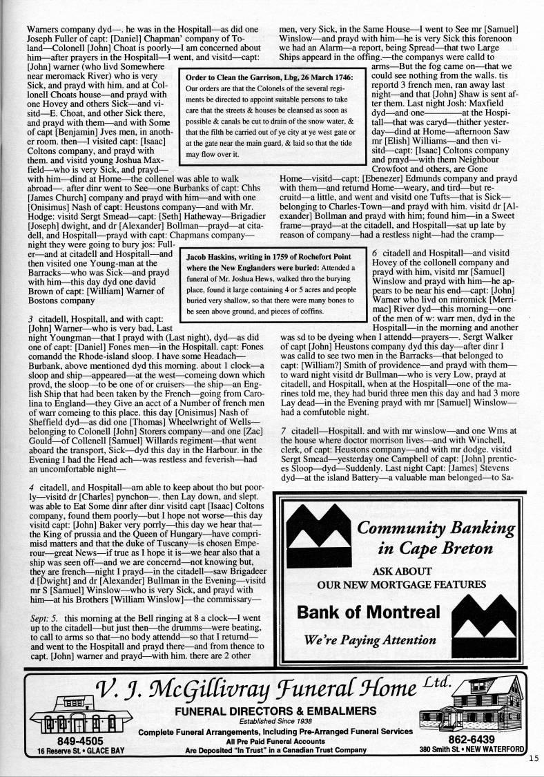 Wamers company dyd • . he was in the Hospitall • as did one Joseph Fuller of capt: [Daniel] Chapman' company of To- land • Colonell [John] Choat is poorly • I am concerned about him • after prayers in the Hospitall • 1 went, and visitd • capt: [John] wamer (who livd Somewhere near meromack River) who is very Sick, and prayd with him. and at Col- lonell Cheats house • and prayd with one Hovey and others Sick • and vi? sitd • E. ('hoat, and other Sick there, and prayd with them • and with Some of capt [Benjamin] Jves men, in anoth? er room, then • I visited capt: [Isaac] Coltons company, and prayd with them, and visitd young Joshua Max- field • who is very Sick, and prayd • with him • dind at Home • the coUenel was able to walk abroad • . after dinr went to See • one Burbanks of capt: Chhs [James Church] company and prayd with him • and with one [Onisimus] Nash of capt: Heustons company • and with Mr. Hodge: visitd Sergt Smead • capt: [Seth] Hatheway • Brigadier [Joseph] dwight, and dr [Alexander] Bollman • prayd • at cita? dell, and Hospitall • prayd with capt: Chapmans company • night they were going to bury jos: Full? er • and at citadell and Hospitall • and then visited one Young-man at the Barracks • who was Sick • and prayd with him • 'this day dyd one david Brown of capt: [William] Wamer of Bostons company Order to Clean the Garrison, Lbg, 26 March 1746: Our orders are that the Colonels of the several regi? ments be directed to appoint suitable persons to take care that the streets & houses be cleansed as soon as possible & canals be cut to drain of the snow water, & that the filth be carried out of ye city at ye west gate or at the gate near the main guard, & laid so that the tide may flow over it. men, very Sick, in the Same House • I went to See mr [Samuel] Winslow • and prayd with him • he is very Sick this forenoon we had an Alarm • a report, being Spread • that two Large Ships appeard in the offing. • the companys were calld to arms • But the fog came on • that we could see nothing from the walls, tis reportd 3 french men, ran away last night • and that [John] Shaw is sent af? ter them. Last night Josh: Maxfield dyd • and one at the Hospi? tall • 'that was caryd • thither yester? day • dind at Home • aftemoon Saw mr [Elish] Williams • and then vi? sitd • capt: [Isaac] Coltons company and prayd • with them Neighbour Crowfoot and others, are Gone Home • visitd • capt: [Ebenezer] Edmunds company and prayd with them • and retumd Home • 'weary, and tird • 'but re- cruitd • a little, and went and visitd one Tufts • that is Sick • belonging to Charles-Town • and prayd with him. visitd dr [Al? exander] Bollman and prayd with him; found him • in a Sweet frame • prayd • at the citadell, and Hospitall • sat up late by reason of company • had a restless night • had the cramp • 3 citadell, Hospitall, and with capt: [John] Warner • who is very bad. Last night Youngman • that I prayd with (Last night), dyd • as did one of capt: [Daniel] Fones men • in the Hospitall. capt: Fones comandd the Rhode-island sloop. I have some Headach • Burbank, above mentioned dyd this moming. about 1 clock • a sloop and ship • appeared • at the west • comeing down which provd, the sloop • to be one of or cruisers • the ship • an Eng? lish Ship that had been taken by the French • going from Caro? lina to England • 'they Give an acct of a Number of french men of warr comeing to this place, this day [Onisimus] Nash of Sheffield dyd • as did one [Thomas] Wheelwright of Wells • belonging to Colonell [John] Storers company • and one [Zac] Gould • of Collenell [Samuel] Willards regiment • that went aboard the transport. Sick • dyd this day in the Harbour, in the Evening I had the Head ach • was restless and feverish • had an uncomfortable night • 4 citadell, and Hospitall • am able to keep about tho but poor? ly • visitd dr [Charles] pynchon • . then Lay down, and slept, was able to Eat Some dinr after dinr visitd capt [Isaac] Coltons company, found them poorly • 'but I hope not worse • this day visitd capt: [John] Baker very porrly • 'this day we hear that • the King of prussia and the C'ueen of Hungary • have compri- misd matters and that the duke of Tuscany • 'is chosen Empe- rour • great News • if true as I hope it is • we hear also that a ship was seen off • and we are concemd • not knowing but, they are french • night I prayd • in the citadell • saw Brigadeer d [Dwight] and dr [Alexander] Bullman in the Evening • visitd mr S [Samuel] Winslow • who is very Sick, and prayd with him • at his Brothers [WilUam Winslow] • 'the commissary • Sept: 5. this moming at the Bell ringing at 8 a clock • I went up to the citadell • 'but just then • the drumms • were beating, to call to arms so that • no body attendd • so that I retumd • and went to the Hospitall and prayd there • and from thence to capt. [John] wamer and prayd • with him. there are 2 other Jacob Haskins, writing in 1759 of Rochefort Point where the New Englanders were buried: Attended a funeral of Mr. Joshua Hews, walked thro the burying place, found it large containing 4 or 5 acres and people buried very shallow, so that there were many bones to be seen above ground, and pieces of coffins. 6 citadell and Hospitall • and visitd Hovey of the collenell company and prayd with him, visitd mr [Samuel] Winslow and prayd with him • he ap? pears to be near his end • capt: [John] Wamer who livd on miromick [Merri- mac] River dyd • 'this moming • one of the men of w: warr men, dyd in the Hospitall • in the moming and another was sd to be dyeing when 1 attendd • prayers • . Sergt Walker of capt [John] Heustons company dyd this day • after dinr I was calld to see two men in the Barracks • 'that belonged to capt: [William?]