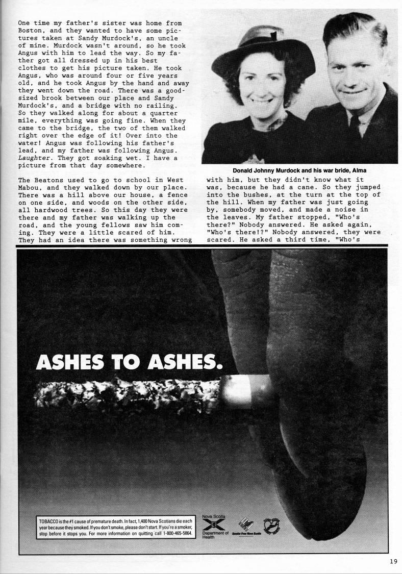 One time my father's sister was home from Boston, and they wanted to have some pic? tures taken at Sandy Murdock's, an uncle of mine. Murdock wasn't around, so he took Angus with him to lead the way. So my fa? ther got all dressed up in his best clothes to get his picture taken. He took Angus, who was around four or five years old, and he took Angus by the hand and away they went down the road. There was a good- sized brook between our place and Sandy Murdock's, and a bridge with no railing. So they walked along for about a quarter mile, everything was going fine. When they came to the bridge, the two of them walked right over the edge of it! Over into the water! Angus was following his father's lead, and my father was following Angus. Laughter. They got soaking wet. I have a picture from that day somewhere. The Beatons used to go to school in West Mabou, and they walked down by our place. There was a hill above our house, a fence on one side, and woods on the other side, all hardwood trees. So this day they were there and my father was walking up the road, and the young fellows saw him com? ing. They were a little scared of him. They had an idea there was something wrong Donald Johnny Murdocl( and his war bride, Alma with him, but they didn't know what it was, because he had a cane. So they jumped into the bushes, at the turn at the top of the hill. When my father was just going by, somebody moved, and made a noise in the leaves. My father stopped, "Who's there?" Nobody answered. He asked again, "Who's there!?" Nobody answered, they were scared. He asked a third time, "Who's ASHES TO ASHES. TOBACCO IS the '] cause of prertiature death In fact, 1,400 Nova Scotians d.u each year because they snfiol