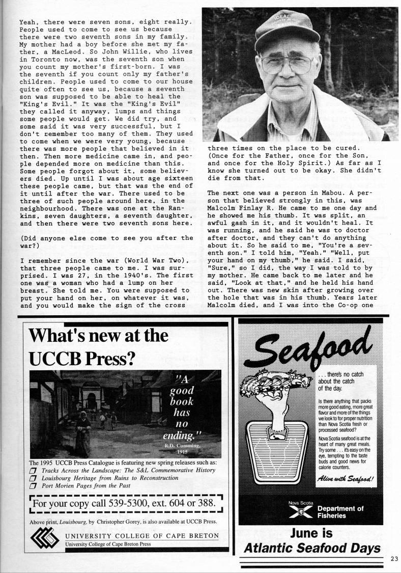 Yeah, there were seven sons, eight really. People used to come to see us because there were two seventh sons in my family. My mother had a boy before she met my fa? ther, a MacLeod. So John Willie, who lives in Toronto now, was the seventh son when you count my mother's first-born. I was the seventh if you count only my father's children. People used to come to our house quite often to see us. because a seventh son was supposed to be able to heal the "King's Evil." It was the "King's Evil" they called it anyway, lumps and things some people would get. We did try. and some said it was very successful, but I don't remember too many of them. They used to come when we were very young, because there was more people that believed in it then. Then more medicine came in. and peo? ple depended more on medicine than this. Some people forgot about it. some believ? ers died. Up until I was about age sixteen these people came, but that was the end of it until after the war. There used to be three of such people around here, in the neighbourhood. There was one at the Ran- kins, seven daughters, a seventh daughter, and then there were two seventh sons here. (Did anyone else come to see you after the war?) I remember since the war (World War Two), that three people came to me. I was sur? prised. I was 27, in the 1940's. The first one was a woman who had a lump on her breast. She told me. You were supposed to put your hand on her. on whatever it was, and you would make the sign of the cross three times on the place to be cured. (Once for the Father, once for the Son. and once for the Holy Spirit.) As far as I know she turned out to be okay. She didn't die from that. The next one was a person in Mabou. A per? son that believed strongly in this, was Malcolm Finlay R. He came to me one day and he showed me his thumb. It was split, an awful gash in it. and it wouldn't heal. It was running, and he said he was to doctor after doctor, and they can't do anything about it. So he said to me. "You're a sev? enth son." I told him. "Yeah." "Well, put your hand on my thumb," he said. I said, "Sure," so I did. the way I was told to by my mother. He came back to me later and he said, "Look at that," and he held his hand out. There was new skin after growing over the hole that was in his thumb. Years later Malcolm died, and I was into the Co-op one What's new at the UCCB Press? The 1995 UCCB Press Catalogue is featuring new spring releases such as: [J Tracks Across the Landscape: The S&L; Commemorative History CJ Louisbourg Heritage from Ruins to Reconstruction ' Port Morien Pages from the Past 'pory" ur" opy""!!" 9 J37)a' "sss! "* Above print, Louisbourg, by Christopher Gorey, is also available at UCCB Press. UNIVERSITY COLLEGE OF CAPE BRETON University College of Cape Breton Press .S'hM there's no catch June is Atlantic Seafood Days
