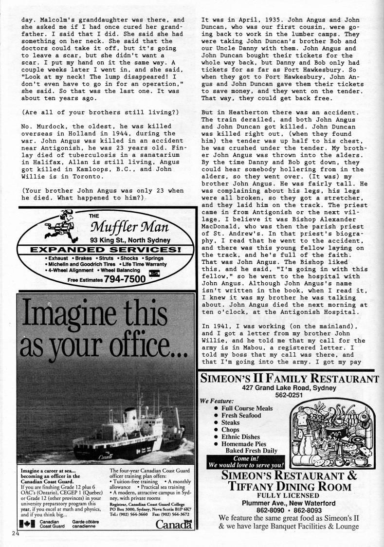 day. Malcolm's granddaughter was there, and she asked me if I had once cured her grand? father. I said that I did. She said she had something on her neck. She said that the doctors could take it off. but it's going to leave a scar, but she didn't want a scar. I put my hand on it the same way. A couple weeks later I went in. and she said. "Look at my neck! The lump disappeared! I don't even have to go in for an operation." she said. So that was the last one. It was about ten years ago. (Are all of your brothers still living?) No. Murdock. the oldest, he was killed overseas in Holland in 1944. during the war. John Angus was killed in an accident near Antigonish. he was 23 years old. Fin? lay died of tuberculosis in a sanatarium in Halifax. Allan is still living, Angus got killed in Kamloops, B.C., and John Willie is in Toronto. (Your brother John Angus was only 23 when he died. What happened to him?) Muffler Man 93 King St., North Sydney EXPANDED 3ERVIOES! • Exhaust 'Brakes 'Struts • Shocks • Springs • Michelln and Goodrich Tires • Ufe Time Warranty • 4-Wheel Alignment • Wheel Balancing • • 8 Estimates 794-7500' Imagine this as pur office... Imagine a career at sea... becoming an officer in die Canadian Coast Guard. If you are finshing Grade 12 plus 6 OAC's (Ontario), CEGEP 1 (Quebec) or Grade 12 (other provinces) in your university preparatory program this year, if you excel at math and physics, and if you think big... The four-year Canadian Coast Guard officer training plan offers: • Tuition-free training • A monthly allowance • Practical sea training • A modern, attractive campus in Syd? ney, with private rooms Regbtiar, Canadian Coast Guard College PO Box 3000, Sydney, Nova ScotU BIP 6K7 Tel.: (902) 564-3660 Fax: (902) 564-3672 ?? I Canacffii It was in April, 1935. John Angus and John Duncan, who was our first cousin, were go? ing back to work in the lumber camps. They were taking John Duncan's brother Bob and our Uncle Danny with them. John Angus and John Duncan bought their tickets for the whole way back, but Danny and Bob only had tickets for as far as Port Hawkesbury. So when they got to Port Hawkesbury, John An? gus and John Duncan gave them their tickets to save money, and they went on the tender. That way. they could get back free. But in Heatherton there was an accident. The train derailed, and both John Angus and John Duncan got killed. John Duncan was killed right out. (when they found him) the tender was up half to his chest, he was crushed under the tender. My broth? er John Angus was thrown into the alders. By the time Danny and Bob got down, they could hear somebody hollering from in the alders, so they went over. (It was) my brother John Angus. He was fairly tall. He was complaining about his legs, his legs were all broken, so they got a stretcher, and they laid him on the track. The priest came in from Antigonish or the next vil? lage, I believe it was Bishop Alexander MacDonald, who was then the parish priest of St. Andrew's. In that priest's biogra? phy, I read that he went to the accident, and there was this young fellow laying on the track, and he's full of the faith. That was John Angus. The Bishop liked this, and he said. "I'm going in with this fellow," so he went to the hospital with John Angus. Although John Angus's name isn't written in the book, when I read it. I knew it was my brother he was talking about. John Angus died the next morning at ten o'clock, at the Antigonish Hospital. In 1941, I was working (on the mainland), and I got a letter from my brother John Willie, and he told me that my call for the army is in Mabou. a registered letter. I told my boss that my call was there, and that I'm going into the army. I got my pay SIMEON'S II Family Restaurant 427 Grand Lake Road, Sydney 562-0251 We Feature: • Full Course Meals • Fresh Seafood • Steaks • Chops • Ethnic Dishes • Homemade Pies Baked Fresh Daily Come in! I We would love to serve you! SIMEON'S Restaurant & Tiffany Dining Room FULLY LICENSED Plummer Ave., New Waterford 862-8090 • 862-8093 We feature the same great food as Simeon's II & we have large Banquet Facilities & Lounge