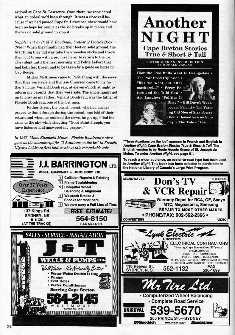arrived at Cape St. Lawrence. Once there, we considered what an ordeal we'd been through. It was a close call be? cause if we had passed Cape St. Lawrence, there would have been no hope for rescue as the ice breaks up in pieces and there's no solid ground to stop it. Supplement by Paul V. Boudreau, brother of Placide Bou? dreau: When they finally had their feet on solid groimd, the first thing they did was take their wooden sticks and throw them out to sea with a promise never to retum to the ice. They slept luitil the next moming and Polite LeFort that had both feet frozen had to be taken by a guide on horse to Cap Rouge. Michel McKinnon came to Petit Etang with the news that they were safe and Eucisse Chiasson came to my fa? ther's home, Venant Boudreau, at eleven o'clock at night to inform my parents that they were safe. The whole family got up to pray as my father, Venant Boudreau, was the father of Placide Boudreau, one of the lost men. Father Giroir, the parish priest, who had always prayed to Saint Joseph during the ordeal, was told of their retum and when he received the news, he got up, lifted his arms to the sky while shouting: "Good Saint Joseph, you have listened and answered my prayers!" In 1973, Mme. Elizabeth Muise • Placide Boudreau's niece • gave us the manuscript for "3 Acadians on the Ice" in French; Ulysses LeLievre first told us about this remarkable tale. = = JJ. BARRINGTON ltd 'B'pne' 137 Kings Rd. SYDNEY, NS B1S2Z5 (AT THE TRACKS) WHEEL AUONMENT & AUTO BODY LTD. Ri Collision Repairs & Painting rn Frame straightening Pfl Computer Wheel Balancing & Alignment [' We stock Brakes & Shocks for most cars [T| We now carry a Full Line of Tires FREE E/TUWATE/ 564-8150 SALES ?? SERVICE ?? INSTALLATION J??"P WELLS e PUMPS "D. %//lf/at' - /ts jVata'ai' Better'' • Water WeUs: DriUed & Dug' • Pumps • Test Holes • Water Conditioners Serving Cape Breton S642I45 O U N T (Ucence No. 264) "Three Acadians on the Ice" appears in French and English In Another Night: Cape Breton Stories True & Short & Tall. The English version Is by Rosie Aucoin Grace of St. Joseph du Molne. To order Another Night, see page 61. To reach a wider audience, an easier-to-read type has been used in Another Night. This book has been selected to participate In the National Library of Canada's Large Print Program. MICROWAVES Don's TV & VCR Repair q Warranty Depot for RCA, GE, Sanyo MTC, Magnasonic, Samsung REPAIR TO MOST OTHER MAKES ' PHONE/FAX: 902-562-2366 • CONVERTERS ' LIMITED 110 Reeves St. SYDNEY, N. S. .' ELECTRICAL CONTRACTORS p "Serving Cape Breton Over 35 Years" SPECIALIZING IN: • INDUSTRIAL • COMMERCIAL - INSTITUTIONAL - RESIDENTIAL WIRING CONTRACTORS • MAINTENANCE SERVICE ELECTRIC HEATING SYSTEMS • FREE ESTIMATES 562-1132 FAX 526-1699 TfCilixe JLtd. • Computerized Wheel Balancing ''''' • Complete Road Service IJSSL 539-5670 '''' 265 PRINCE ST. • SYDNEY gFGoodrich brunswick-
