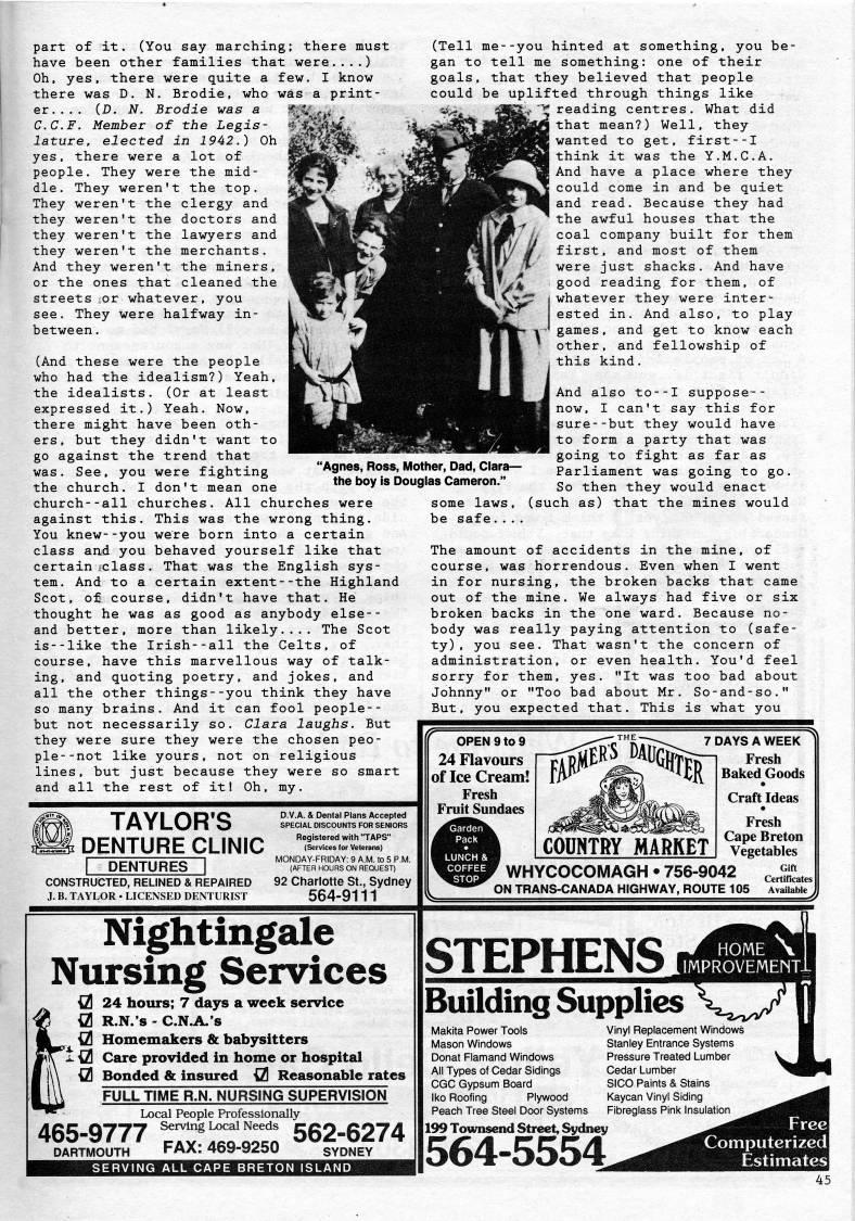 Published by Ronald Caplan on 1995/6/1 (268 reads)part of it. (You say marching; there must have been other families that were....) Oh, yes, there were quite a few. I know there was D. N. Brodie, who was a print? er.... (D. N. Brodie was a ''''.td C.C.F. Member of the Legis- 4*:'|tr' lature, elected in 1942.) Oh yes, there were a lot of people. They were the mid? dle. They weren't the top. They weren't the clergy and they weren't the doctors and they weren't the lawyers and they weren't the merchants. And they weren't the miners, or the ones that cleaned the streets ror whatever, you see. They were halfway in- between. (And these were the people who had the idealism?) Yeah, the idealists. (Or at least expressed it.) Yeah. Now, there might have been oth? ers, but they didn't want to go against the trend that was. See, you were fighting the church. I don't mean one church--all churches. All churches were against this. This was the wrong thing. You knew--you were born into a certain class and you behaved yourself like that certain fclass. That was the English sys? tem. And to a certain extent--the Highland Scot, of course, didn't have that. He thought he was as good as anybody else-- and better, more than likely.... The Scot is--like the Irish--all the Celts, of course, have this marvellous way of talk? ing, and quoting poetry, and jokes, and all the other things--you think they have so many brains. And it can fool people-- but not necessarily so. Clara laughs. But they were sure they were the chosen peo? ple- -not like yours, not on religious lines, but just because they were so smart and all the rest of it! Oh, my. 'Agnes, Ross, Mother, Dad, Clara • the boy Is Douglas Cameron." (Tell me--you hinted at something, you be? gan to tell me something: one of their goals, that they believed that people could be uplifted through things like reading centres. What did that mean?) Well, they wanted to get, first--I think it was the Y.M.C.A. And have a place where they could come in and be quiet and read. Because they had the awful houses that the coal company built for them first, and most of them were just shacks. And have good reading for them, of whatever they were inter" ested in. And also, to play games, and get to know each other, and fellowship of this kind. And also to--I suppose-- now, I can't say this for sure--but they would have to form a party that was going to fight as far as Parliament was going to go. So then they would enact some laws, (such as) that the mines would be safe.... The amount of accidents in the mine, of course, was horrendous. Even when I went in for nursing, the broken backs that came out of the mine. We always had five or six broken backs in the one ward. Because no? body was really paying attention to (safe? ty) , you see. That wasn't the concern of administration, or even health. You'd feel sorry for them, yes. "It was too bad about Johnny" or "Too bad about Mr. So-and-so." But, you expected that. This is what you ' TAYLOR'S ' DENTURE CLINIC I DENTURES 1 CONSTRUCTED, RELINED & REPAIRED J. B. TAYLOR • LICENSED DENTURIST D.V.A. & Dental Plans Accepted SPECIAL DISCOUNTS FOR SENIORS Registered with "TAPS" (Services for Veterans) MONDAY-FRIDAY: 9 A.M. to 5 P.M. (AFTER HOURS ON REQUEST) 92 Charlotte St., Sydney 564-9111 OPEN 9 to 9 24 Flavours of Ice Cream! Fresh Fruit Sundaes 7 DAYS A WEEK Fresh Baked Goods WHYCOCOMAGH • 756-9042 ON TRANS-CANADA HIGHWAY, ROUTE 105 Gift Certificates I Available J| Nightingale Nursing Services {21 24 hours; 7 days a week service {2 R.N.'s - C.N.A.'s {21 Homemakers & babysitters X {21 Care provided in home or hospital {21 Bonded & insured {21 Reasonable rates FULL TIME R.N. NURSING SUPERVISION Local People Professionally 465-9777 '.'T'ai'''o 562-6274 DARTMOUTH PAX: 469-9250 SYDNEY SERVING ALL CAPE BRETON ISLAND Building Supplies ,,' Makita Power Tools Mason Windows Donat Flamand Windows All Types of Cedar Sidings CGC Gypsum Board Iko Roofing Plywood Peach Tree Steel Door Systems Vinyl Replacement Windows Stanley Entrance Systems Pressure Treated Lumber Cedar Lumber SICO Paints & Stains Kaycan Vinyl Siding Fibreglass Pink Insulation 199 Townsend Street, Sydney 564-5554 45