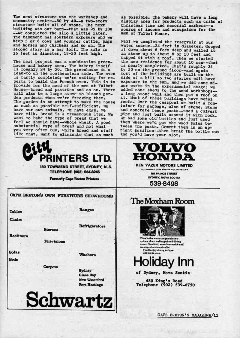 Published by Ronald Caplan on 1976/12/1 (368 reads)The next structure was the workshop and community centre • 80 by 40 • a two-story structure built all of stone. The next building was our barn • that was 25 by 100 • we completed the silo a little later. The basement has southern exposure and we keep 5 or 6 cows and younger cattle, pigs and horses and chickens and so on. The second story is a hay loft. The silo is 16 feet in diameter, 18-20 feet high. The next project was a combination green? house and bakery area. The bakery itself is roughly 24 by 50. The greenhouse is a lean-to on the southeastern side. Ihe oven is partly completed; we're waiting for ex? perts to build the French oven. This is to provide for the need of the men at Talbot House • bread and pastries and so on. There will also be a large stove to blanch gar? den products when we're freezing them. The garden is an attempt to make the house as much as possible self-sufficient. We have our own animals, iite have eggs. We have milk. Bread is a tremendous item. We want to bake the type of bread that we feel we should have • whole wheat. A good substantial type of bread and not what you very often buy, white bread and stuff like that. Want to eliminate that as much as possible. The bakery will have a long display area for products such as cribs at Christmas time and memorial markers • a source of income and occupation for the men of Talbot House. Next we completed the reservoir at our water source • 24 feet in diameter. Gouged it down about 6 feet deep and walled it in stone up to about 8 or 10 feet and capped it with a roof. Then we started the new residence for about 10 men • that is nearly completed. That's roughly 34 by 50 on the ground floor • and again most of the buildings are built on the side of a hill so two stories will have exposure to the sun. And we did some mi? nor works in the experimental stage: we added some sheds to the wood workshops • a long stone wall and then put a roof on it. Most of these buildings have metal roofs. Over the cesspool we built a con? tainer for garbage, also of stone. Stone and concrete fence posts • used a culvert pipe and just built around it with rock. We had some old bottles and just used them where we'd put the wood poles be? tween the posts. Cement them in an up? right position • then break the bottle out and you'd have your slot. W PmNTERS LTa 180 tOyW' • NO STREET, SYDNEXM.S. TELEPHONE (902) S64.8245 Formeily Cape Bret?n Pirinten CAPE BRETON)3 OWN FURNITUBE SHOWRbOMS Tables '"'?' Chairs Refrigerators stereos Recliners Televisions So'*? Washers Beds Carpets GlAce Bay New Waterford Port Hastings Schwartz KEN YAZER MOTORS LIMITED AUTHOniZEO CATC BHETON VOLVO DCALEM 161 raiNCE STREET SYDNEY. NOVA SCOTIA 539-8498 The Moxham Rdom Din. in the warm congenial atmo- sphere of our weU-appointaddininf ' room. Fine food, attentive tervice and a comprehensive wine list. You'll enjoy dining with uir Call on u? toon. Holiday Inn of Sydney, Nova Scotia 480 King's Road Telephone (902) 539-6750 CAPE BRETON'S MAGAZINE/ll