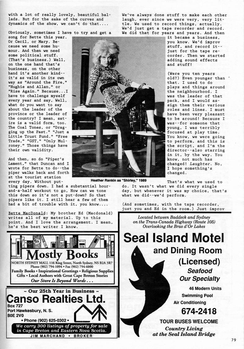 with a lot of really lovely, beautiful bal? lads . But for the sake of the curves and dynamics of the show, we can't do that..,. Obviously, sometimes I have to try and get a song for Bette this year. Or Cecil, or Mary. Be? cause we need some hu? mour. And then we need some political stuff. (That's business.) Well, on the one hand that's business, on the other hand it's another kind-- it's as valid in its own way as "Around the Fire," "Hughie and Allan," or "Rise Again." Because...I have to challenge myself every year and say. Well, what do you want to say about the leader of the province or the leader of the country? I mean, sat? ire is a valid form, too. The Coal Tones, or "Drag? ging up the Past." "Just a Little Trust Fund." "Free Trade." "GST," "Only Mul- roney." Those things have their own validity. And then, so do "Piper's Lament," that Duncan and I wrote for Bette to do--the piper walks back and forth at the tourist station every day. Without put- Heather Rankin ting pipers down. I had a substantial hour- and-a-half workout to go. How can we tone this down so it's not a put-down? So that pipers like it. I still hear a few of them had a bit of trouble with it, you know.,,. Bette MacDonald: My brother Ed (Macdonald) writes all of my material. Up to this point. And I love the arrangement. I mean, he's the best writer I know. We've always done stuff to make each other laugh, ever since we were very, very lit? tle. We used to record things, actually. We'd just get a tape recorder and record. We did that for years and years. And then it became a business, you know. We'd improv stuff, and record it-- just for the tape re? corder. Then we started adding sound effects and stuff! (Were you ten years old?) Even younger than ' that, I used to do plays and things around the neighbourhood. I was the leader of that pack, and I would as? sign them their various roles and lines, I must have been very pleasant to be around! Because I was--for someone that young, I was terribly focused at play time. You know, we were going to perform, and this is the script, and I'm the director--also starring in it, by the way. You know, not much has changed! Laughter. No, I hope something's changed, as "Shirley," 1989 That's what we used to do. It wasn't what we did every single day, but whenever it was my choice, that's what we did--we'd perform, (And sometimes, with the tape recorder, just you and Ed in the room,) Just improv Mostly Books NORTH SYDNEY MALL 116 King Street, North Sydney, NS B2A 3R7 Phone (902) 794-1094 • Fax (902) 794-6000 Family Books • Inspirational Greetings • Religious Supplies Gifts • Local Authors with Great Cape Breton Stories Our Store Is Beyond Words.. . ~ Our 25th Year in Business ~ Canso Realties Ltd. Box 727 Port Hawkesbury, N. S. BOE 2V0 > Phone (902) 625-0302 * (' We carry 300 listings of property for sale in Cape Breton and Eastem Nova Scotia. JIM MARCHAND ?? BROKER Located between Baddeck and Sydney on the Trans-Canada Highway (Route 105) Overlooking the Bras d'Or Lakes Seal Island Motel A and Dining Room ''L' (Licensed) 'HJJV' TOUR V Coi at the Si Seafood Our Specialty 46 Modern Units Swimming Pool Air Conditioning 674-2418 TOUR BUSES WELCOME Country Living at the Seal Island Bridge 79