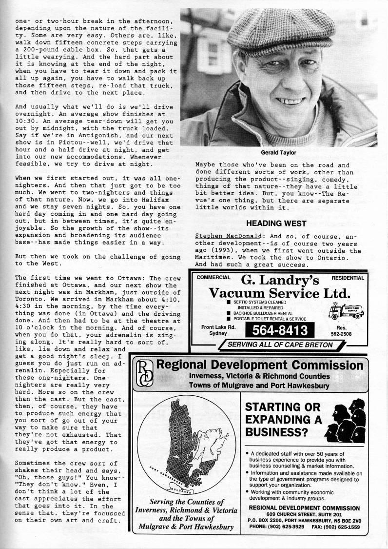 one- or two-hour break in the afternoon, depending upon the nature of the facili? ty. Some are very easy. Others are, like, walk down fifteen concrete steps carrying a 200-pound cable box. So, that gets a little wearying. And the hard part about it is knowing at the end of the night, when you have to tear it down and pack it all up again, you have to walk back up those fifteen steps, re-load that truck, and then drive to the next place. And usually what we'll do is we'll drive overnight. An average show finishes at 10:30. An average tear-down will get you out by midnight, with the truck loaded. Say if we're in Antigonish, and our next show is in Pictou--well, we'd drive that hour and a half drive at night, and get into our new accommodations. Whenever feasible, we try to drive at night. When we first started out, it was all one- nighters. And then that just got to be too much. We went to two-nighters and things of that nature. Now, we go into Halifax and we stay seven nights. So, you have one hard day coming in and one hard day going out, but in between times, it's quite en? joyable. So the growth of the show--its expansion and broadening its audience base--has made things easier in a way. But then we took on the challenge of going to the West. The first time we went to Ottawa: The crew finished at Ottawa, and our next show the next night was in Markham, just outside of Toronto. We arrived in Markham about 4:10, 4:30 in the morning, by the time every? thing was done (in Ottawa) and the driving done. And then had to be at the theatre at 10 o'clock in the morning. And of course, when you do that, your adrenalin is zing? ing along. It's really hard to sort of, like, lie down and relax and get a good night's sleep. I guess you do just run on ad? renalin. Especially for these one-nighters, One- nighters are really very hard. More so on the crew than the cast. But the cast, then, of course, they have to produce such energy that you sort of go out of your way to make sure that they're not exhausted. That they've got that energy to really produce a product. Sometimes the crew sort of shakes their head and says, "Oh, those guys!" You know-- "They don't know." Even, I don't think a lot of the cast appreciates the effort that goes into it. In the sense that, they're focussed on their own art and craft. .1 Gerald Taylor Maybe those who've been on the road and done different sorts of work, other than producing the product--singing, comedy, things of that nature--they have a little bit better idea. But, you know--The Re? vue's one thing, but there are separate little worlds within it. HEADING WEST Stephen MacDonald: And so, of course, an? other development--is of course two years ago (1993), when we first went outside the Maritimes. We took the show to Ontario. And had such a great success. COMMERCIAL RESIDENTIAL G. Landry's Vacuum Service Ltd. ?? SEPTIC SYSTEMS CLEANED INSTALLED & REPAIRED ?? BACKHOE BULLDOZER RENTAL ?? PORTABLE TOILET RENTAL & SERVICE Front Lake Rd. Sydney 564-8413 ?? / SERVING ALL OF CAPE BRETON jf' Regional Development Commission Inverness' Vfciorfa & Richmond Counties Towns of IVIulgrave and Port Hawkesbury Serving the Counties of Inverness, Richmond & Victoria and the Towns of Mulgrave & Port Hawkesbury STARTING OR EXPANDING A BUSINESS? • A dedicated staff with over 50 years of business experience to provide you with business counselling & market information. • Information and assistance made available on the type of government programs designed to support your organization. • Working with community economic development & industry groups. REGIONAL DEVELOPMENT COMMISSION 609 CHURCH STREET, SUITE 201 P.O. BOX 2200, PORT HAWKESBURY, NS BOE 2V0 PHONE: (902) 625-3929 FAX: (902) 625-1559