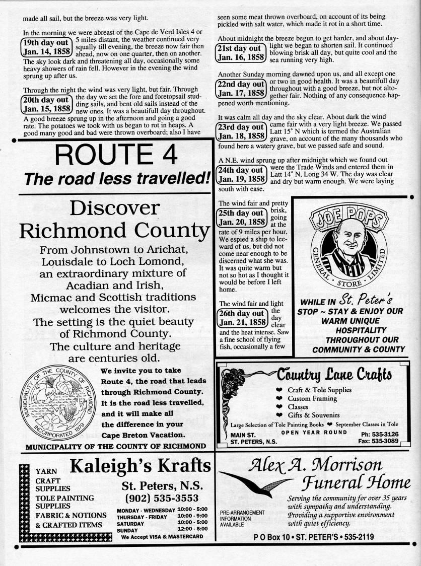 Published by Ronald Caplan on 1995/8/1 (276 reads)made all sail, but the breeze was very light. In the morning we were abreast of the Cape de Verd Isles 4 or 5 miles distant, the weather continued very squally till evening, the breeze now fair then ahead, now on one quarter, then on another. 19th day out Jan. 14,1858J The sky look dark and threatening all day, occasionally some heavy showers of rain fell. However in the evening the wind sprung up after us. Through the night the wind was very light, but fair. Through 20th dav Out" ''' ''' '' ''' ''' '''' ''' foretopsail stud- I T 1'18'81 '''' sails, and bent old sails instead of the 'an. 15, losoj jjg' ones. It was a beautifull day throughout. A good breeze sprung up in the afternoon and going a good rate. The potatoes we took with us began to rot in heaps. A good many good and bad were thrown overboard; also I have ROUTE 4 The road less travelled! Discover Richmond County From Johnstown to Arichat, Lpuisdale to Loch Lomond, an extraordinary mixture of Acadian and Irish, Micmac and Scottish traditions welcomes the visitor. The setting is the quiet beauty of Richmond County. The culture and heritage are centuries old. We invite you to take Route 4, the road that leads through Richmond County. It is the road less travelled, and it will make all the difference in your Cape Breton Vacation. MUNICIPALITY OF THE COUNTY OF RICHMOND seen some meat thrown overboard, on account of its being pickled with salt water, which made it rot in a short time. About midnight the breeze begun to get harder, and about day- 21st dav out ' ''''' '' began to shorten sail. It continued T 1 /; 1 H'H blowing brisk all day, but quite cool and the Jan. AQ, 155o; ''' running very high. Another Sunday morning dawned upon us, and all except one [22nd dav OUt' '' ''? '" 2??' health. It was a beautifull day T 17 18'8 th''oughout with a good breeze, but not alto- jan. A /, Ao5oJ gether fair. Nothing of any consequence hap? pened worth mentioning. It was calm all day and the sky clear. About dark the wind r23rd dav out' ''"'' '''' '''' ' '''' '''ht breeze. We passed Jan. 18,1858J Latt 15? N which is termed the Australian grave, on account of the many thousands who found here a watery grave, but we passed safe and sound. A N.E. wind sprung up after midnight which we found out 24th dav OUt' '''' ''' Trade Winds and entered them in ' I Latt 14? N, Long 34 W. The day was clear and dry but warm enough. We were laying Jan. 19,1858, south with ease. The wind fair and pretty 25th day out'i '"'''' Jan. 20,1858 gomg the rate of 9 miles per hour. We espied a ship to lee? ward of us, but did not come near enough to be discerned what she was. It was quite warm but not so hot as I thought it would be before I left home. The wind fair and light the day clear 26th day out Jan.21,1858j and the heat intense. Saw a fine school of flying fish, occasionally a few WHILE IN St. PUe'f'S STOP ~ STAY & ENJOY OUR WARM UNIQUE HOSPITALITY THROUGHOUT OUR COMMUNITY & COUNTY mdfui JCoHe C'b ' Craft & Tole Supplies ' Custom Framing ' Classes ' Gifts & Souvenirs ' Large Selection of Tole Painting Books ' September Classes in Tole I MAIN ST. , ST. PETERS, N.S. OPEN YEAR ROUND Ph: 535'126 Fax: 53S3089 r Kaleigh's Krafts YARN CRAFT SUPPLIES TOLE PAINTING SUPPLIES FABRIC & NOTIONS & CRAFTED ITEMS HiHHgiiHiiJgB St. Peters, N.S. (902) 535-3553 MONDAY - WEDNESDAY 10:00 - 5:00 THURSDAY - FRIDAY 10:00 - 9:00 SATURDAY 10:00 - 5:00 SUNDAY 12:00 - 5:00 We Accept VISA & MASTERCARD PRE-ARRANGEMENT INFORMATION AVAILABLE Me7('Si. Morrison JumraiHomt Serving the, comtttunity for over 35 years with sympatliy and understanding. Providing a supportive environment with quiet efficiency. P 0 Box 10 • ST. PETER'S • 535-2119