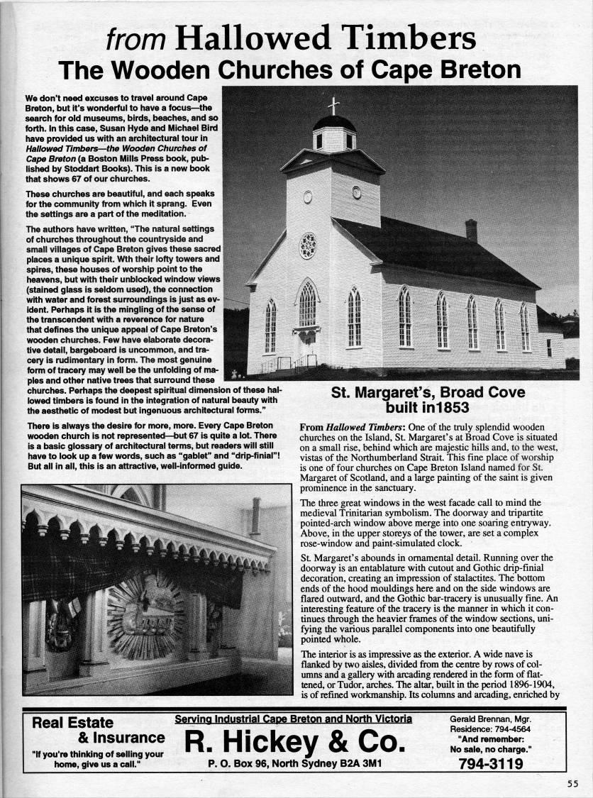 from Hallowed Timbers The Wooden Churches of Cape Breton We don't need excuses to travel around Cape Breton, but it's wonderful to have a focus • the search for old museums, birds, beaches, and so forth. In this case, Susan Hyde and Michael Bird have provided us with an architectural tour in Hallowed Timbers • the Wooden Churches of Cape Breton (a Boston Mills Press book, pub? lished by Stoddart Books). This is a new book that shows 67 of our churches. These churches are beautiful, and each speaks for the community from which it sprang. Even the settings are a part of the meditation. The authors have written, "The natural settings of churches throughout the countryside and small villages of Cape Breton gives these sacred places a unique spirit. Wth their lofty towers and spires, these houses of worship point to the heavens, but with their unblocked window views (stained glass is seldom used), the connection with water and forest surroundings is just as ev? ident. Perhaps it is the mingling of the sense of the transcendent with a reverence for nature that defines the unique appeal of Cape Breton's wooden churches. Few have elaborate decora? tive detail, bargeboard is uncommon, and tra? cery is rudimentary in form. The most genuine form of tracery may well be the unfolding of ma? ples and other native trees that surround these churches. Perhaps the deepest spiritual dimension of these hal? lowed timbers is found in the integration of natural beauty with the aesthetic of modest but ingenuous architectural forms." There is always the desire for more, more. Every Cape Breton wooden church is not represented • but 67 is quite a lot. There is a basic glossary of architectural terms, but readers will still have to look up a few words, such as "gablet" and "drip-finiai"! But all in all, this is an attractive, well-informed guide. St. Margaret's, Broad Cove built in1853 From Hallowed Timbers: One of the truly splendid wooden churches on the Island, St. Margaret's at Broad Cove is situated on a small rise, behind which are majestic hills and, to the west, vistas of the Northumberland Strait. This fine place of worship is one of four churches on Cape Breton Island named for St. Margaret of Scodand, and a large painting of the saint is given prominence in the sanctuary. The three great windows in the west facade call to mind the medieval Trinitarian symbolism. The doorway and tripartite pointed-arch window above merge into one soaring entryway. Above, in the upper storeys of the tower, are set a complex rose-window and paint-simulated clock. St. Margaret's abounds in ornamental detail. Running over the doorway is an entablature with cutout and Gothic drip-fmial decoration, creating an impression of stalactites. The bottom ends of the hood mouldings here and on the side windows are flared outward, and the Gothic bar-tracery is unusually fine. An interesting feature of the tracery is the manner in which it con? tinues through the heavier frames of the window sections, uni? fying the various parallel components into one beautifully pointed whole. The interior is as impressive as the exterior. A wide nave is flanked by two aisles, divided from the centre by rows of col? umns and a gallery with arcading rendered in the form of flat? tened, or Tudor, arches. The altar, built in die period 1896-1904, is of refined workmanship. Its columns and arcading, enriched by Real Estate & Insurance "If you're thinking of selling your home, give us a call." Serving Industrial Cape Breton and North Victoria R. Hickey & Co. p. O. Box 96, North Sydney B2A 3M1 Gerald Brennan, Mgr. Residence: 794-4564 "And remember: No sale, no charge." 794-3119 55