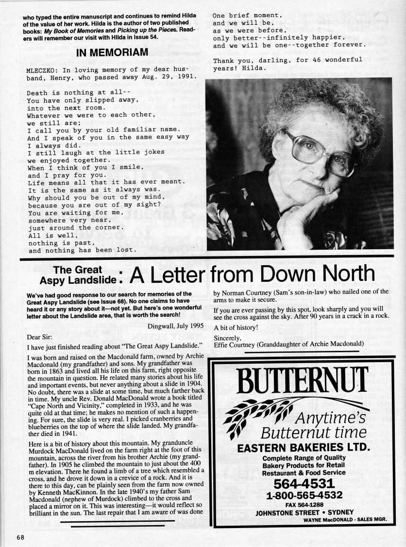 who typed the entire manuscript and continues to remind Hilda of the value of her work. Hilda is the author of two published books: My Book of Memories and Picking up the Pieces. Read? ers will remember our visit with Hilda in Issue 54. IN MEMORIAM MLECZKO: In loving memory of my dear hus? band, Henry, who passed away Aug. 29, 1991. Death is nothing at all-- You have only slipped away, into the next room. Whatever we were to each other, we still are: I call you by your old familiar name. And I speak of you in the same easy way I always did. I still laugh at the little jokes we enjoyed together. When I think of you I smile, and I pray for you. Life means all that it has ever meant. It is the same as it always was. Why should you be out of my mind, because you are out of my sight? You are waiting for me, somewhere very near, just around the corner. All is well, nothing is past, and nothing has been lost. One brief moment, and we will be, as we were before, only better--infinitely happier, and we will be one--together forever. Thank you, darling, years! Hilda. for 46 wonderful The Great Aspy Landslide. A Letter from Down North We've had good response to our search for memories of the Great Aspy Landslide (see Issue 68). No one claims to have heard it or any story about it • not yet. But here's one wonderful letter about the Landslide area, that is worth the search! by Norman Courtney (Sam's son-in-law) who nailed one of the arms to make it secure. If you are ever passing by this spot, look sharply and you will see the cross against the sky. After 90 years in a crack in a rock. Dingwall, July 1995 ' bit of history! Dear Sir: I have just finished reading about "The Great Aspy Landslide." I was bom and raised on the Macdonald farm, owned by Archie Macdonald (my grandfather) and sons. My grandfather was bom in 1863 and lived all his life on this farm, right opposite the mountain in question. He related many stories about his life and important events, but never anything about a slide in 1904. No doubt, there was a slide at some time, but much farther back in time. My uncle Rev. Donald MacDonald wrote a book titled "Cape North and Vicinity," completed in 1933, and he was quite old at that time; he makes no mention of such a happen? ing. For sure, the slide is very real. I picked cranberries and blueberries on the top of where the shde landed. My grandfa? ther died in 1941. Here is a bit of history about this mountain. My granduncle Murdock MacDonald lived on the farm right at the foot of this mountain, across the river from his brother Archie (my grand? father). In 1905 he climbed the mountain to just about the 400 m elevation. There he found a limb of a tree which resembled a cross, and he drove it down in a crevice of a rock. And it is there to this day, can be plainly seen from the farm now owned by Kenneth MacKinnon. In the late 1940's my father Sam Macdonald (nephew of Murdock) climbed to the cross and placed a mirror on it. This was interesting • it would reflect so brilliant in the sun. The last repair that I am aware of was done Sincerely, Effie Courtney (Granddaughter of Archie Macdonald) BIHTERNUT EASTERN BAKERIES LTD. Complete Range of Quality Bakery Products for Retail Restaurant & Food Service 564-4531 1-800-565-4532 FAX 564-1288 JOHNSTONE STREET • SYDNEY WAYNE MacDONALD - SALES MGR. 68