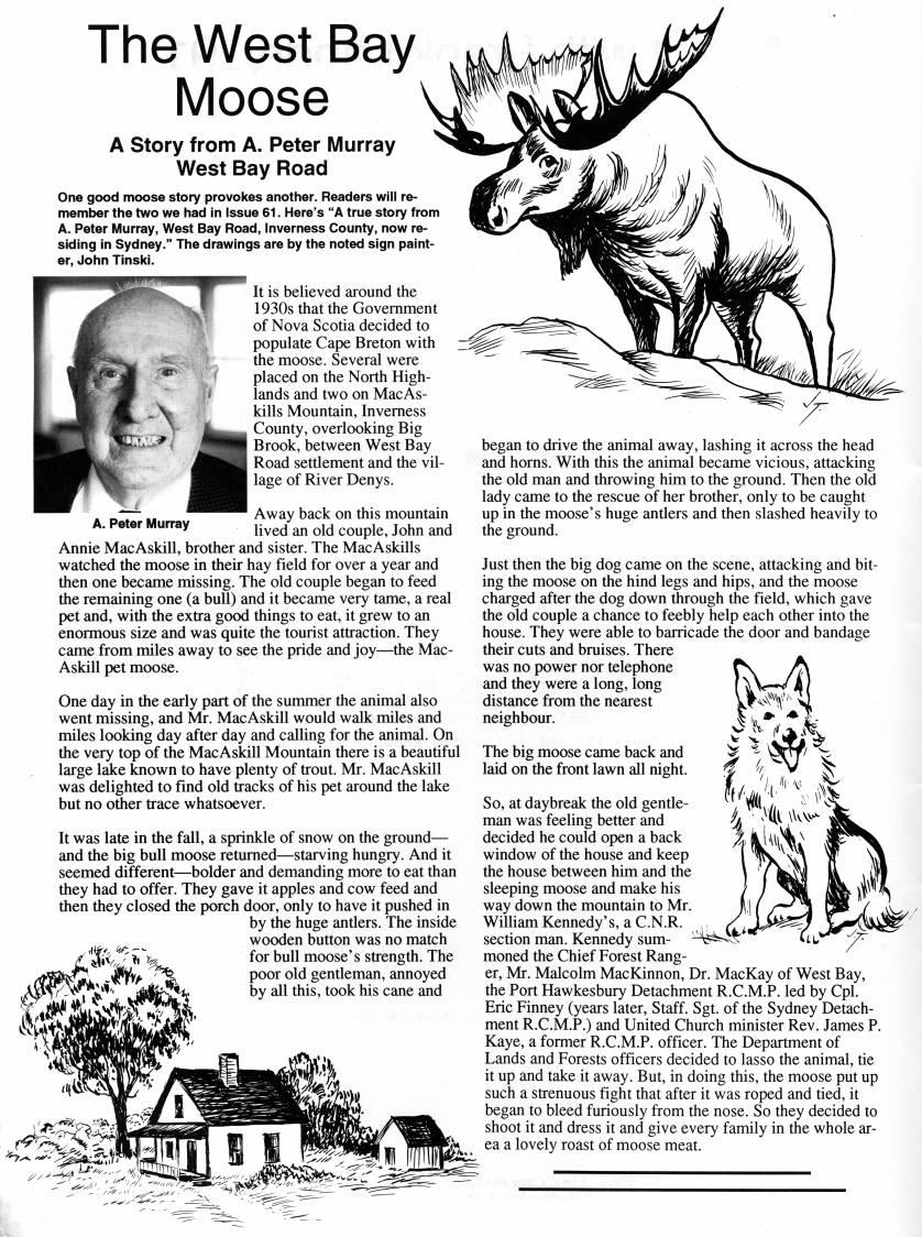 Published by Ronald Caplan on 1996/6/1 (581 reads)The West Bay Moose A Story from A, Peter Murray West Bay Road One good moose story provokes another. Readers will re? member the two we had In Issue 61. Here's "A true story from A. Peter Murray, West Bay Road, Inverness County, now re? siding in Sydney." The drawings are by the noted sign paint? er, John Tinski. A A It is believed around the 1930s that the Government of Nova Scotia decided to populate Cape Breton with the moose. Several were placed on the North High? lands and two on MacAs- kills Mountain, Inverness County, overlooking Big Brook, between West Bay Road settlement and the vil? lage of River Denys. A. Peter Murray Away back on this mountain lived an old couple, John and Annie MacAskill, brother and sister. The MacAskills watched the moose in their hay field for over a year and then one became missing. The old couple began to feed the remaining one (a bull) and it became very tame, a real pet and, with the extra good things to eat, it grew to an enormous size and was quite the tourist attraction. They came from miles away to see the pride and joy • the Mac? Askill pet moose. One day in the early part of the summer the animal also went missing, and Mr. MacAskill would walk miles and miles looking day after day and calling for the animal. On the very top of the MacAskill Mountain there is a beautiful large lake known to have plenty of trout. Mr. MacAskill was delighted to find old tracks of his pet around the lake but no other trace whatsoever. It was late in the fall, a sprinkle of snow on the ground • and the big bull moose returned • starving hungry. And it seemed different • bolder and demanding more to eat than they had to offer. They gave it apples and cow feed and then they closed the porch door, only to have it pushed in by the huge antlers. The inside wooden button was no match ''!'' ' ''"' ''' '"'' moose's strength. The ' ' ~'V '' P*''' ''' gentleman, annoyed " "'' *' by all this, took his cane and began to drive the animal away, lashing it across the head and horns. With this the animal became vicious, attacking the old man and throwing him to the ground. Then the old lady came to the rescue of her brother, only to be caught up in the moose's huge antlers and then slashed heavily to the ground. Just then the big dog came on the scene, attacking and bit? ing the moose on the hind legs and hips, and the moose charged after the dog down through the field, which gave the old couple a chance to feebly help each other into the house. They were able to barricade the door and bandage their cuts and bruises. There was no power nor telephone and they were a long, long distance from the nearest neighbour. The big moose came back and laid on the front lawn all night. So, at daybreak the old gentle? man was feeling better and decided he could open a back window of the house and keep the house between him and the sleeping moose and make his way down the mountain to Mr. William Kennedy's, a C.N.R. , , section man. Kennedy sum- '%'' moned the Chief Forest Rang? er, Mr. Malcolm MacKinnon, Dr. MacKay of West Bay, the Port Hawkesbury Detachment R.C.M.P. led by Cpl. Eric Finney (years later. Staff. Sgt. of the Sydney Detach? ment R.C.M.P.) and United Church minister Rev. James P. Kaye, a former R.C.M.P. officer. The Department of Lands and Forests officers decided to lasso the animal, tie it up and take it away. But, in doing this, the moose put up such a strenuous fight that after it was roped and tied, it began to bleed furiously from the nose. So they decided to shoot it and dress it and give every family in the whole ar? ea a lovely roast of moose meat.
