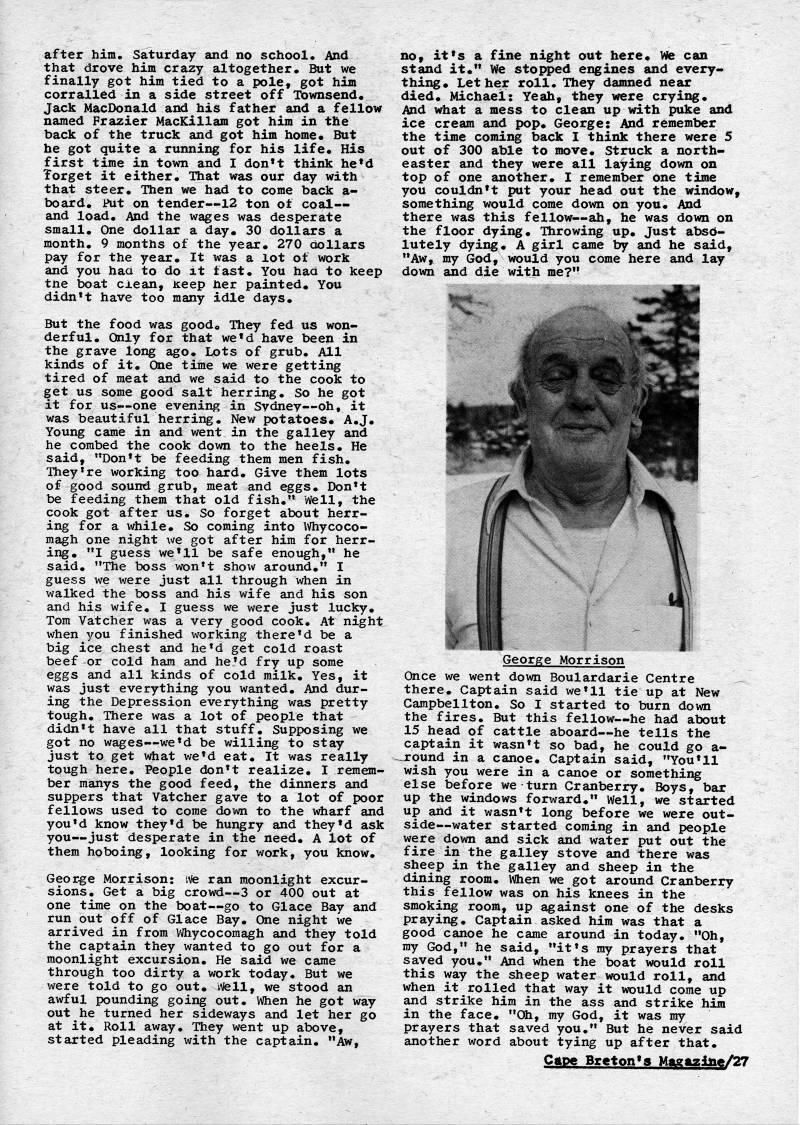 Published by Ronald Caplan on 1976/12/1 (344 reads)after him. Saturday and no school. And that drove him crazy altogether. But we finally got him tied to a pole, got him corralled in a side street off Townsend. Jack MacDonald and his father and a fellow named Frazier MacKillam got him in the back of the truck and got him home. But he got quite a running for his life. His first time in town and I don't think he'd forget it either. That was our day with that steer. Then we had to come back a- board. Put on tender • 12 ton of coal • and load. And the wages was desperate small. One dollar a day. 30 dollars a month. 9 months of the year. 270 dollars pay for the year. It was a lot of work and you had to do it fast. You had to keep tne boat cxean. Keep her painted. You didn't have too many idle days. But the food was good. They fed us won? derful. Only for that we'd have been in the grave long ago. Lots of grub. All kinds of it. One time we were getting tired of meat and we said to the cook to get us some good salt herring. So he got it for us • one evening in Sydney • oh, it was beautiful herring. New potatoes. A.J. Young came in and went in the galley and he combed the cook down to the heels. He said, "Don't be feeding them men fish. They're working too hard. Give them lots of good sound grub, meat and eggs. Don't be feeding them that old fish." Well, the cook got after us. So forget about herr? ing for a while. So coming into Whycoco? magh one night we got after him for herr? ing, "I guess we'll be safe enough," he said. "The boss won't show around." I guess we were just all through when in walked the boss and his wife and his son and his wife. I guess we were just lucky. Tom Vatcher was a very good cook. At night when you finished working there'd be a big ice chest and he'd get cold roast beef or cold ham and he'd fry up some eggs and all kinds of cold milk. Yes, it was just everything you wanted. And dur? ing the Depression everything was pretty tough. There was a lot of people that didn't have all that stuff. Supposing we got no wages • we'd be willing to stay just to get what we'd eat. It was really tough here. People don't realize. I remem? ber manys the good feed, the dinners and suppers that Vatcher gave to a lot of poor fellows used to come down to the wharf and you'd know they'd be hungry and they'd ask you • just desperate in the need. A lot of them hoboing, looking for work, you know. George Morrison; ive ran moonlight excur? sions. Get a big crowd • 3 or 400 out at one time on the boat • go to Glace Bay and run out off of Glace Bay. One night we arrived in from Whycocomagh and they told the captain they wanted to go out for a moonlight excursion. He said we came through too dirty a work today. But we were told to go out. iiiell, we stood an awful pounding going out. When he got way out he turned her sideways and let her go at it. Roll away. They went up above, started pleading with the captain. "Aw, no, it's a fine night out here. We can stand it." We stopped engines and every? thing. Let her roll. They damned near died. Michael: Yeah, they were crying. And what a mess to clean up with puke and ice cream and pop. George: And remember the time coming back I think there were 5 out of 300 able to move. Struck a north? easter and they were all laying down on top of one another. I remember one time you couldn't put your head out the window, something would come down on you. And there was this fellow • ah, he was down on the floor dying. Throwing up. Just abso? lutely dying. A girl came by and he said, "Aw, my God, would you come here and lay down and die with me?" George Morrison Once we went down Boulardarie Centre there. Captain said we'll tie up at New Campbellton. So I started to burn down the fires. But this fellow • he had about 15 head of cattle aboard • he tells the captain it wasn't so bad, he could go a- _round in a canoe. Captain said, "You'll wish you were in a canoe or something else before we turn Cranberry. Boys, bar up the windows forward." Well, we started up and it wasn't long before we were out? side • water started coming in and people were down and sick and water put out the fire in the galley stove and there was sheep in the galley and sheep in the dining room. When we got around Cranberry this fellow was on his knees in the smoking room, up against one of the desks praying. Captain asked him was that a good canoe he came around in today. "Oh, my God," he said, "it's my prayers that saved you." And when the boat would roll this way the sheep water would roll, and when it rolled that way it would come up and strike him in the ass and strike him in the face. "Oh, my God, it was my prayers that saved you." But he never said another word about tying up after that. Ciipe Breton's Mag>ziiie/27
