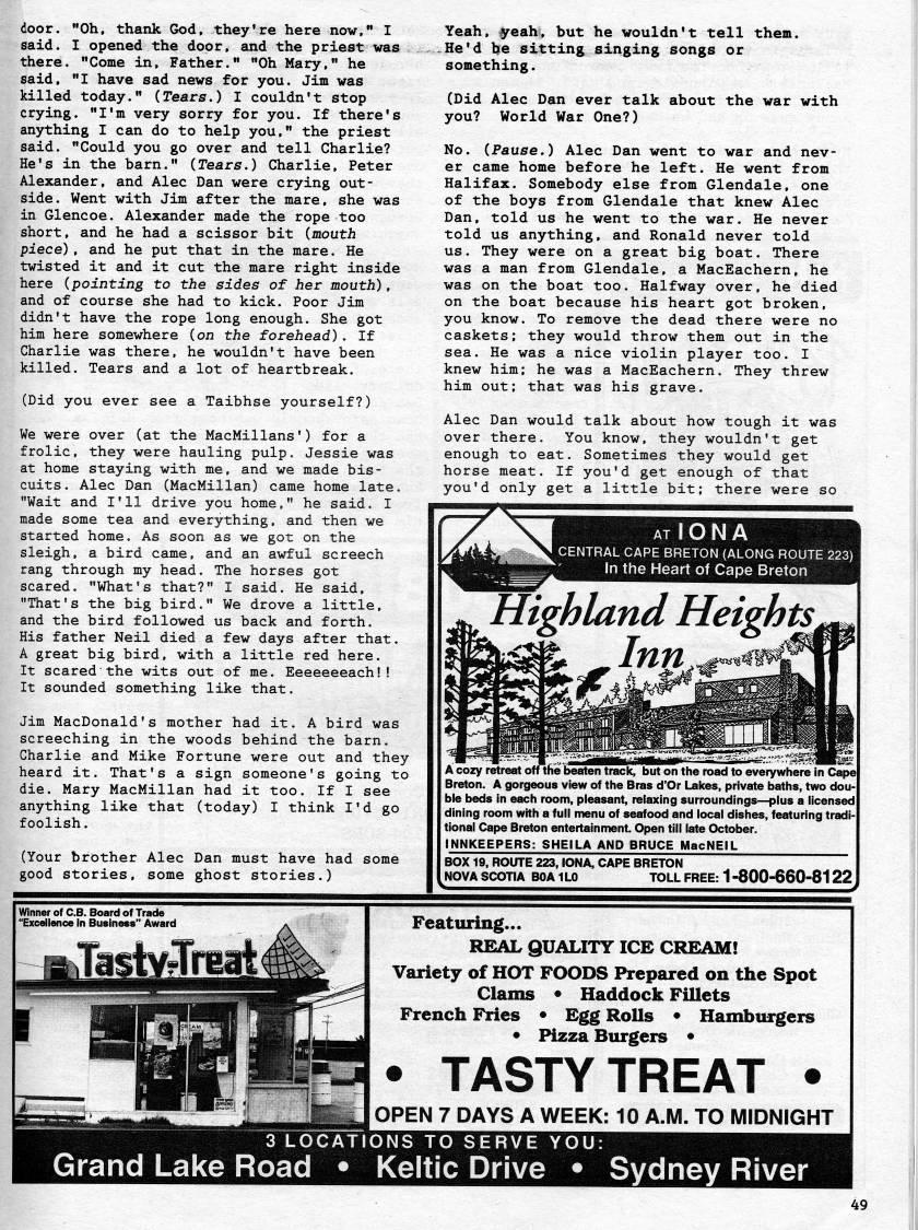Published by Ronald Caplan on 1996/6/1 (172 reads)door. "Oh, thank God, they're here now," I said. I opened the door, and the priest was there. "Come in. Father." "Oh Mary," he said, "I have sad news for you. Jim was killed today." (Tears.) I couldn't stop crying. "I'm very sorry for you. If there's anything I can do to help you," the priest said. "Could you go over and tell Charlie? He's in the barn." (Tears.) Charlie, Peter Alexander, and Alec Dan were crying out? side. Went with Jim after the mare, she was in Glencoe. Alexander made the rope too short, and he had a scissor bit (mouth piece), and he put that in the mare. He twisted it and it cut the mare right inside here (pointing to the sides of her mouth), and of course she had to kick. Poor Jim didn't have the rope long enough. She got him here somewhere (on the forehead). If Charlie was there, he wouldn't have been killed. Tears and a lot of heartbreak. (Did you ever see a Taibhse yourself?) We were over (at the MacMillans') for a frolic, they were hauling pulp. Jessie was at home staying with me, and we made bis? cuits. Alec Dan (MacMillan) came home late. "Wait and I'll drive you home," he said. I made some tea and everything, and then we started home. As soon as we got on the sleigh, a bird came, and an awful screech rang through my head. The horses got scared. "What's that?" I said. He said, "That's the big bird." We drove a little, and the bird followed us back and forth. His father Neil died a few days after that. A great big bird, with a little red here. It scared the wits out of me. Eeeeeeeach!! It sounded something like that. Jim MacDonald's mother had it. A bird was screeching in the woods behind the barn. Charlie and Mike Fortune were out and they heard it. That's a sign someone's going to die. Mary MacMillan had it too. If I see anything like that (today) I think I'd go foolish. (Your brother Alec Dan must have had some good stories, some ghost stories.) Yeah, 'eah, but he wouldn't tell them. He'd he sitting singing songs or something. (Did Alec Dan ever talk about the war with you? World War One?) No. (Pause.) Alec Dan went to war and nev? er came home before he left. He went from Halifax. Somebody else from Glendale, one of the boys from Glendale that knew Alec Dan, told us he went to the war. He never told us anything, and Ronald never told us. They were on a great big boat. There was a man from Glendale, a MacEachern, he was on the boat too. Halfway over, he died on the boat because his heart got broken, you know. To remove the dead there were no caskets; they would throw them out in the sea. He was a nice violin player too. I knew him; he was a MacEachern. They threw him out; that was his grave. Alec Dan would talk about how tough it was over there. You know, they wouldn't get enough to eat. Sometimes they would get horse meat. If you'd get enough of that you'd only get a little bit; there were so atIONA CENTRAL CAPE BRETON (ALONG ROUTE 223) In the Heart of Cape Breton Highland Heights. A cozy retreat off the beaten track, but on the road to everywhere in Cape Breton. A gorgeous view of the Bras d'Or Lakes, private baths, two dou? ble beds in each room, pleasant, relaxing surroundings • plus a licensed dining room with a full menu of seafood and local dishes, featuring trcKli- tional Cape Breton entertainment. Open till late October. INNKEEPERS: SHEILA AND BRUCE MacNEIL BOX 19, ROUTE 223, lONA, CAPE BRETON NOVA SCOTIA BOA 1LO TOLL FREE: 1 -800-660-8122 Peaturing... REAL gUALITY ICE CREAM! Variety of HOT FOODS Prepared on the Spot Clams • Haddock Fillets French Fries • Egg Rolls • Hamburgers • Pizza Burgers • • TASTY TREAT • OPEN 7 DAYS A WEEK: 10 A.M. TO MIDNIGHT 3 LOCATIONS TO SERVE YOU: Grand Lake Road • Keltic Drive • Sydney River 49