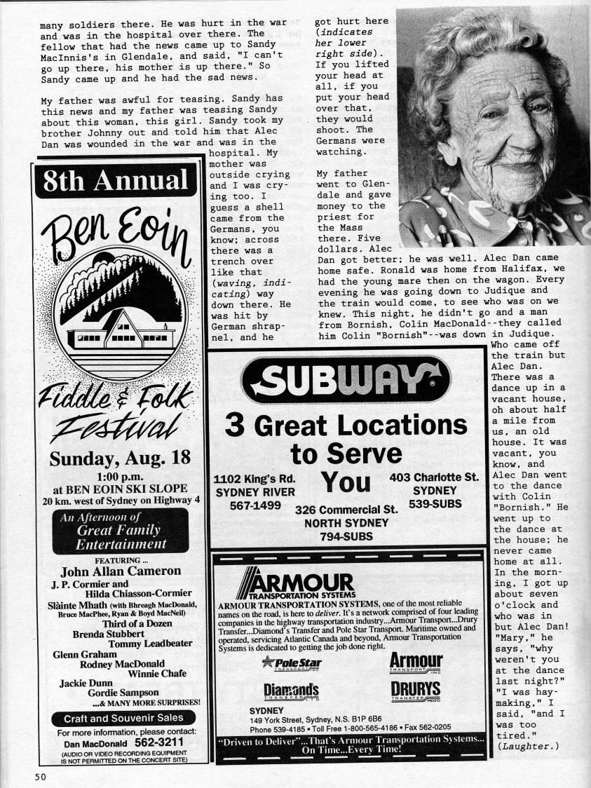 many soldiers there. He was hurt in the war and was in the hospital over there. The fellow that had the news came up to Sandy Maclnnis's in Glendale, and said, "I can't go up there, his mother is up there." So Sandy came up and he had the sad news. My father was awful for teasing. Sandy has this news and my father was teasing Sandy about this woman, this girl. Sandy took my brother Johnny out and told him that Alec Dan was wounded in the war and was in the hospital. My mother was outside crying and I was cry? ing too. I guess a shell came from the Germans, you know; across there was a trench over like that (waving, indi? cating) way down there. He was hit by German shrap? nel , and he NtiWtltl'MI flddUifUk Sunday, Aug. 18 1:00 p.in. at BEN EOIN SKI SLOPE 20 km. west of Sydney on Highway 4 An Afternoon of Great Family Entertainment FEATURING... John Allan Cameron J. p. Corinier and Hilda Chiasson-Cormier Slainte Mhath (with Bhreagh MacDonald, Bruce MacPhee, Ryan & Boyd MacNeil) Third of a Dozen Brenda Stubbert Tommy Leadbeater Glenn Graham Rodney M acE>onald Winnie Chafe Jackie Dunn Gordie Sampson ...& MANY MORE SURPRISES! Craft and Souvenir Sales For more information, please contact: Dan MacDonald 562-3211 (AUDIO OR VIDEO RECORDING EQUIPMENT IS NOT PERMPrTED ON THE CONCERT SfTE) 1102 King's Rd. SYDNEY RIVER 567-1499 iVRMOUR iPaleStar Diamonds "Driven to Deliver" got hurt here (indicatesf her lower right side). If you lifted your head at all, if you put your head over that, they would shoot. The Germans were watching. My father went to Glen? dale and gave money to the priest for the Mass there. Five dollars. Alec Dan got better; he was well. Alec Dan came home safe. Ronald was home from Halifax, we had the young mare then on the wagon. Every evening he was going down to Judique and the train would come, to see who was on we knew. This night, he didn't go and a man from Bornish, Colin MacDonald--they called him Colin "Bornish"--was down in Judique. I Who came off I the train but Alec Dan. There was a dance up in a vacant house, oh about half a mile from us, an old house. It was vacant, you know, and Alec Dan went to the dance with Colin "Bornish." He went up to the dance at the house; he never came home at all. In the morn? ing, I got up about seven o'clock and who was in but Alec Dan! "Mary," he says, "why weren't you at the dance last night?" "I was hay? making ," I said, "and I was too tired." (Laughter.) 'UB 3 Great Locations to Serve You 326 Commercial St. NORTH SYDNEY 794-SUBS 403 Ctiarlotte St. SYDNEY 539-SUBS TRANSPORTATION SYSTEMS ARMOUR TRANSPORTATION SYSTEMS, one of the most reUable names on the road, is here to deliver. It's a networic comprised of four leading companies in the highway transportation industry...Armour Transport...Drury Transfer...Diamond's Transfer and Pole Star Transport. Maritime owned and operated, servicing Atlantic Canada and beyond, Armour Transportation Systems is dedicated to getting the job done right. Armour DRURYS SYDNEY 149 York Street, Sydney, N.S. BIP 6B6 Phone 539-4185 • Toll Free 1-800-565-4186 • Fax 562-0205 On Time...Everv Time! 50