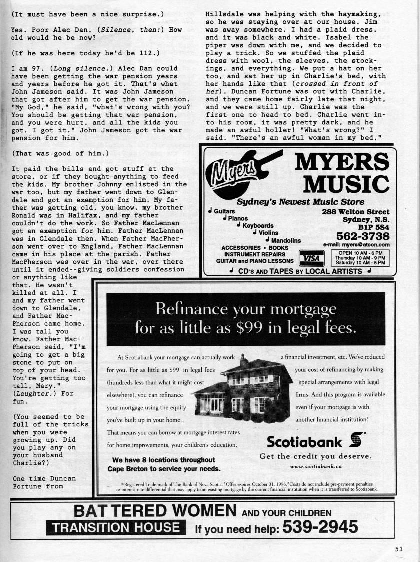 Published by Ronald Caplan on 1996/6/1 (207 reads)(It must have been a nice surprise.) Yes. Poor Alec Dan. (Silence, then:) How old would he be now? (If he was here today he'd be 112.) I am 97. (Long silence.) Alec Dan could have been getting the war pension years and years before he got it. That's what John Jameson said. It was John Jameson that got after him to get the war pension. "My God," he said, "what's wrong with you? You should be getting that war pension, and you were hurt, and all the kids you got. I got it." John Jameson got the war pension for him. (That was good of him.) It paid the bills and got stuff at the store, or if they bought anything to feed the kids. My brother Johnny enlisted in the war too, but my father went down to Glen? dale and got an exemption for him. My fa? ther was getting old, you know, my brother Ronald was in Halifax, and my father couldn't do the work. So Father MacLennan got an exemption for him. Father MacLennan was in Glendale then. When Father MacPher? son went over to England, Father MacLennan came in his place at the parish. Father MacPherson was over in the war, over there until it ended--giving soldiers confession or anything like that. He wasn't killed at all. I and my father went down to Glendale, and Father Mac? Pherson came home. I was tall you know. Father Mac? Pherson said, "I'm going to get a big stone to put on top of your head. You're getting too tall, Mary." (Laughter.) For fun. Hillsdale was helping with the haymaking, so he was staying over at our house. Jim was away somewhere. I had a plaid dress, and it was black and white. Isabel the piper was down with me, and we decided to play a trick. So we stuffed the plaid dress with wool, the sleeves, the stock? ings, and everything. We put a hat on her too, and sat her up in Charlie's bed, with her hands like that (crossed in front of her). Duncan Fortune was out with Charlie, and they came home fairly late that night, and we were still up. Charlie was the first one to head to bed. Charlie went in? to his room, it was pretty dark, and he made an awful holler! "What's wrong?" I said. "There's an awful woman in my bed," (You seemed to be full of the tricks when you were growing up. Did you play any on your husband Charlie?) One time Duncan Fortune from MYERS MUSIC Sydney's Newest Music Store ?l Guitars J Pianos ?l Keyboards W Violins ' Mandolins ACCESSORIES • BOOKS INSTRUMENT REPAIRS GUfTAR and PIANO LESSONS 288 Welton Street Sydney, N.S. B1P5S4 562-3738 e-mali: myersOatcon.com OPEN 10 AM-6 PM Thursday 10 AM-9 PM Saturday 10 AM - 5 PM ' CD'S AND TAPES BY LOCAL ARTISTS J Refinance your mortgage for as little as $99 in lesal fees. At Scotiabank your mortgage can actually for you. For as little as $99' in legal fees (hundreds less than what it might cost elsewhere), you can refinance your mortgage using the equity you've built up in your home That means you can borrow at mortgage interest rates for home improvements, your children's education. We have 8 locations throughout Cape Breton to service your needs. financial investment, etc. We've reduced your cost of refinancing by making special arrangements with legal firms. And this program is available even if your mortgage is with another financial institution! Scotiabank S Get the credit you deserve. www.scotiabank.ca * Registered Trade-mark of The Bank of Nova Scotia, * Offer expires October 31, 1996.*Costs do r interest rate differential that may apply to an existing mortgage by the current financial ii )t include pre-payment penalties 'hen it is transferred to Scotiabank. BATTERED WOMEN and your children If you need help: 539~2945 TRANSITION HOUSE