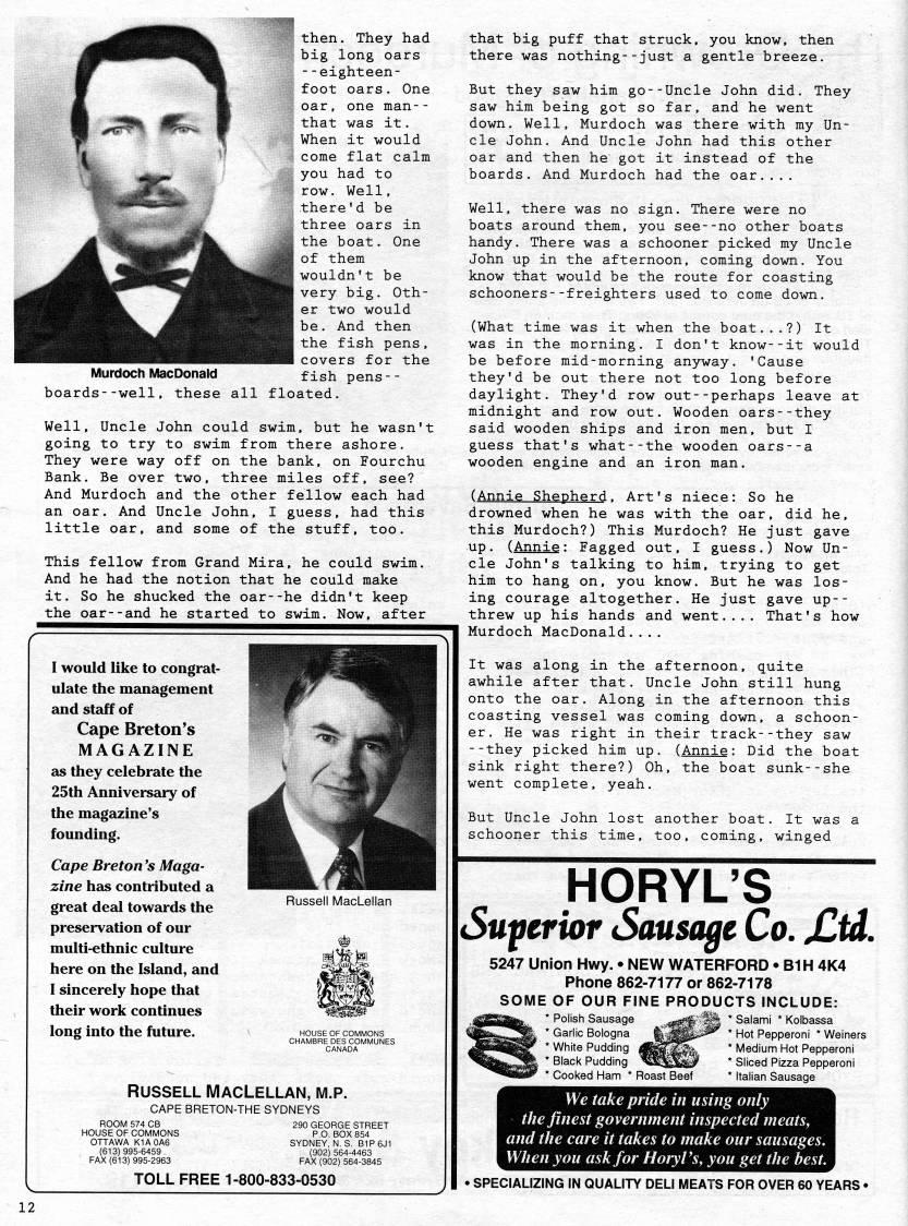 Published by Ronald Caplan on 1996/12/1 (499 reads)IVIurdoch l'cDonald then. They had big long oars --eighteen- foot oars. One oar, one man-- that was it. When it would come flat calm you had to row. Well, there'd be three oars in the boat. One of them wouldn't be very big. Oth? er two would be. And then the fish pens, covers for the fish pens-- boards--well, these all floated. Well, Uncle John could swim, but he wasn't going to try to swim from there ashore. They were way off on the bank, on Fourchu Bank. Be over two, three miles off, see? And Murdoch and the other fellow each had an oar. And Uncle John, I guess, had this little oar, and some of the stuff, too. This fellow from Grand Mira, he could swim. And he had the notion that he could make it. So he shucked the oar--he didn't keep the oar--and he started to swim. Now, after I would like to congrat? ulate the management and staff of Cape Breton's MAGAZINE as they celebrate the 25th Anniversary of the magazine's founding. Cape Breton's Maga? zine has contributed a great deal towards the preservation of our multi-ethnic culture here on the Island, and 1 sincerely hope that their work continues long into the future. J ' %'m A ''Wfm A ?? ??16 "11 ' • ? 'itfH Russell MacLellan ' s '''m HOUSE OF COMMONS CHAMBRE DES COMMUNES CANADA RUSSELL MacLellan, m.p. CAPE BRETON-THE SYDNEYS ROOM 574 CB HOUSE OF COMMONS OTTAWA K1A0A6 (613)995-6459 FAX (613) 995-2963 290 GEORGE STREET P.O. BOX 854 SYDNEY, N.S. B1P6J1 (902) 564-4463 FAX (902) 564-3845 TOLL FREE 1-800-833-0530 that big puff that struck, you know, then there was nothing--just a gentle breeze. But they saw him go--Uncle John did. They saw him being got so far, and he went down. Well, Murdoch was there with my Un? cle John. And Uncle John had this other oar and then he got it instead of the boards. And Murdoch had the oar.... Well, there was no sign. There were no boats around them, you see--no other boats handy. There was a schooner picked my Uncle John up in the afternoon, coming down. You know that would be the route for coasting schooners--freighters used to come down. (What time was it when the boat...?) It was in the morning. I don't know--it would be before mid-morning anyway. 'Cause they'd be out there not too long before daylight. They'd row out--perhaps leave at midnight and row out. Wooden oars--they said wooden ships and iron men, but I guess that's what--the wooden oars--a wooden engine and an iron man. (Annie Shepherd. Art's niece: So he drowned when he was with the oar, did he, this Murdoch?) This Murdoch? He just gave up. (Annie: Fagged out, I guess.) Now Un? cle John's talking to him, trying to get him to hang on, you know. But he was los? ing courage altogether. He just gave up-- threw up his hands and went.... That's how Murdoch MacDonald.... It was along in the afternoon, quite awhile after that. Uncle John still hung onto the oar. Along in the afternoon this coasting vessel was coming down, a schoon? er. He was right in their track--they saw --they picked him up. (Annie: Did the boat sink right there?) Oh, the boat sunk--she went complete, yeah. But Uncle John lost another boat. It was a schooner this time, too, coming, winged HORYL'S Suferior Stmsagc Co. jCtd. 5247 Union Hwy. • NEW WATERFORD • B1H 4K4 Phone 862-7177 or 862-7178 SOME OF OUR FINE PRODUCTS INCLUDE: * Polish Sausage .'i'J 'S * Salami * Kolbassa * Garlic Bologna fc'''P*-''' * ''?* Pepperoni * Weiners * White Pudding 4'p''%, * Medium Hot Pepperoni , * Black Pudding '''''y * Sliced Pizza Pepperoni * Cooked Ham * Roast Beef * Italian Sausage We take pride in using only the finest government inspected meats, and the care it takes to make our sausages. When you ask for Horyl's, you get the best. • SPECIALIZING IN QUALITY DELI IVIEATS FOR OVER 60 YEARS • 12