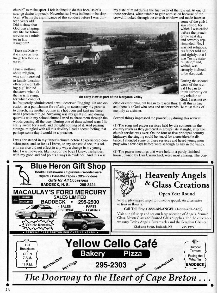 Published by Ronald Caplan on 1996/12/1 (367 reads)church" to make sport. I felt inclined to do this because of a strange desire to preach. Nevertheless I was inclined to be skep? tical. What is the significance of this conduct before I was thir? teen years old? Did it show that God was shaping my life for future service as a minis? ter in His Kingdom? "There is a Divinity that shapes our lives Rough hew them as we will." I knew nothing about religion, was not interested in family worship, often played "kill? ing pig" behind the stove when fa? ther was praying, for which conduct he frequently administered a well deserved flogging. On one oc? casion, as a punishment for refusing to accompany my parents to church, my mother put me in a hot oven and kept me there until I promised to go. Swearing was my great sin, and during quarrels with my school chums I used to chase them through the woods cursing all the way. During one of these school wars I lit? erally swore for a mile and thought nothing of it. And passing strange, mingled with all this deviltry I had a secret feeling that perhaps some day I would be a preacher. I was christened in my father's church before I experienced con? sciousness, and so far as I knew, or any one could see, this sol? emn service did not effect in any way a change in my young life. I was, however, like most of the boys I knew, irreligious, with my good and bad points always in evidence. And this was An early view of part of the Margaree Valley my state of mind during the first week of the revival. At one of those services, when unable to gain admission because of the crowd, I looked through the church window and made faces at some of the girls I saw inside, for which I was called before the preach? er the next day and severely rep? rimanded. No, I was not religious. As father told me, and rightly, that I was "in my natu? ral state," and, withal, was strongly inclined to be skeptical. During the second week of the revi? val I began to think earnestly on my relation to God. I was not ex? cited or emotional, but began to reason thus: If all this is true and there is a God who sees and understands He must think of me only as a sinner. Several things impressed me powerfully during this revival: (1) The song and prayer services held by the converts on the country roads as they gathered in groups late at night, after the church service was over. On the four or five principal country highways the singing could be heard for a considerable dis? tance. I attended some of these services and heard young men pray who a few days before were as tough as any in the valley. (2) The prayer meetings that were held in a partly finished house, owned by Dan Carmichael, were most stirring. The con- ' Blue Heron Gift Shop p"V Books • Glassware • Figurines • Woodenware V' Crystal • Cassette Tapes • CD's • Videos |0 Gifts for All Occasions -*'' BADDECK, N. S. 295-3424 MACAULAY'S FORD MERCURY SALES LIMITED BADDECK • 295-2500 - SALES - PARTS SERVICE LEASING